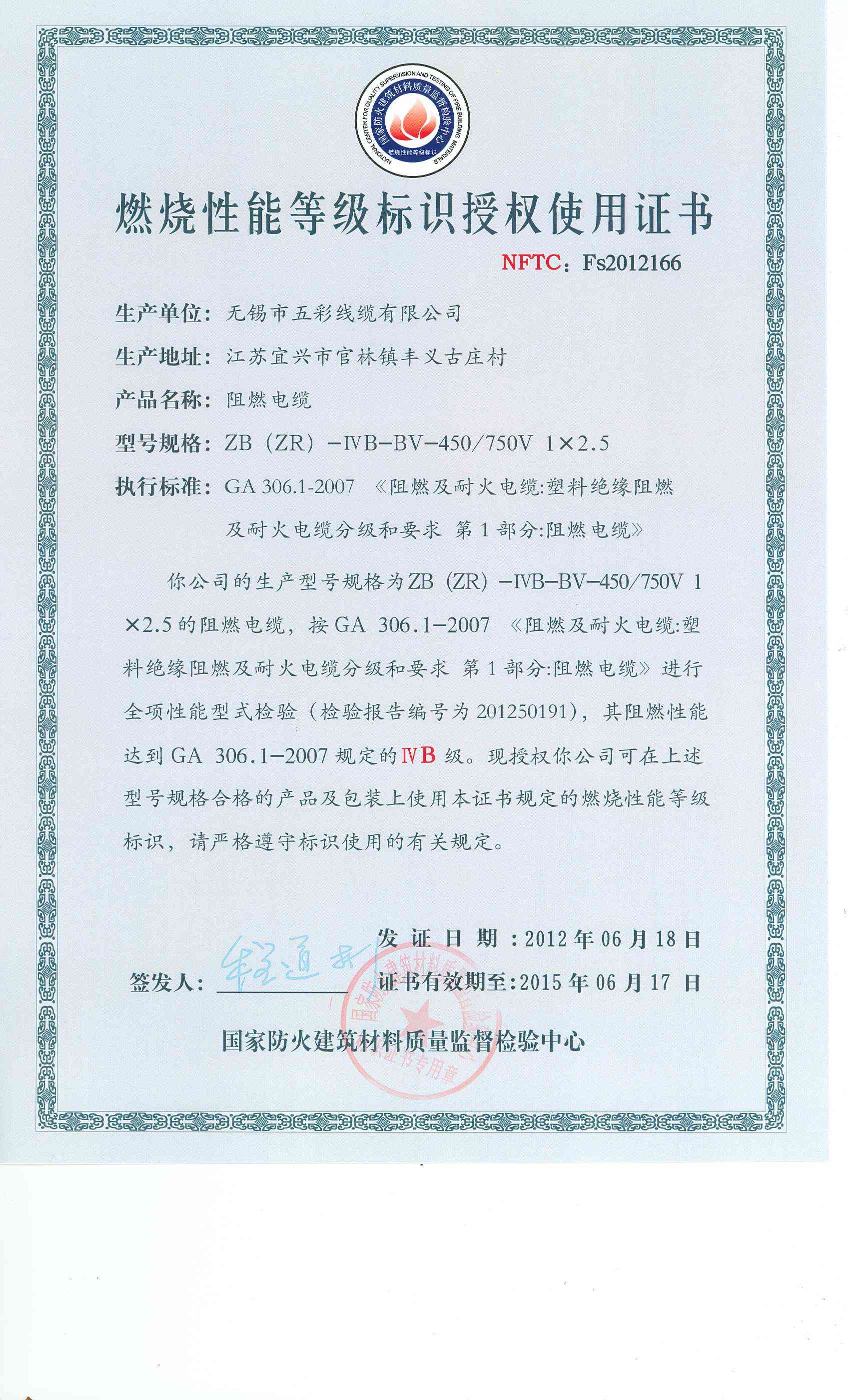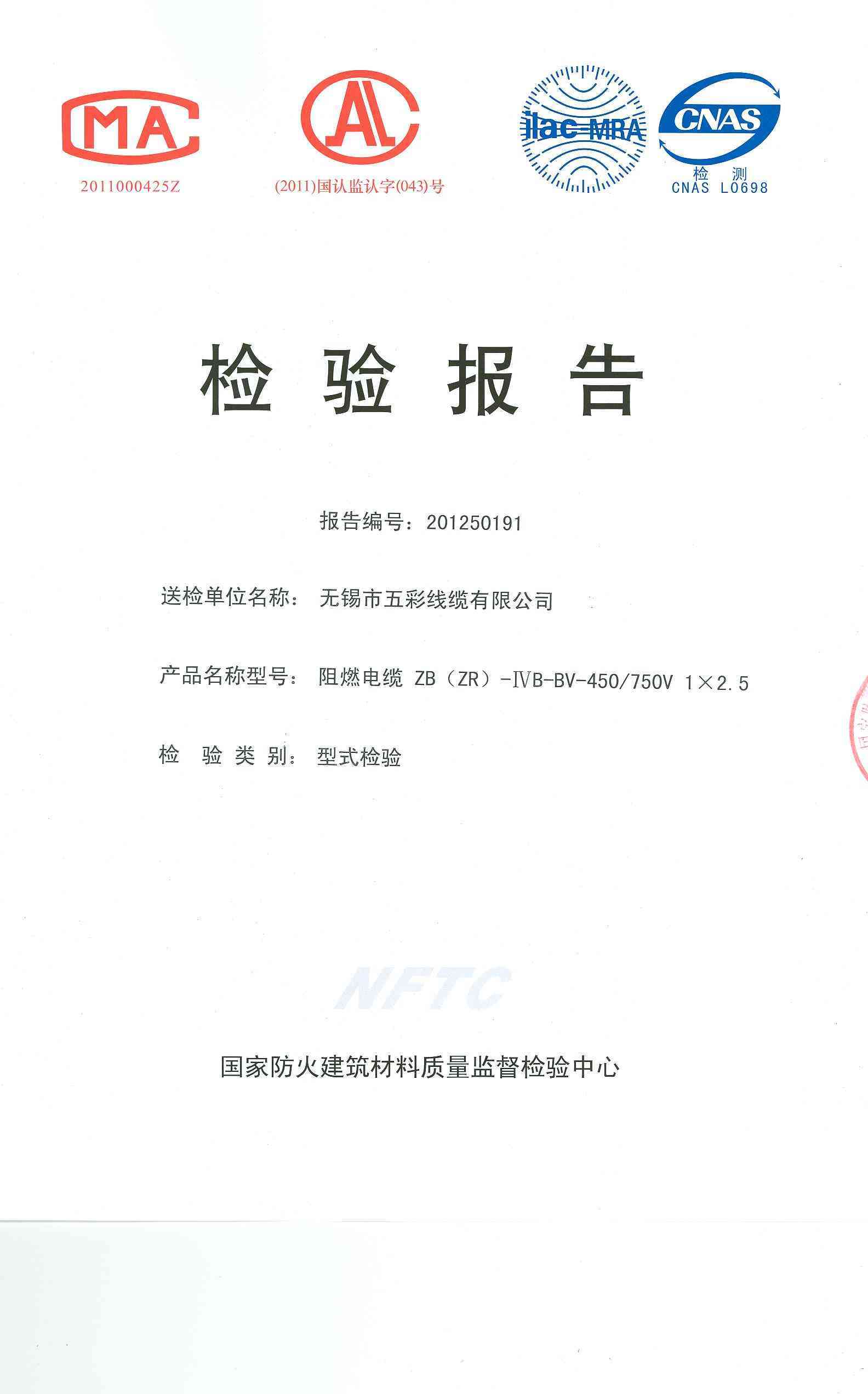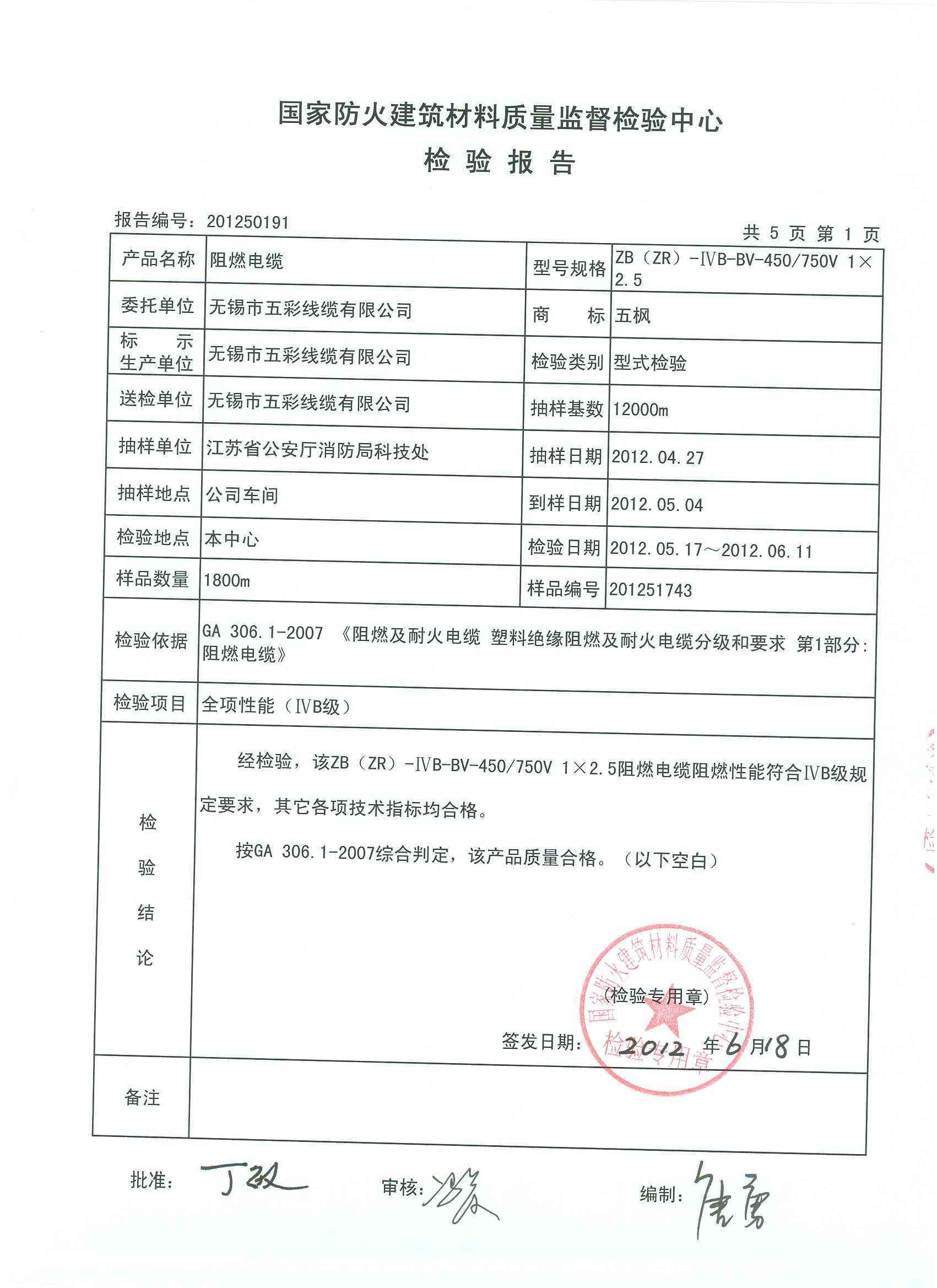 经检验,该ZB(ZR)-ⅣB-BV-450/750V 1×2.5阻燃电缆阻燃性能符合ⅣB级规定要求,其它各项技术指标均合格。 按GA 306.1-2007综合判定,该产品质量合格。(以下空白)