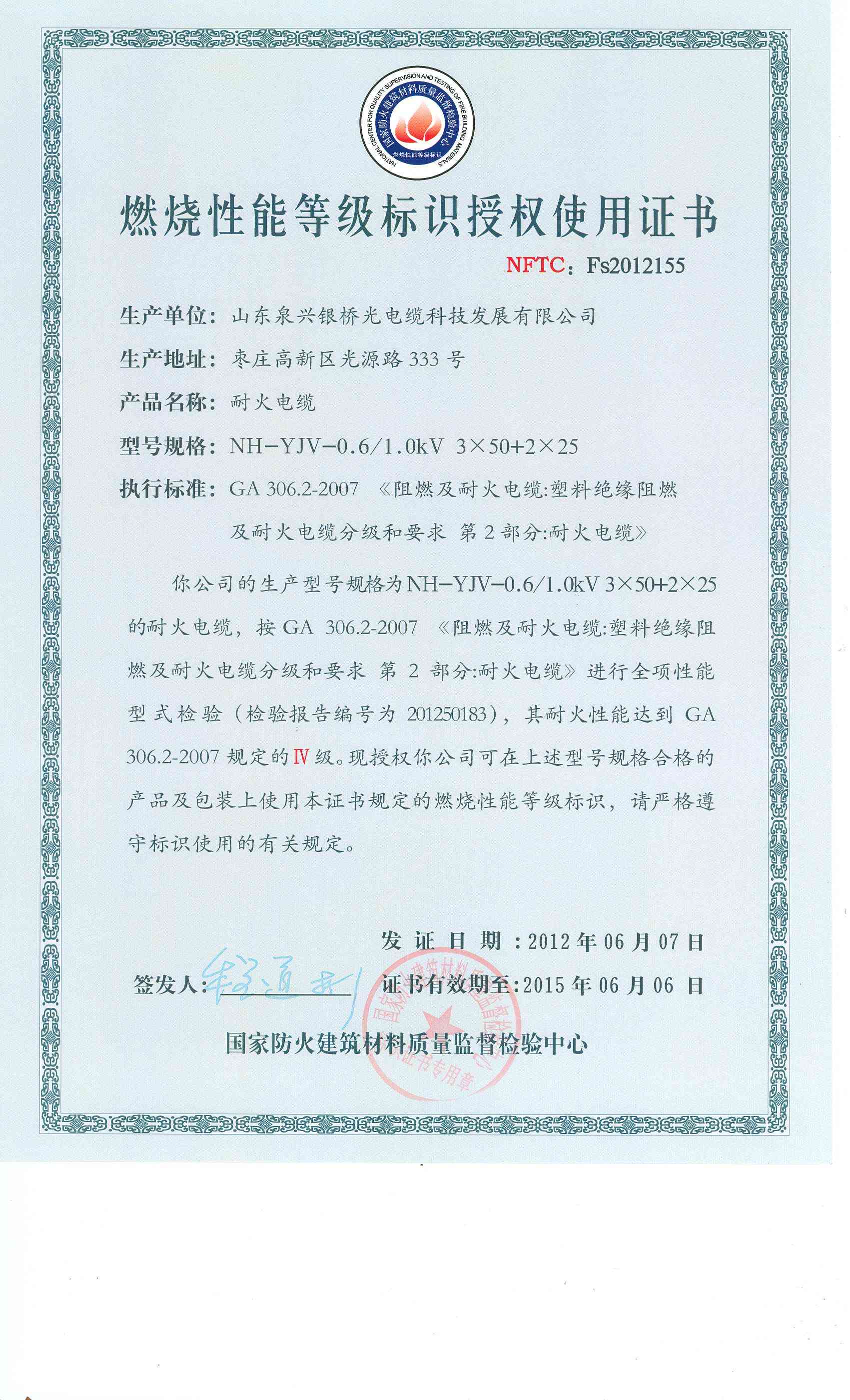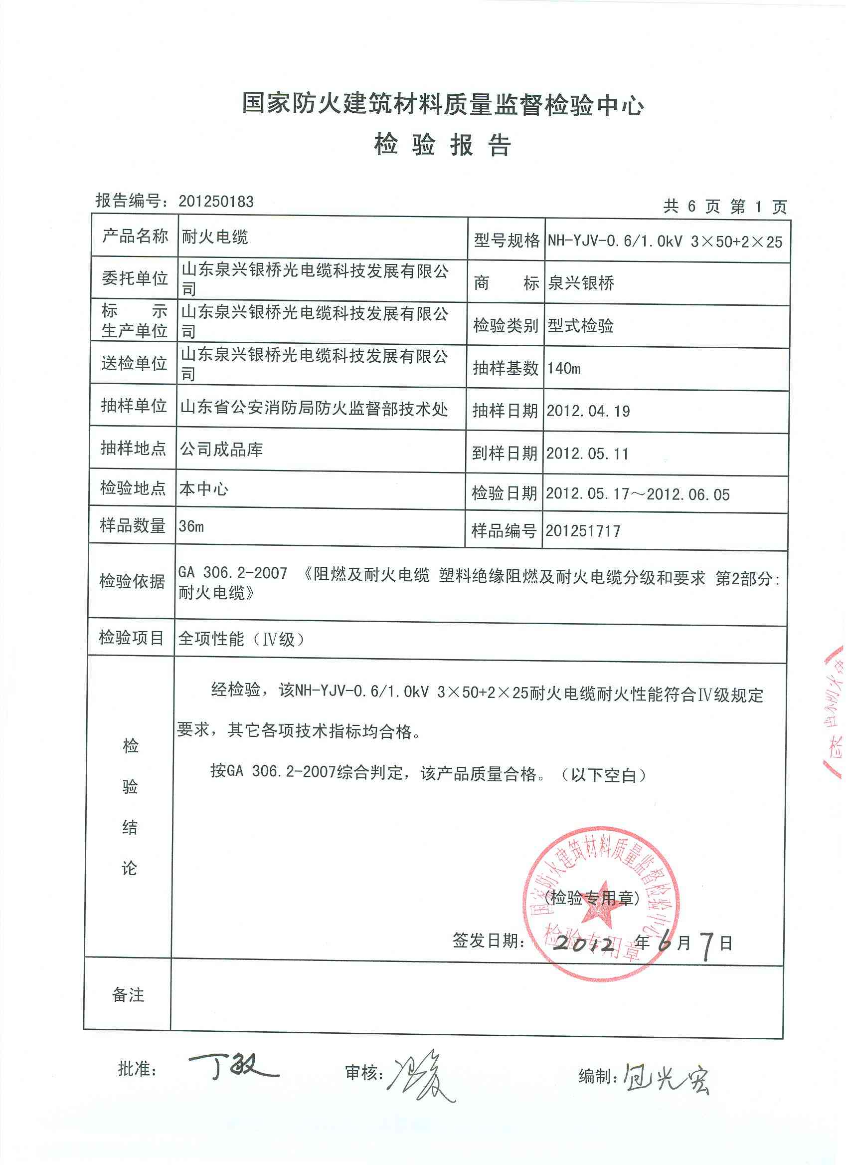 经检验,该NH-YJV-0.6/1.0kV 3×50+2×25耐火电缆耐火性能符合Ⅳ级规定要求,其它各项技术指标均合格。 按GA 306.2-2007综合判定,该产品质量合格。(以下空白)