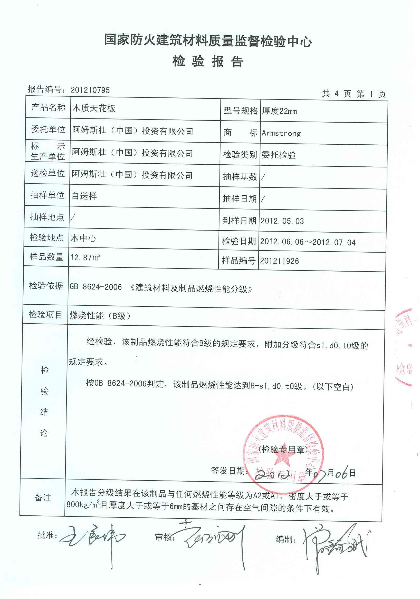 经检验,该制品燃烧性能符合B级的规定要求,附加分级符合s1,d0,t0级的 规定要求。 按GB 8624-2006判定,该制品燃烧性能达到B-s1,d0,t0级。(以下空白)