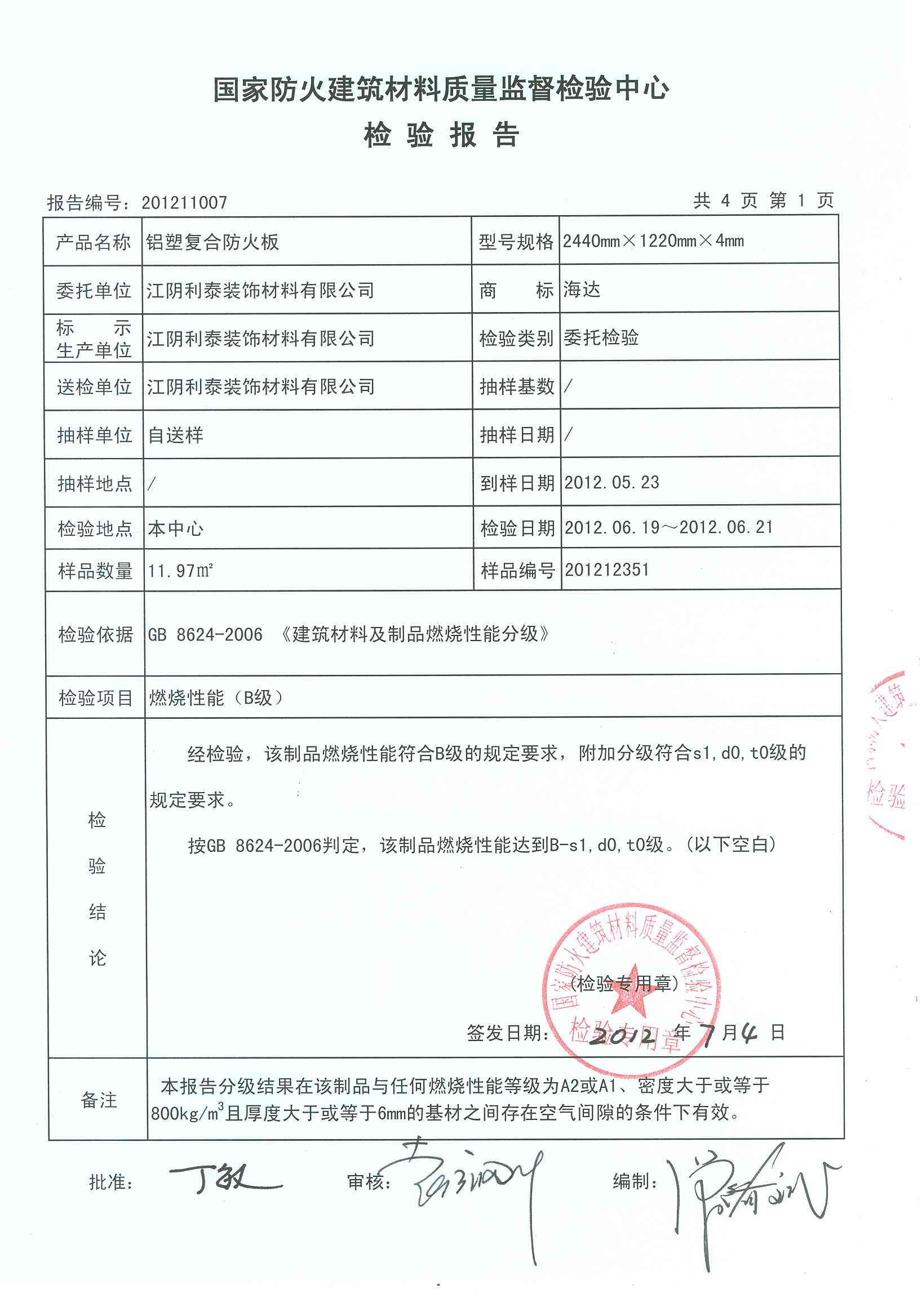 经检验,该制品燃烧性能符合B级的规定要求,附加分级符合s1,d0,t0级的 规定要求。 按GB 8624-2006判定,该制品燃烧性能达到B-s1,d0,t0级。(以下空白)