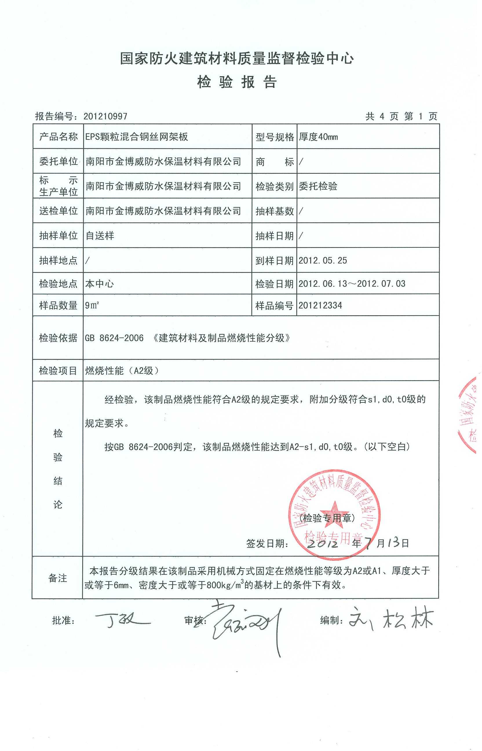 经检验,该制品燃烧性能符合A2级的规定要求,附加分级符合s1,d0,t0级的 规定要求。 按GB 8624-2006判定,该制品燃烧性能达到A2-s1,d0,t0级。(以下空白)