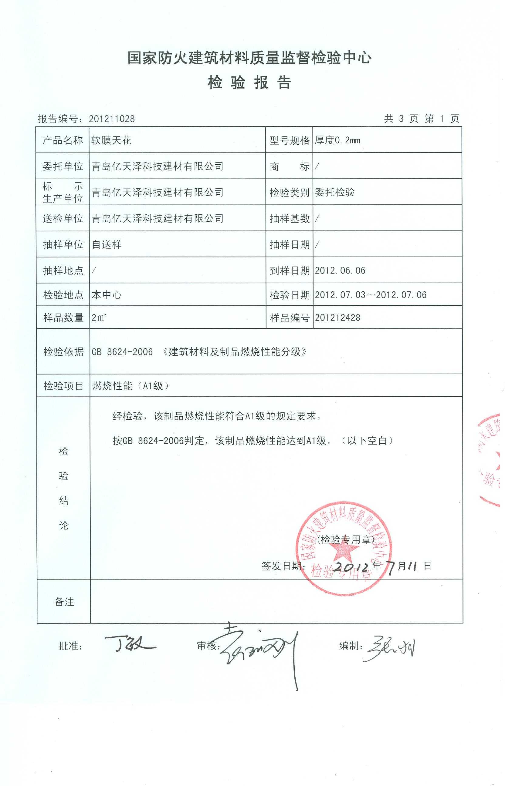 经检验,该制品燃烧性能符合A1级的规定要求。 按GB 8624-2006判定,该制品燃烧性能达到A1级。(以下空白)