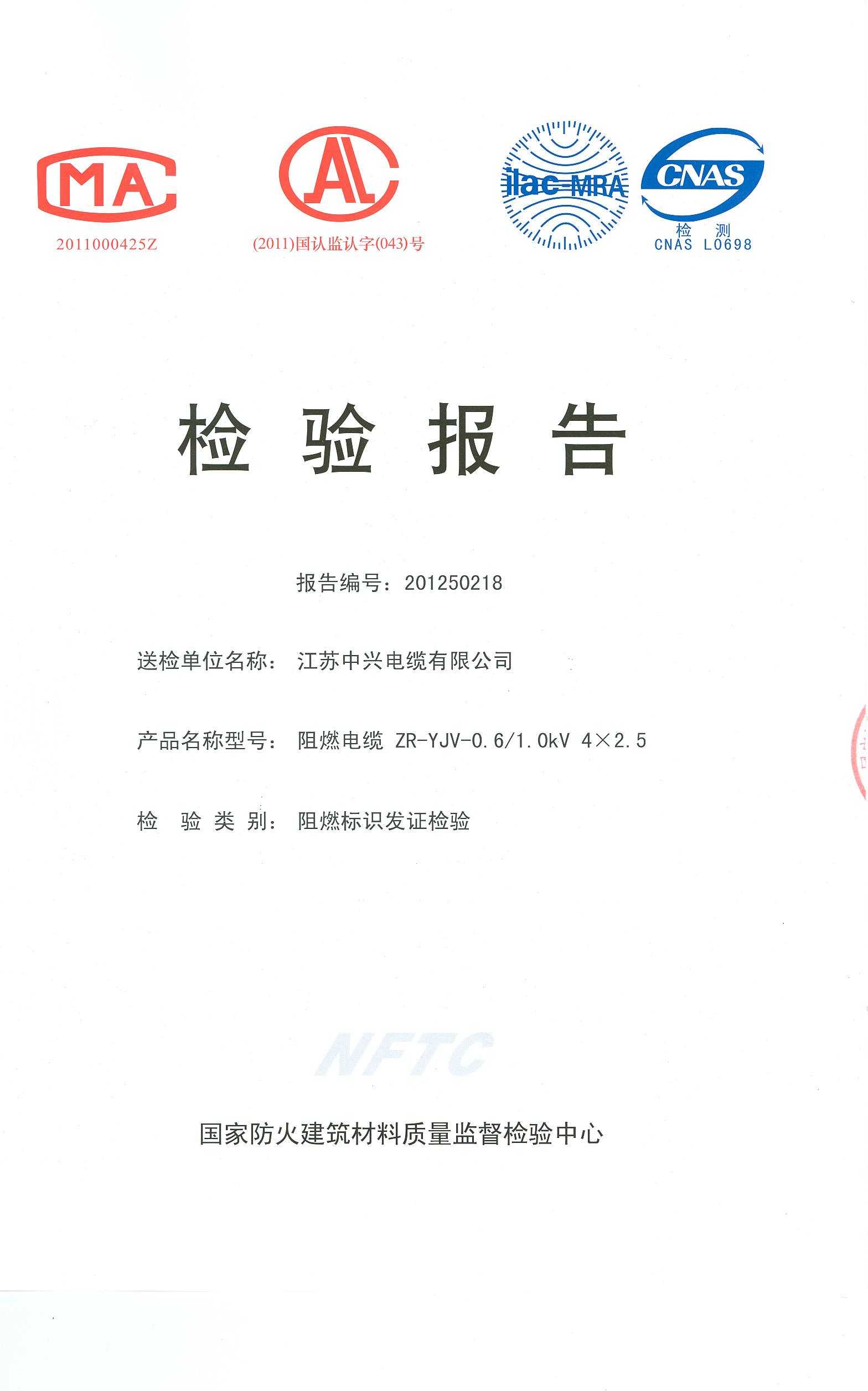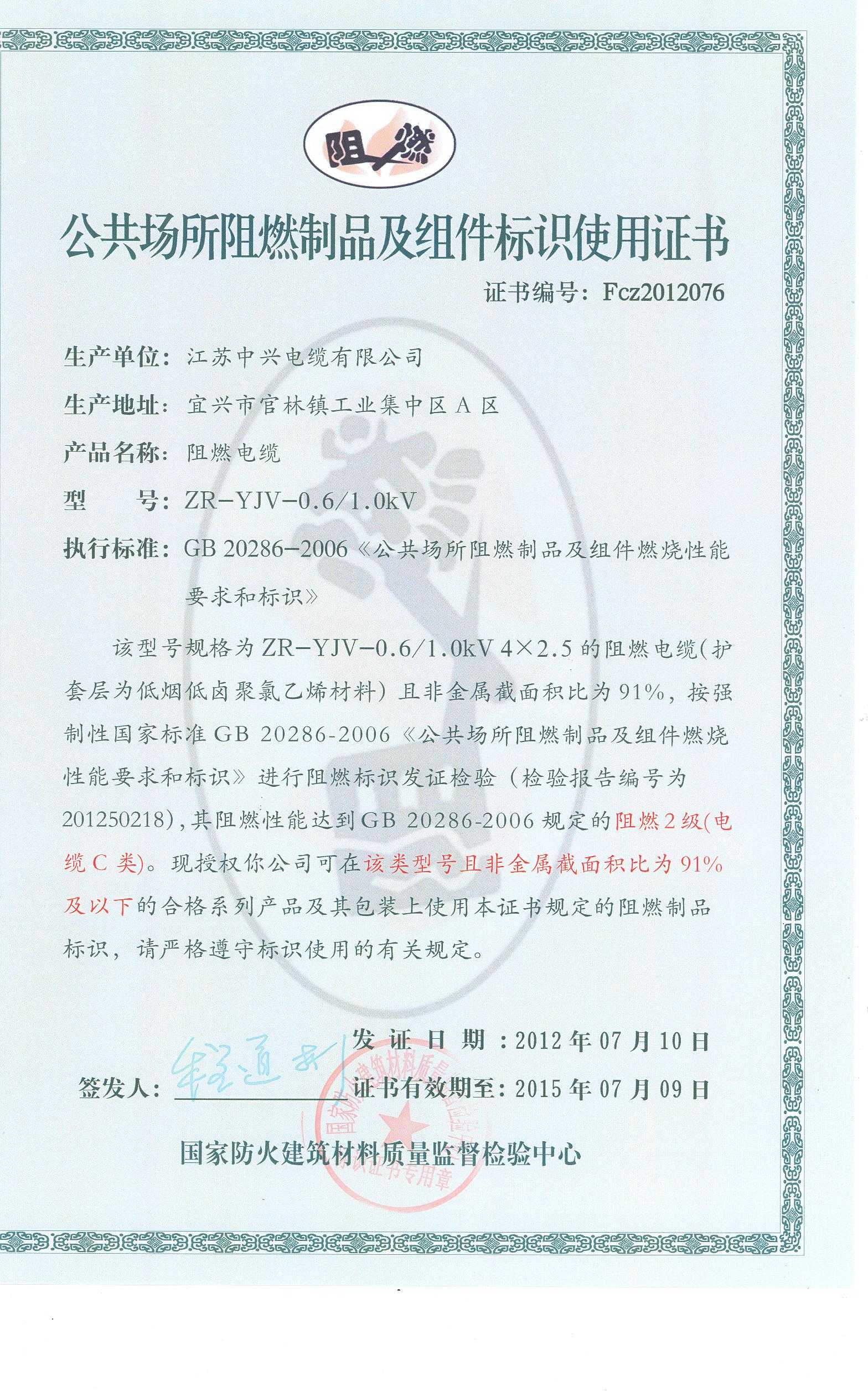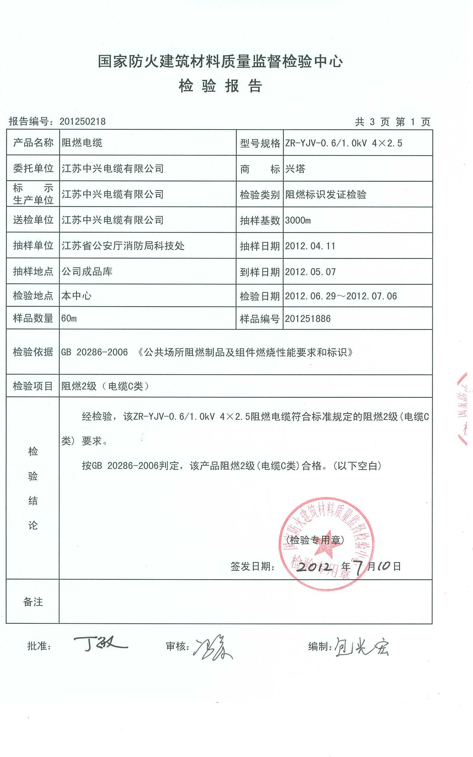 经检验,该ZR-YJV-0.6/1.0kV 4×2.5阻燃电缆符合标准规定的阻燃2级(电缆C类) 要求。 按GB 20286-2006判定,该产品阻燃2级(电缆C类)合格。(以下空白)