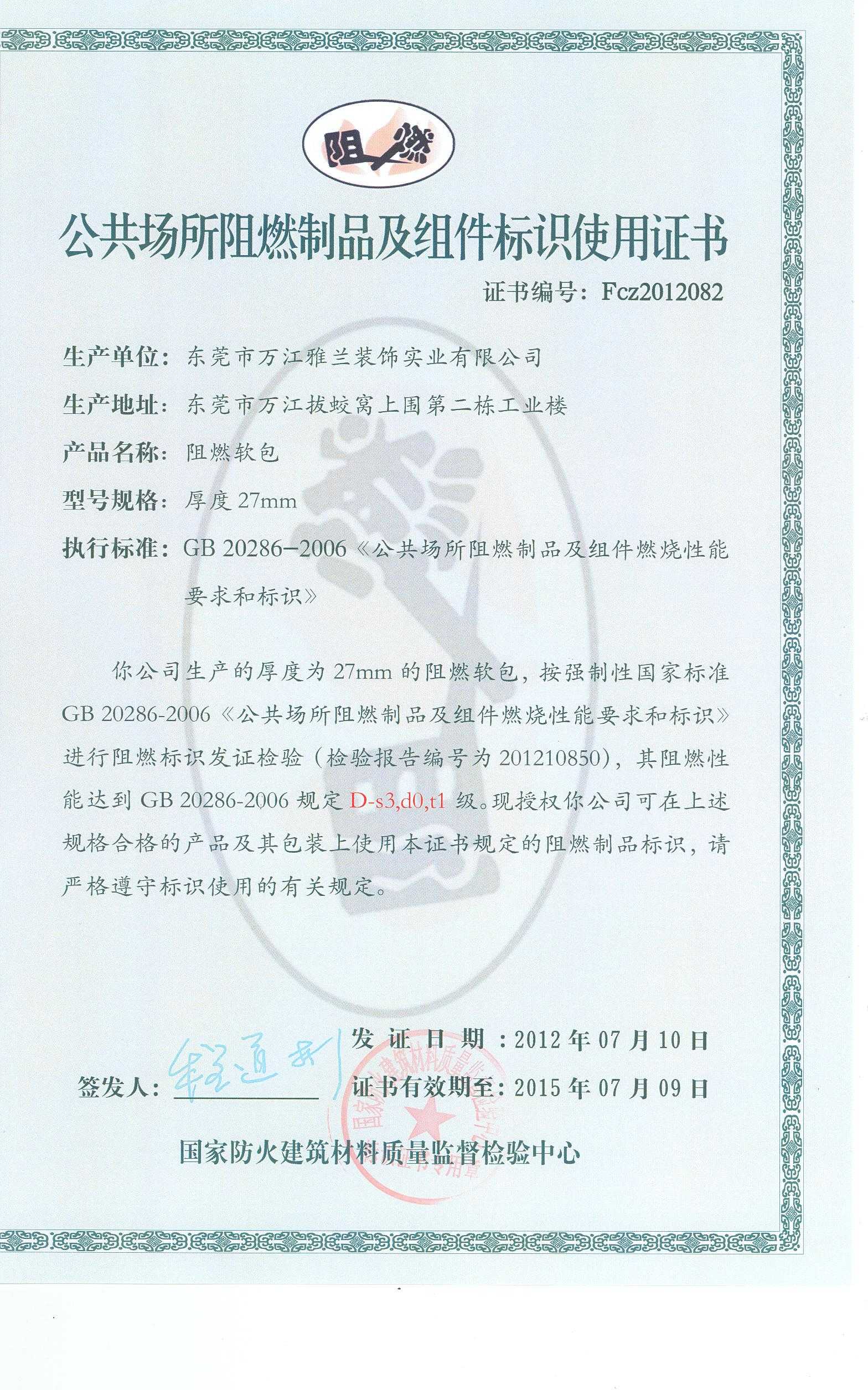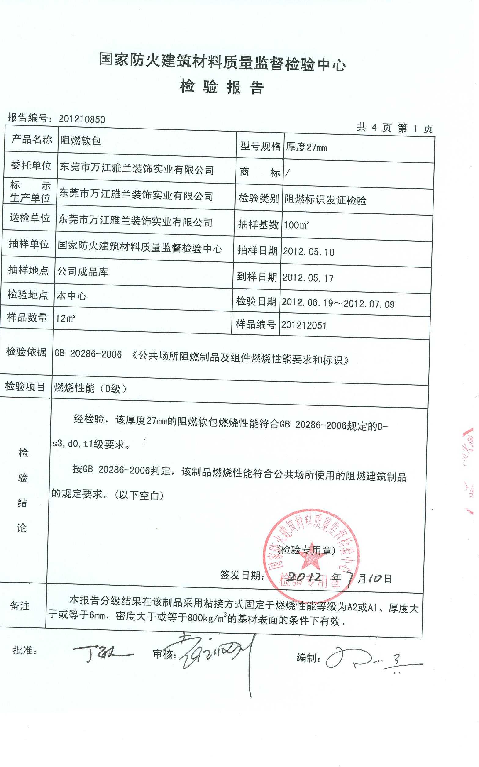 经检验,该厚度27mm的阻燃软包燃烧性能符合GB 20286-2006规定的D-s3,d0,t1级要求。 按GB 20286-2006判定,该制品燃烧性能符合公共场所使用的阻燃建筑制品的规定要求。(以下空白)
