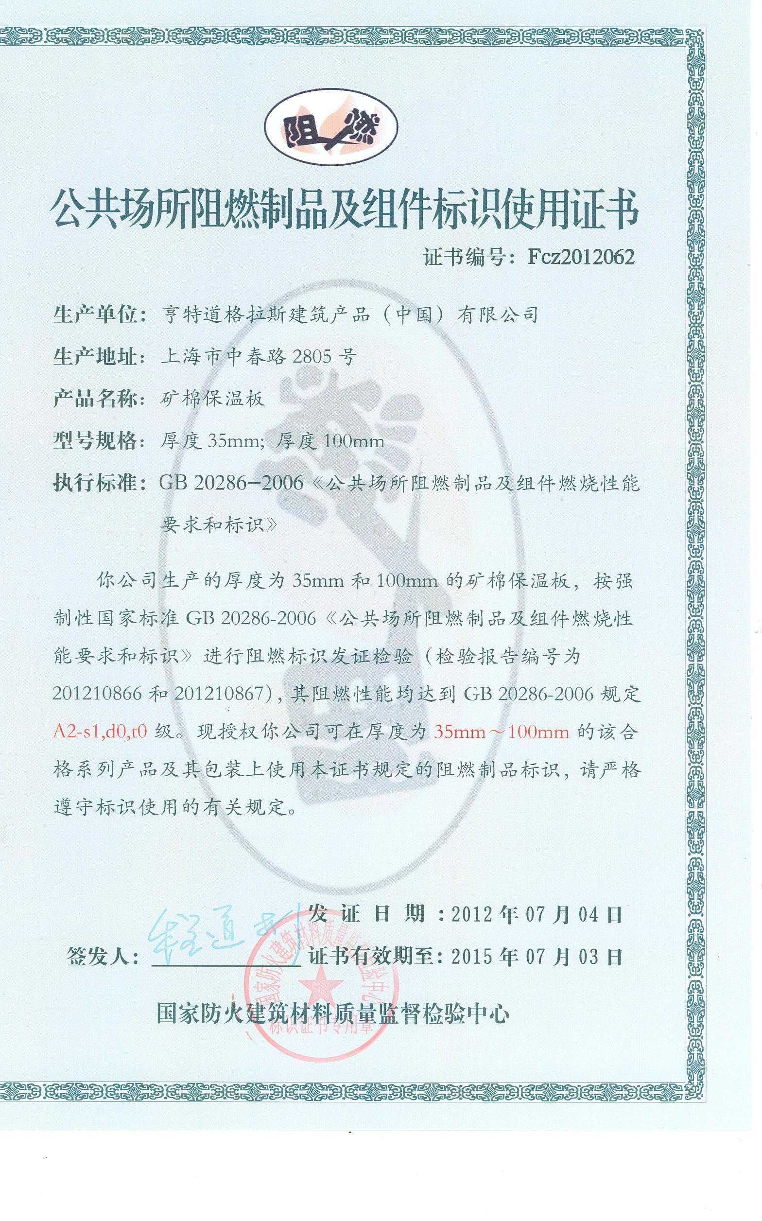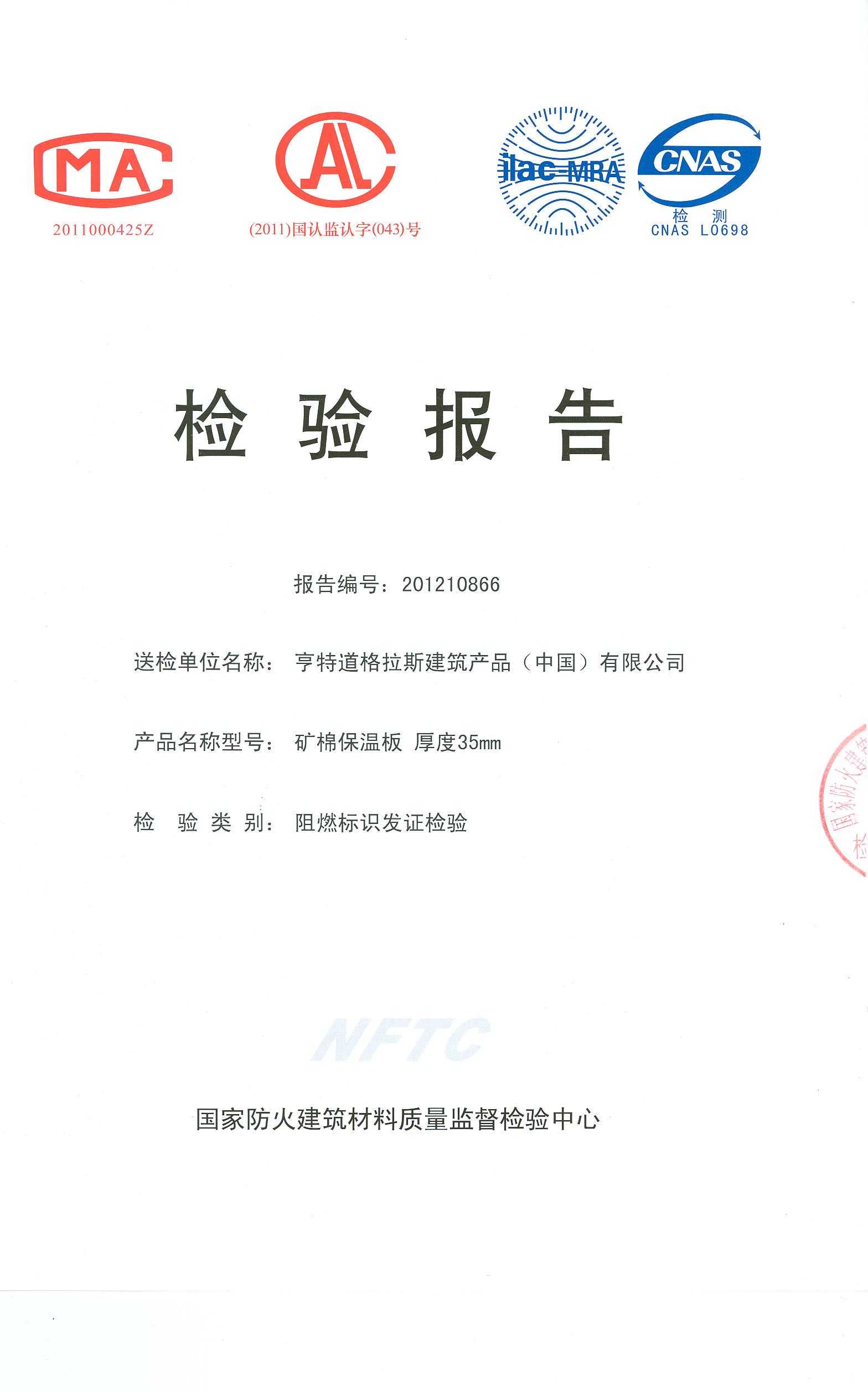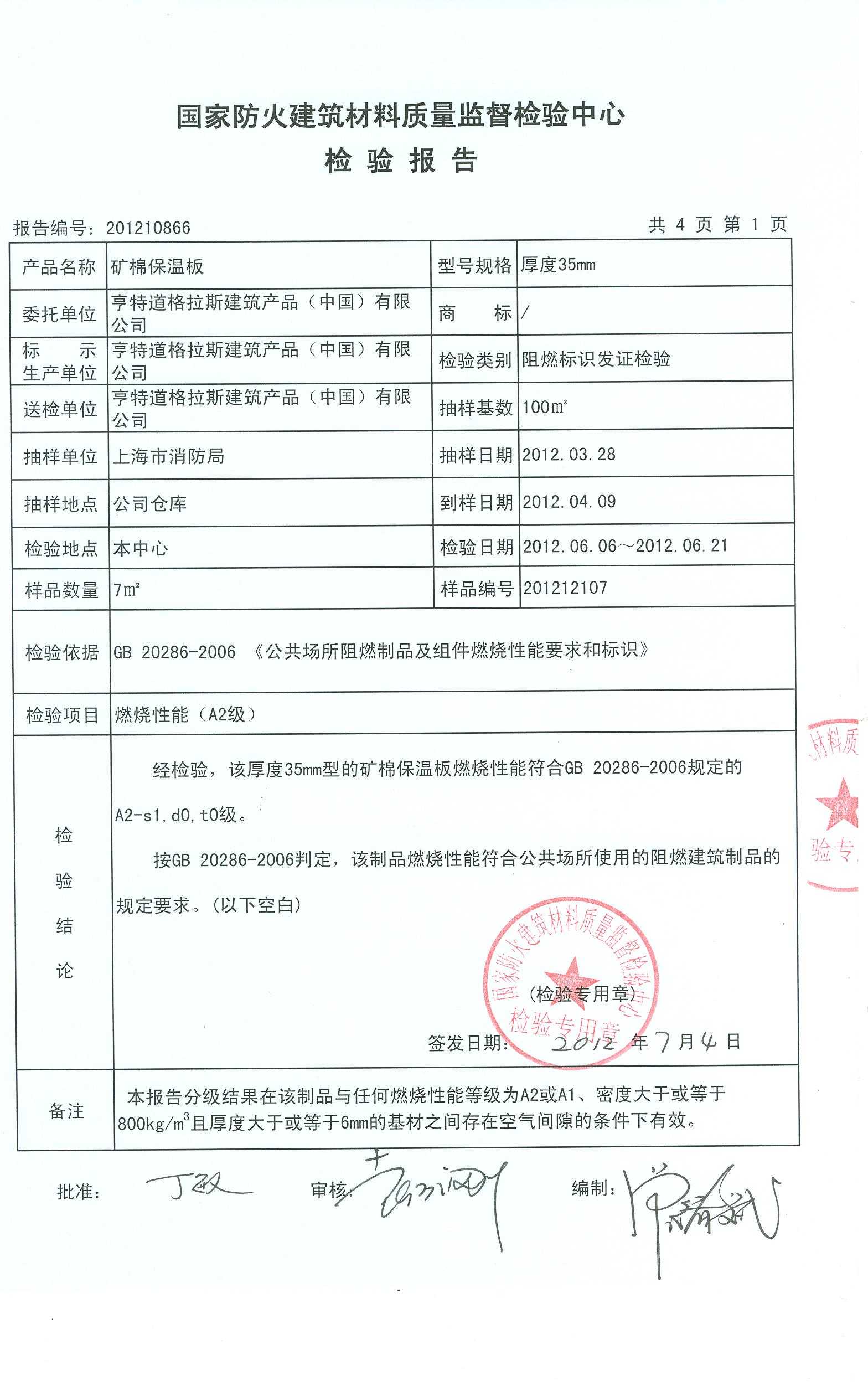 经检验,该厚度35mm型的矿棉保温板燃烧性能符合GB 20286-2006规定的A2-s1,d0,t0级。 按GB 20286-2006判定,该制品燃烧性能符合公共场所使用的阻燃建筑制品的规定要求。(以下空白)