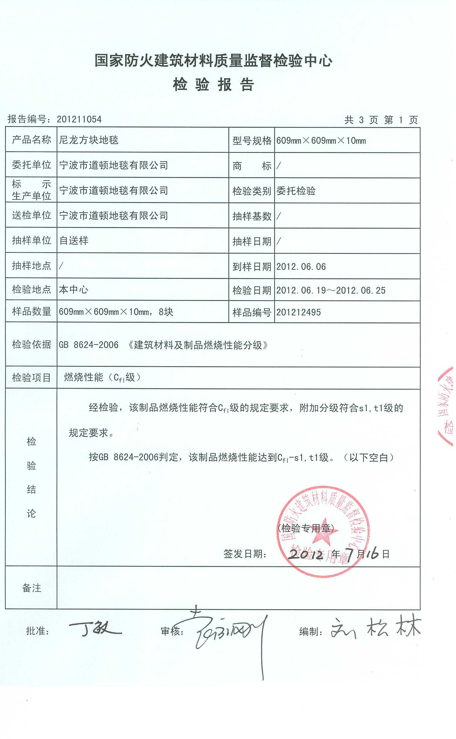 经检验,该制品燃烧性能符合C_(fl)级的规定要求,附加分级符合s1,t1级的 规定要求。 按GB 8624-2006判定,该制品燃烧性能达到C_(fl)-s1,t1级。(以下空白)