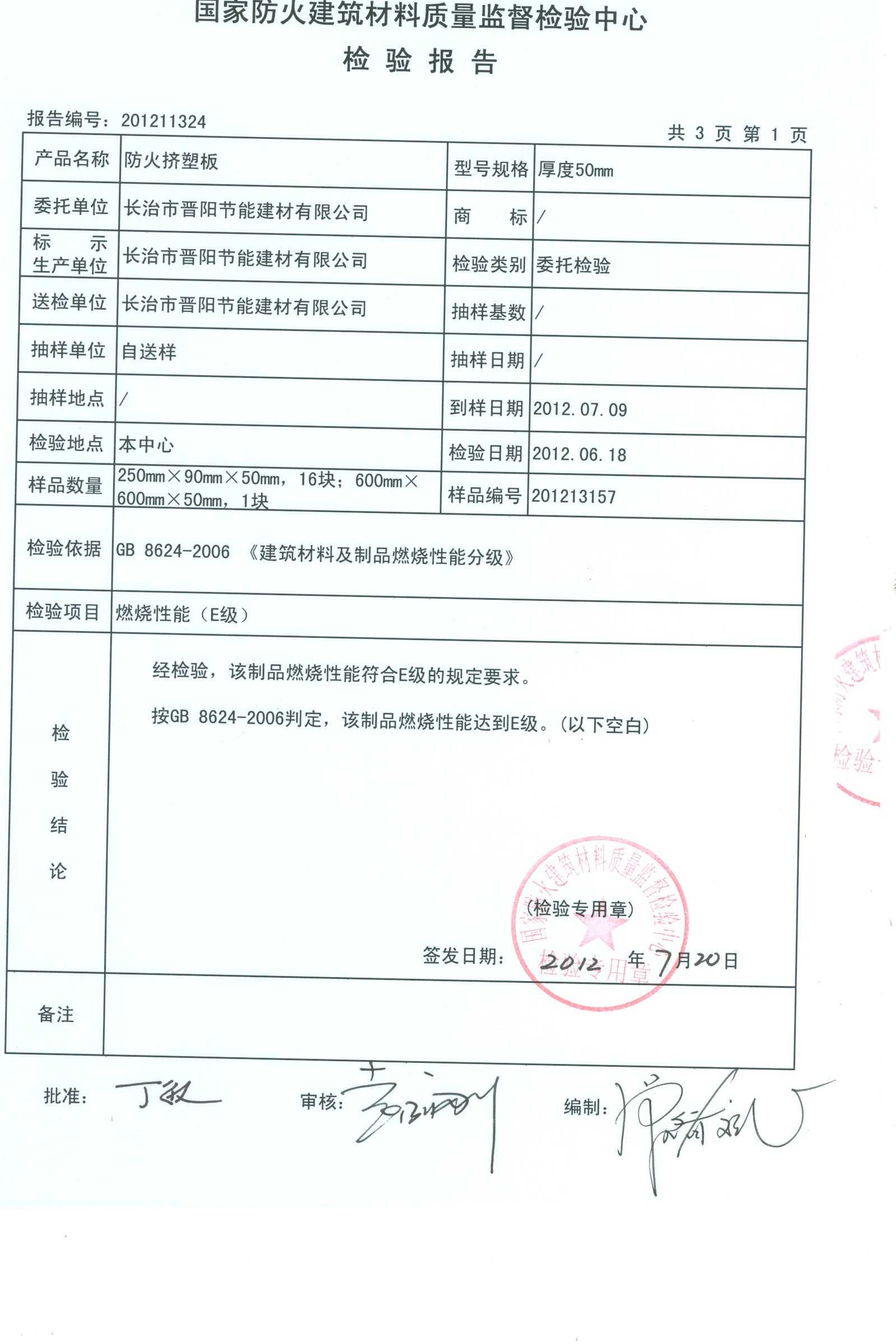 经检验,该制品燃烧性能符合E级的规定要求。 按GB 8624-2006判定,该制品燃烧性能达到E级。(以下空白)