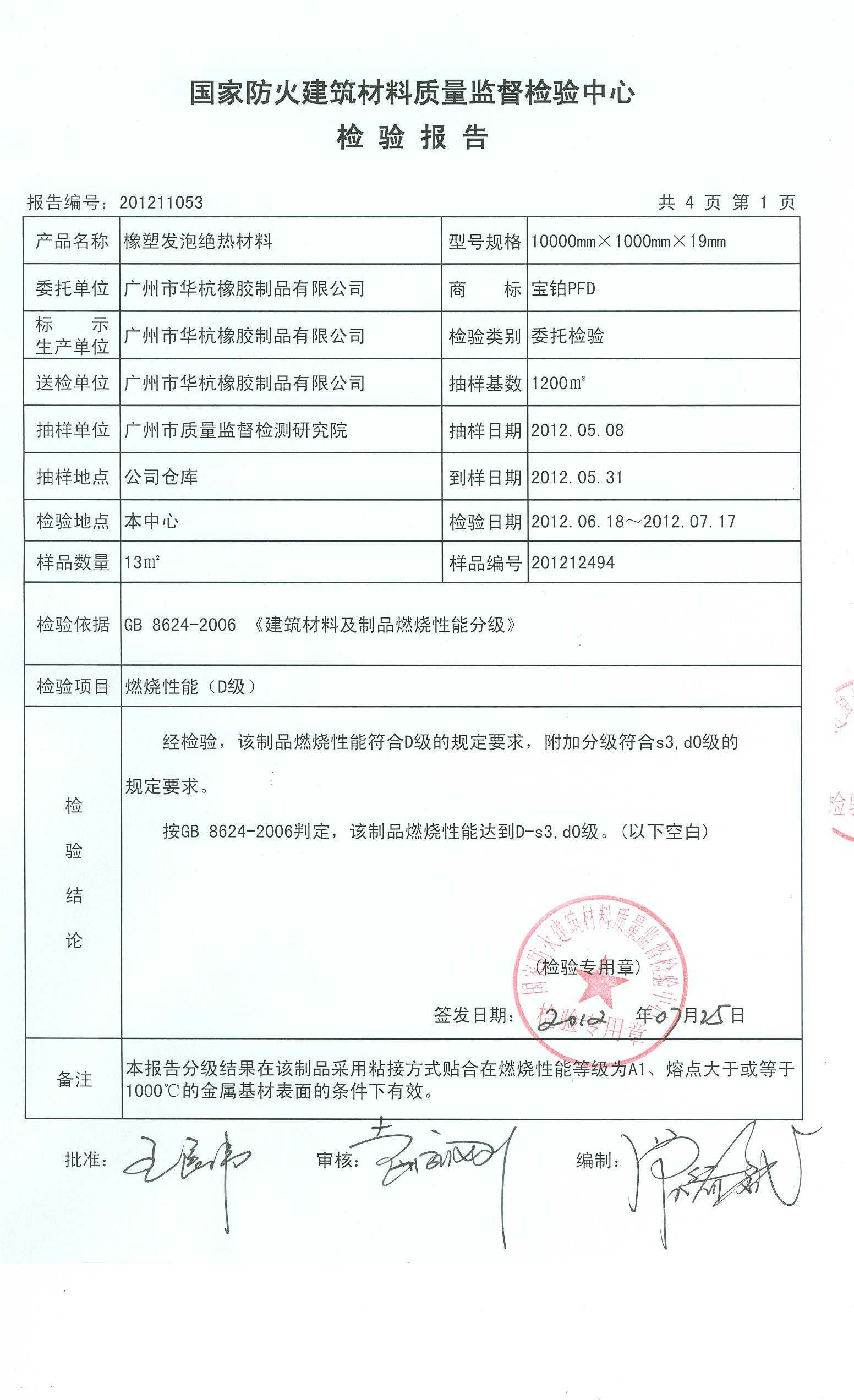 经检验,该制品燃烧性能符合D级的规定要求,附加分级符合s3,d0级的 规定要求。 按GB 8624-2006判定,该制品燃烧性能达到D-s3,d0级。(以下空白)