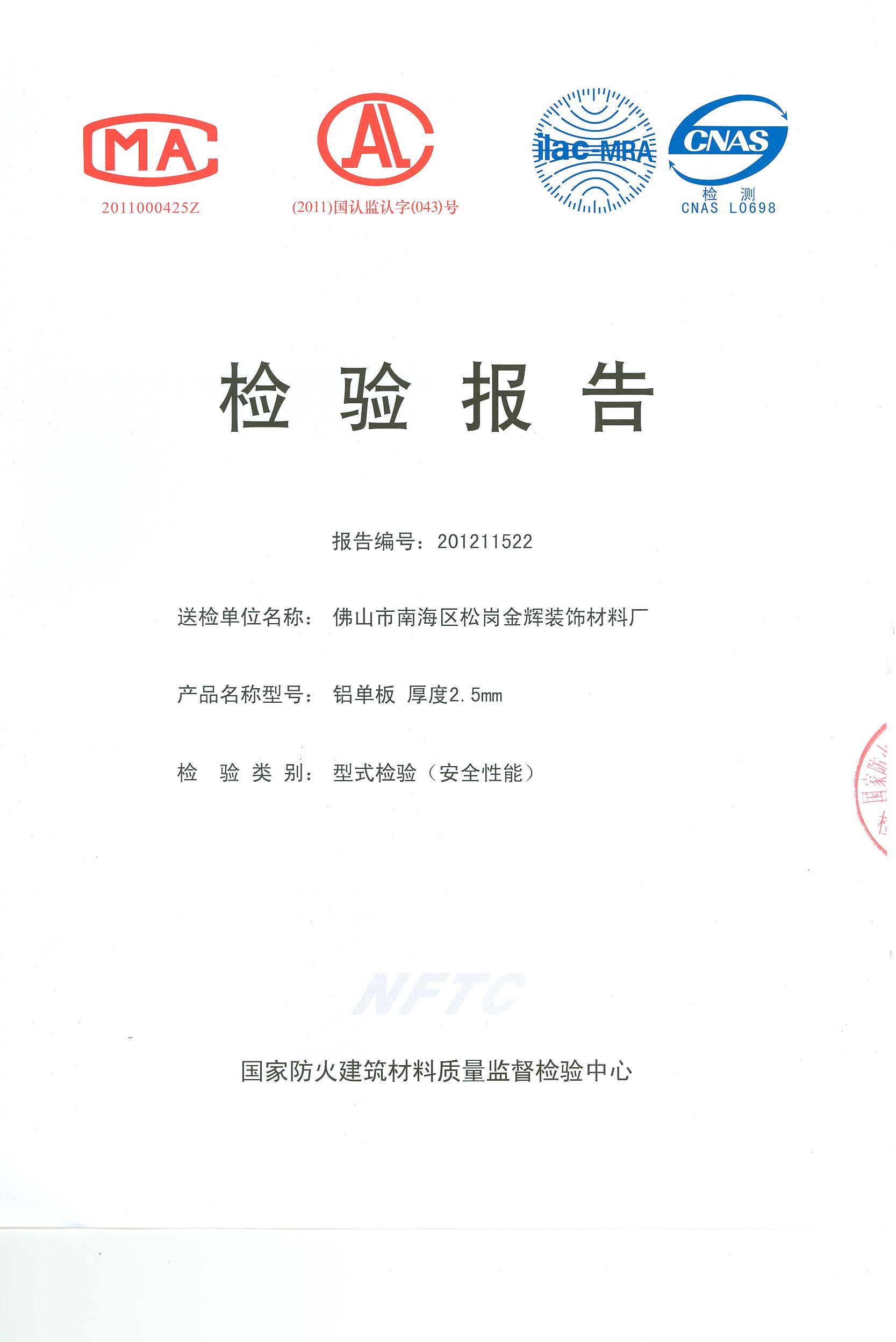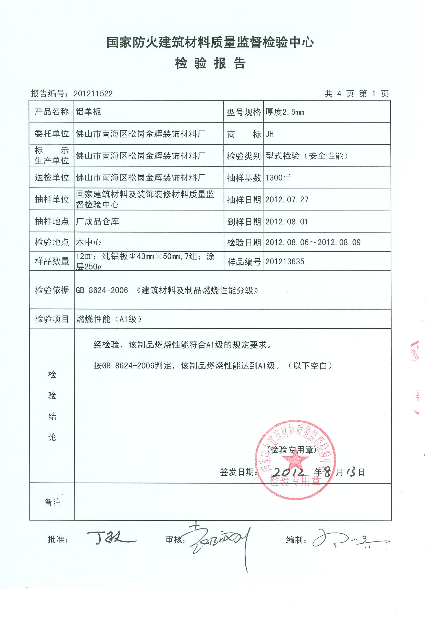 经检验,该制品燃烧性能符合A1级的规定要求。 按GB 8624-2006判定,该制品燃烧性能达到A1级。(以下空白)