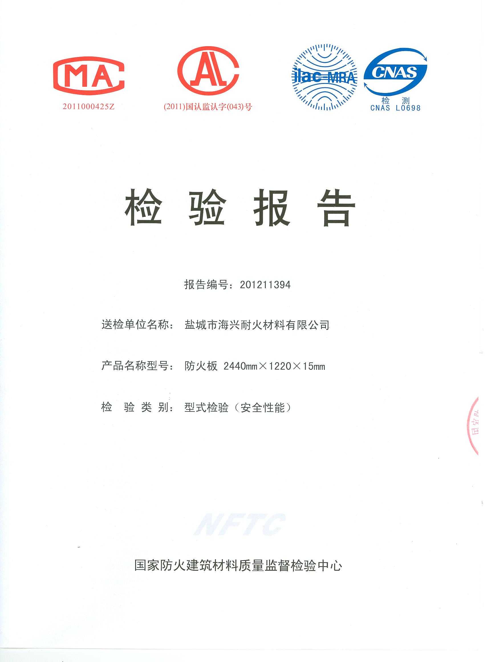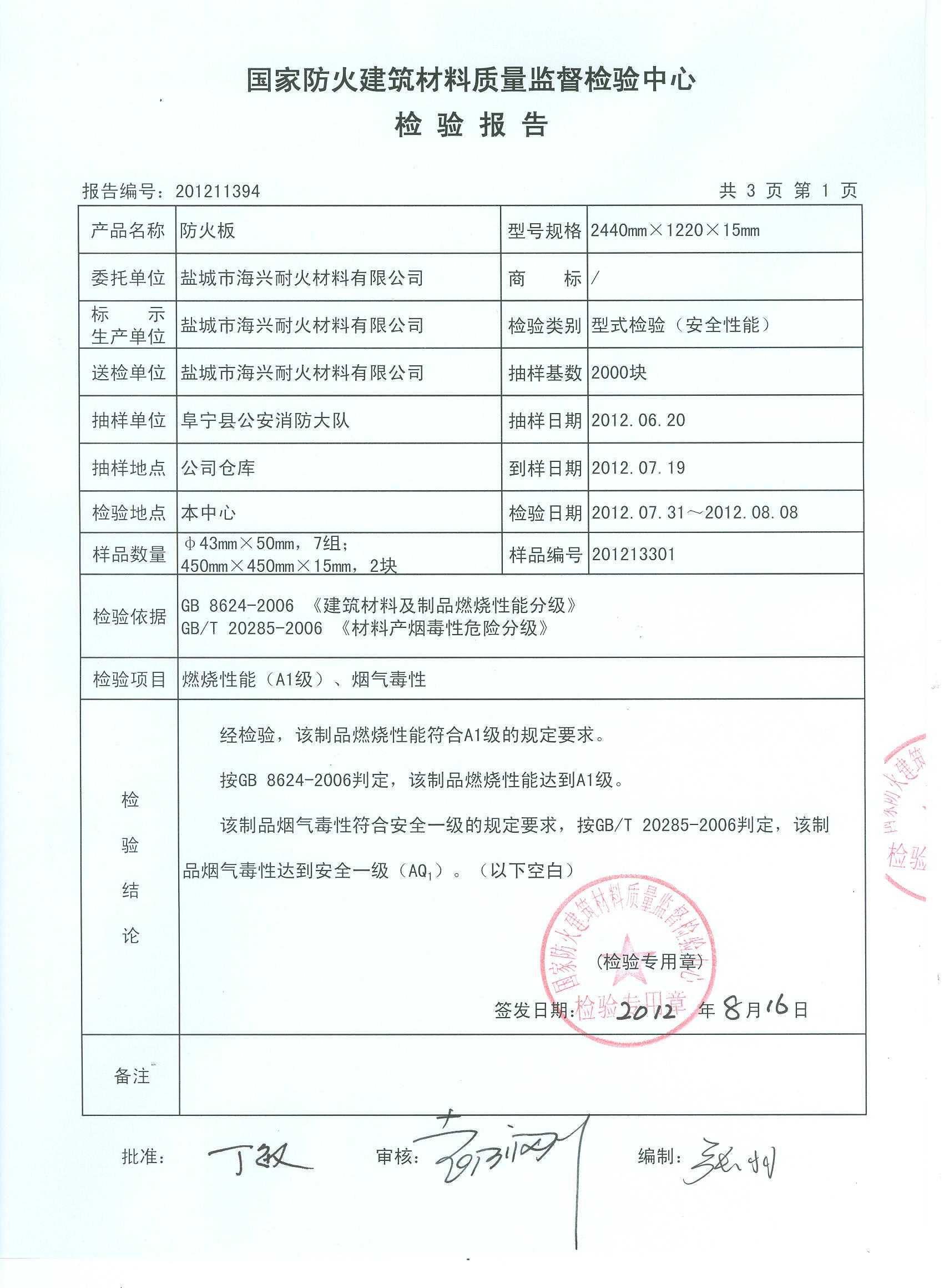 经检验,该制品燃烧性能符合A1级的规定要求。 按GB 8624-2006判定,该制品燃烧性能达到A1级。 该制品烟气毒性符合安全一级的规定要求,按GB/T 20285-2006判定,该制品烟气毒性达到安全一级(AQ1)。(以下空白)