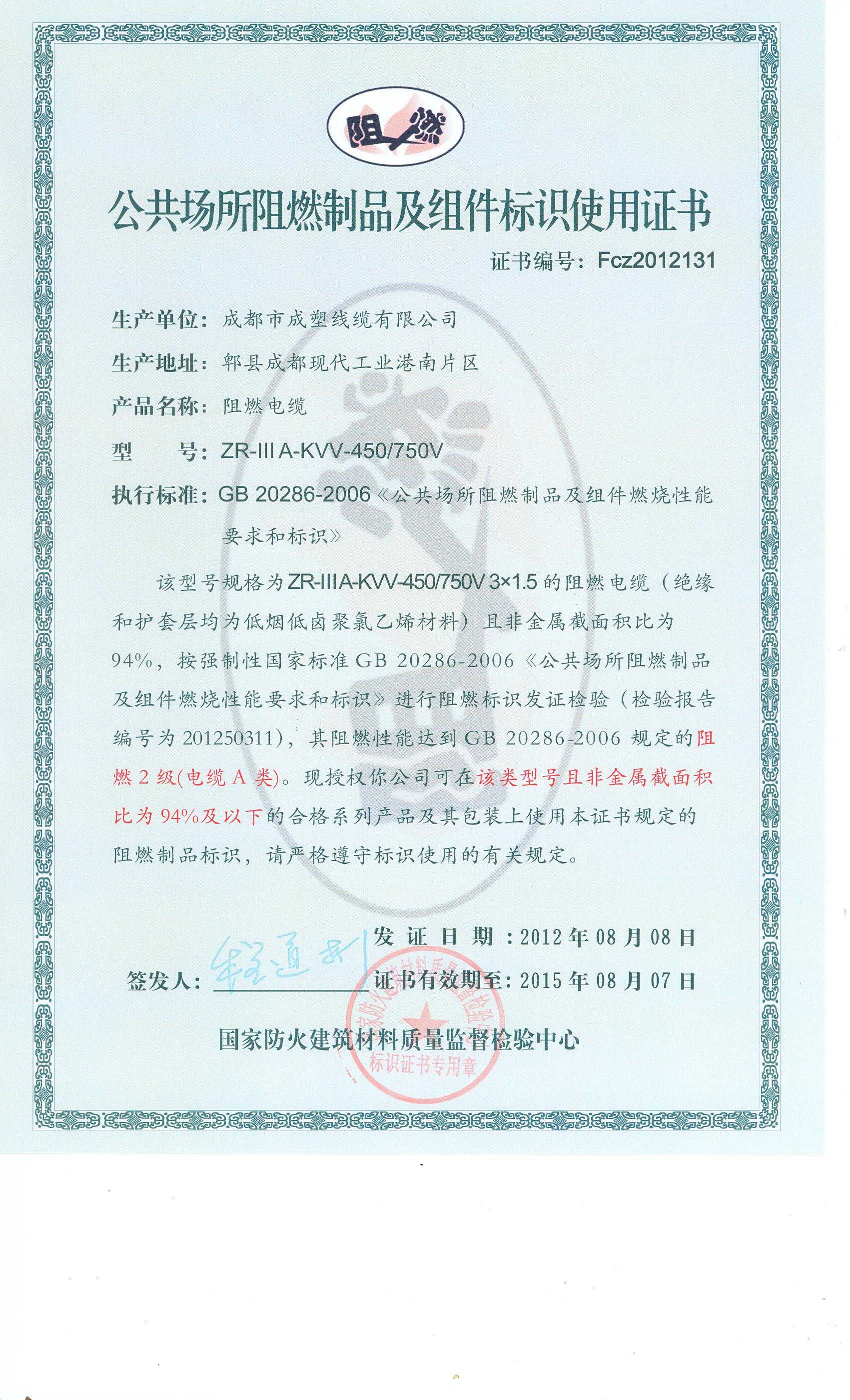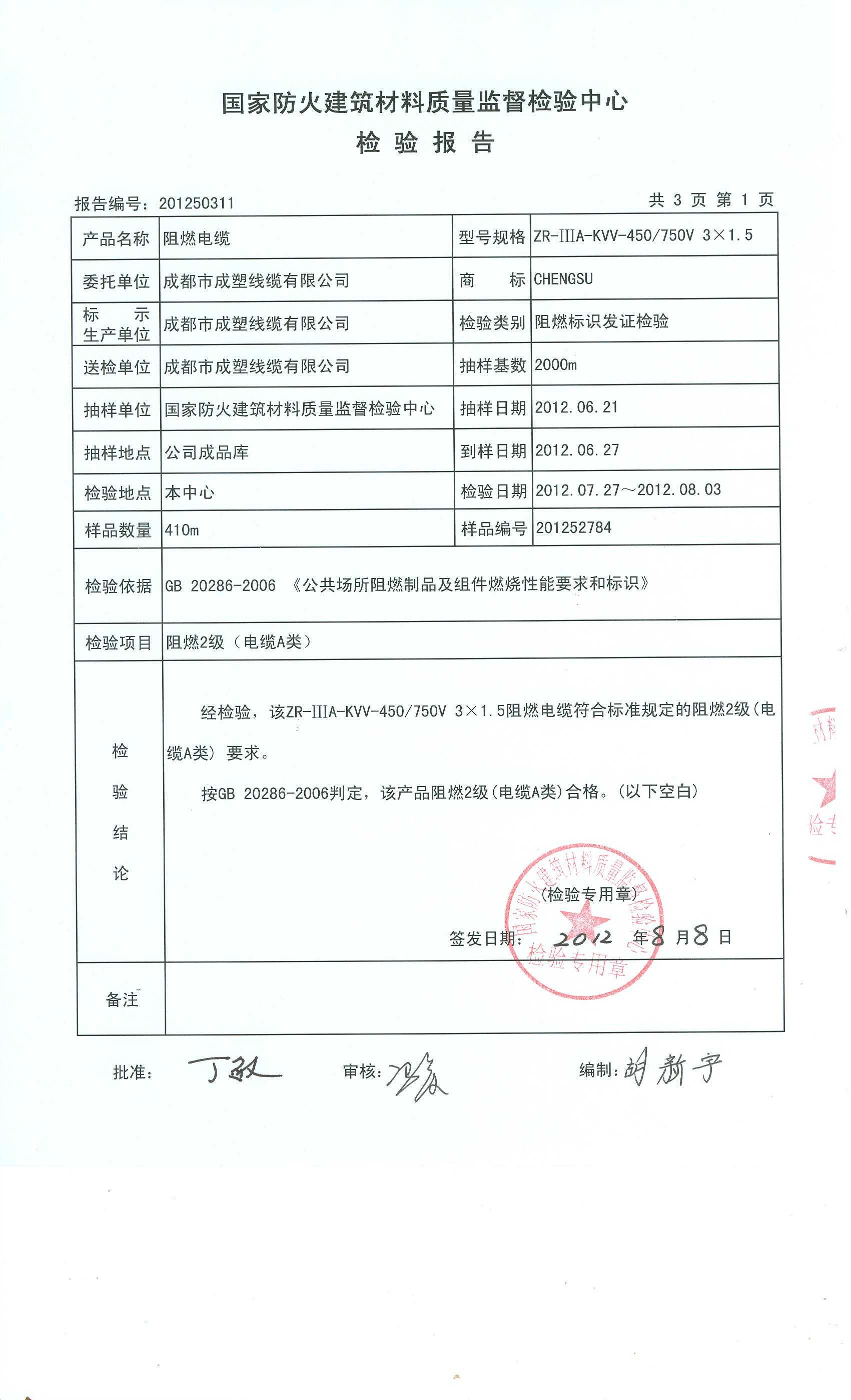 经检验,该ZR-ⅢA-KVV-450/750V 3×1.5阻燃电缆符合标准规定的阻燃2级(电缆A类) 要求。 按GB 20286-2006判定,该产品阻燃2级(电缆A类)合格。(以下空白)