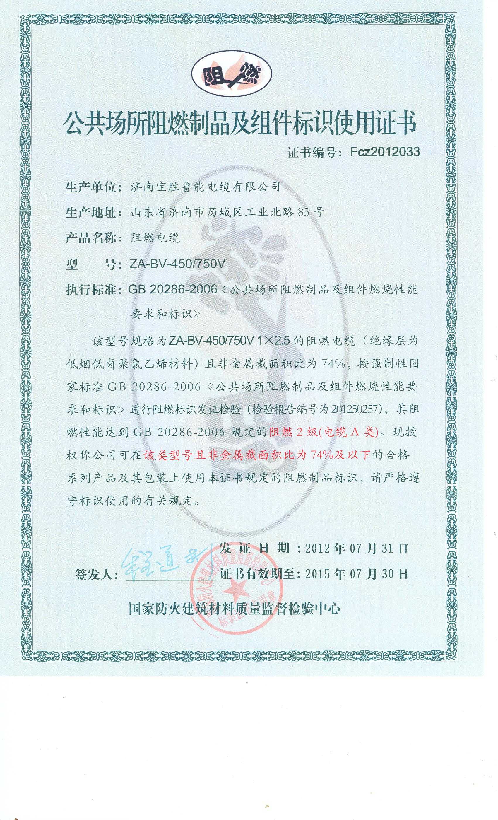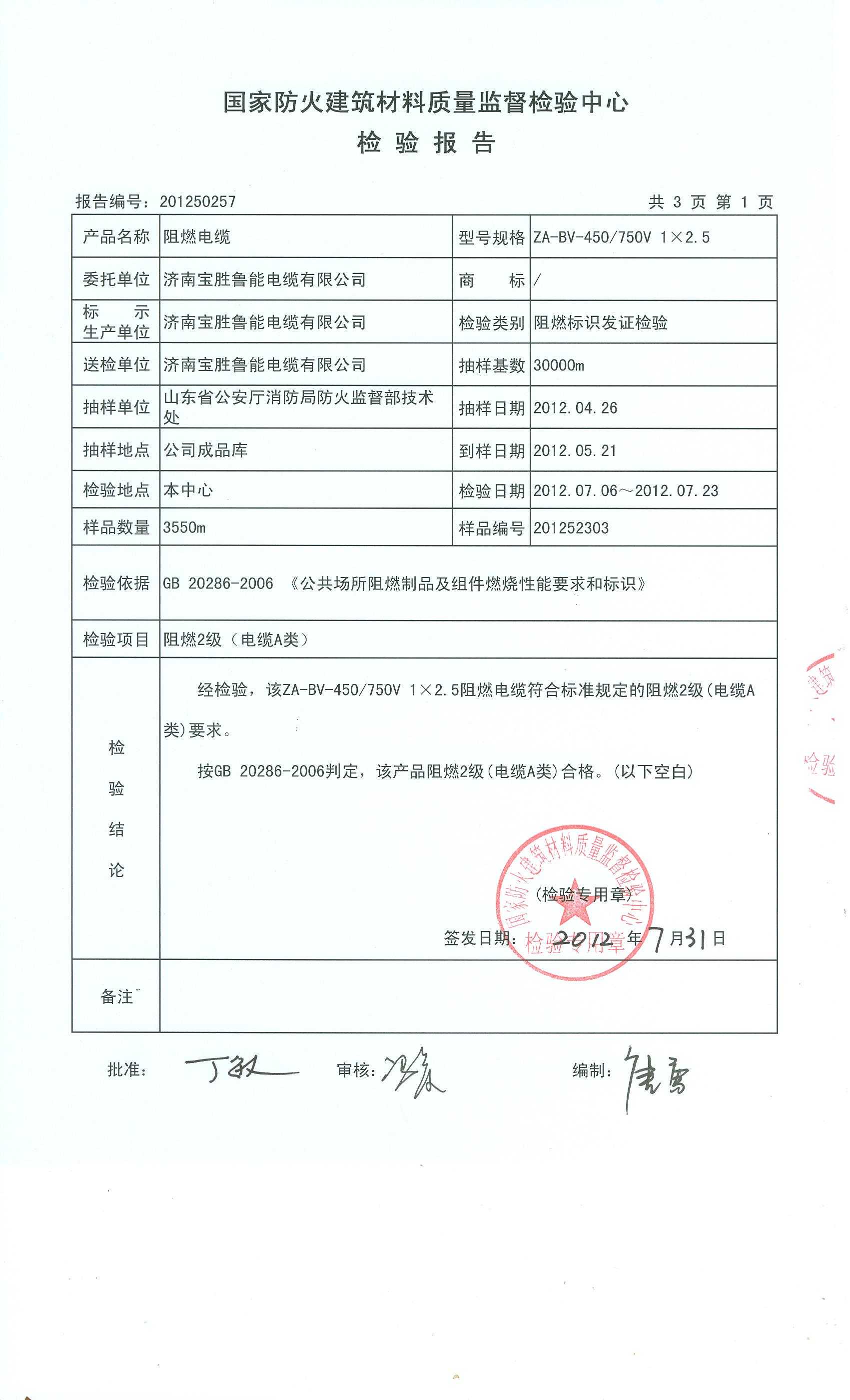经检验,该ZA-BV-450/750V 1×2.5阻燃电缆符合标准规定的阻燃2级(电缆A类)要求。 按GB 20286-2006判定,该产品阻燃2级(电缆A类)合格。(以下空白)