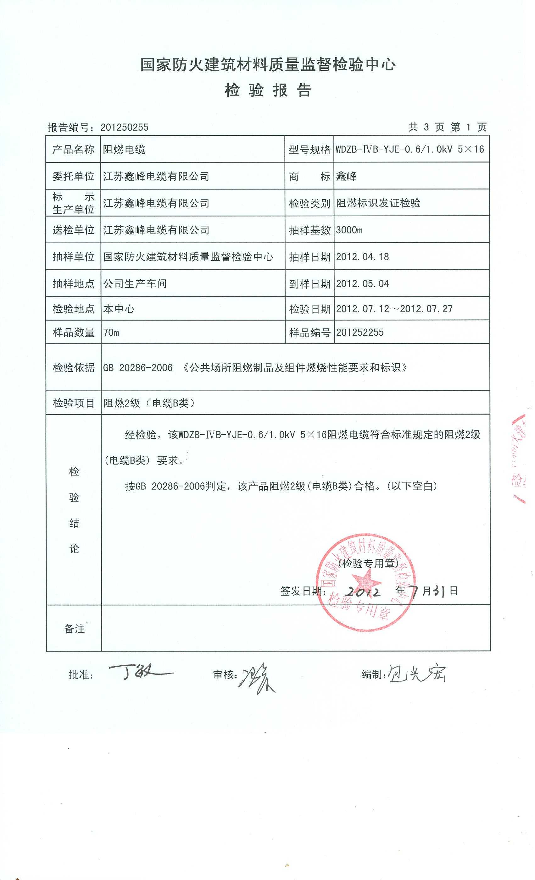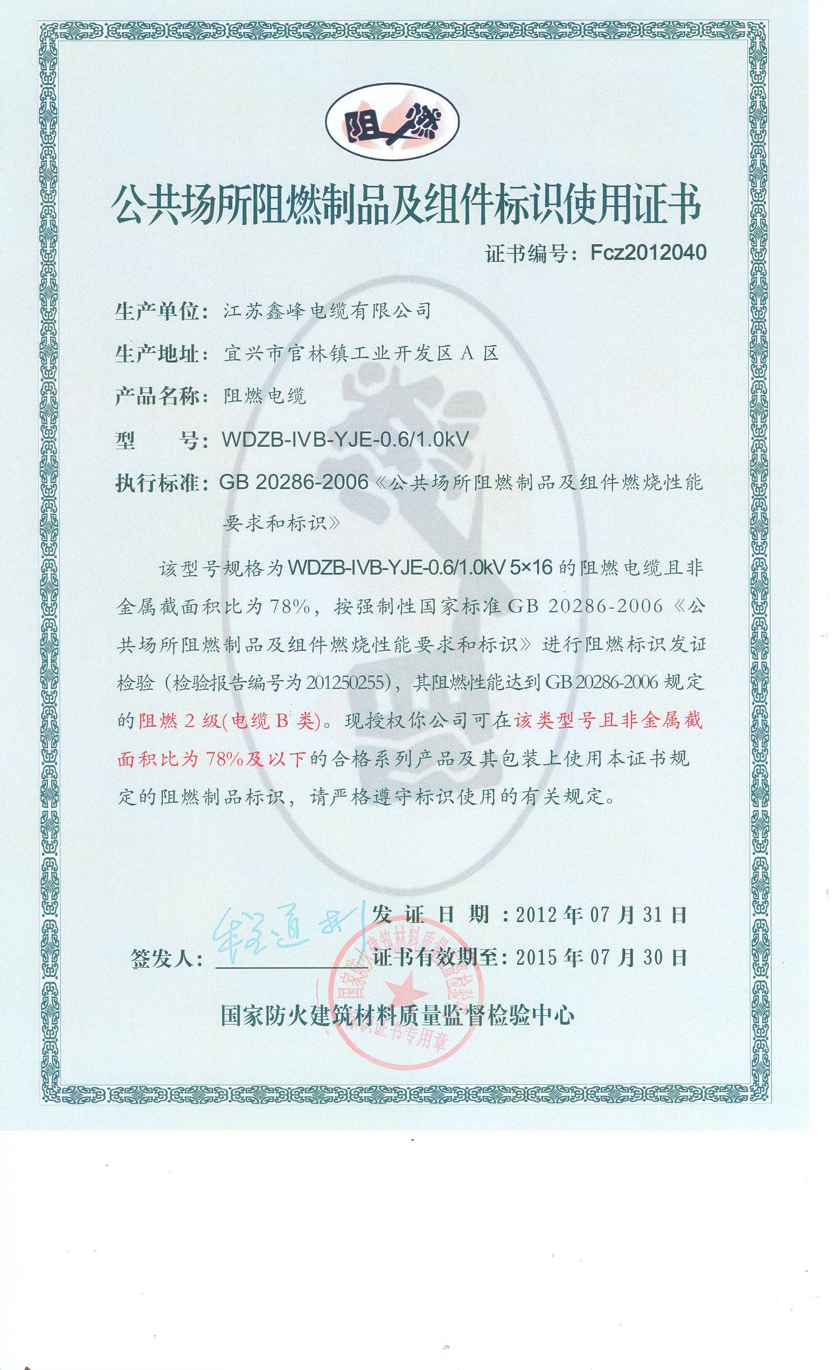 经检验,该WDZB-ⅣB-YJE-0.6/1.0kV 5×16阻燃电缆符合标准规定的阻燃2级(电缆B类) 要求。 按GB 20286-2006判定,该产品阻燃2级(电缆B类)合格。(以下空白)