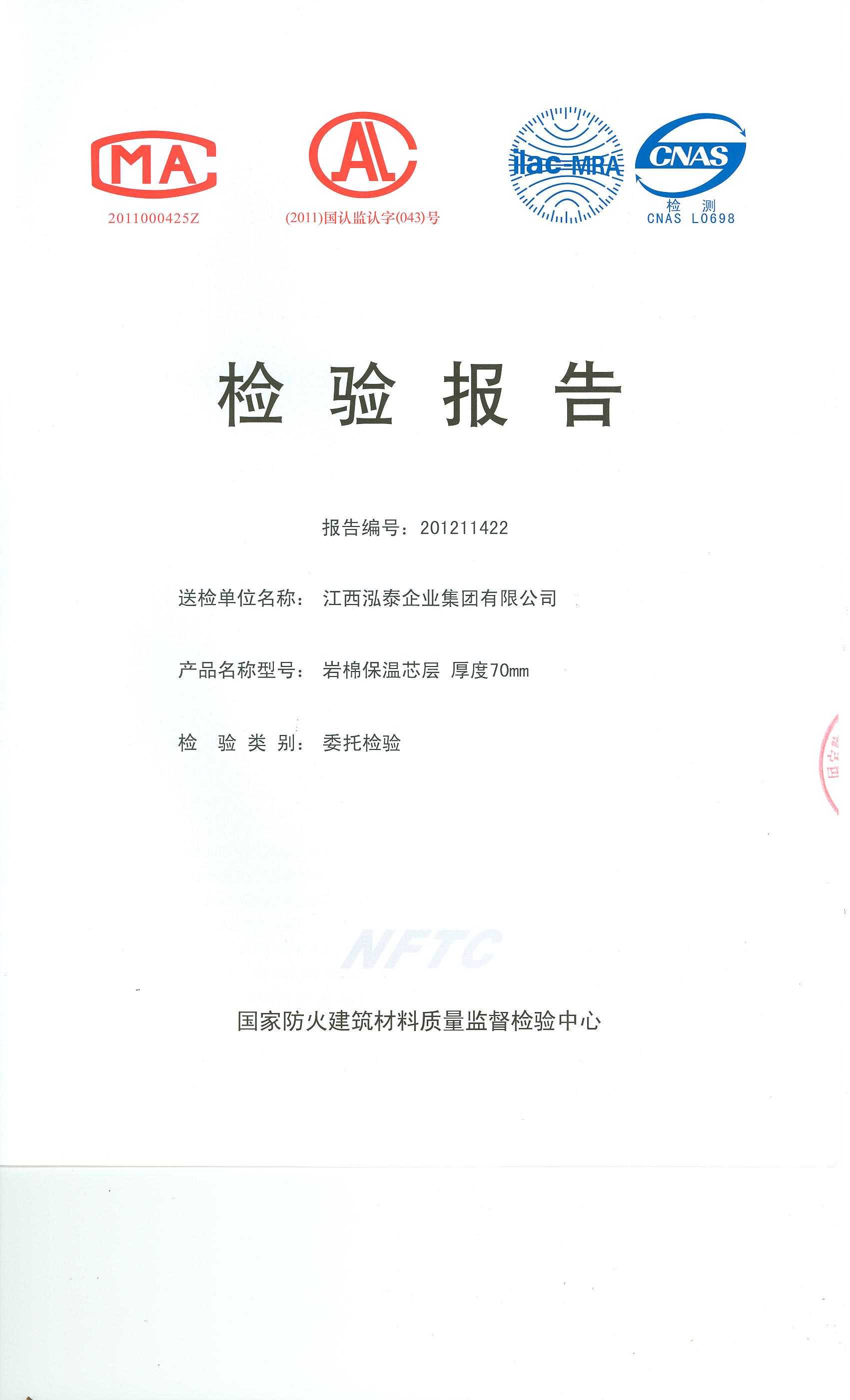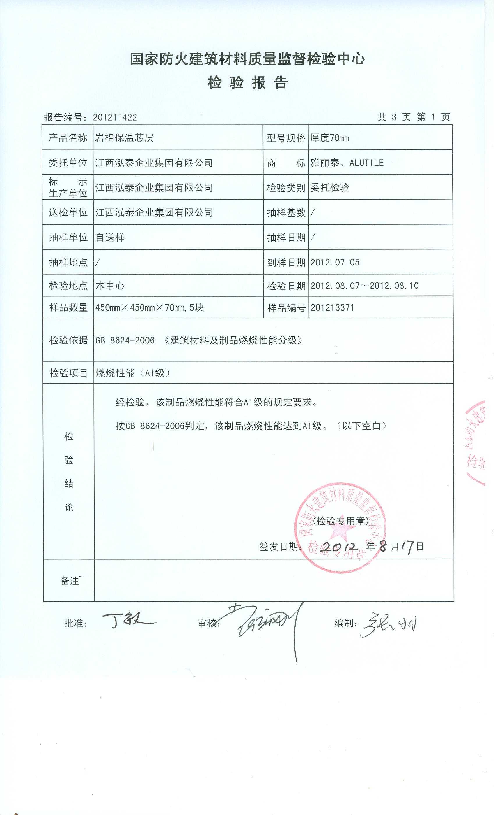 经检验,该制品燃烧性能符合A1级的规定要求。 按GB 8624-2006判定,该制品燃烧性能达到A1级。(以下空白)