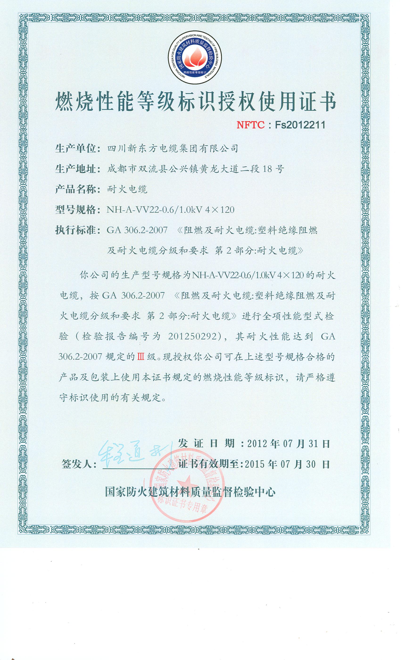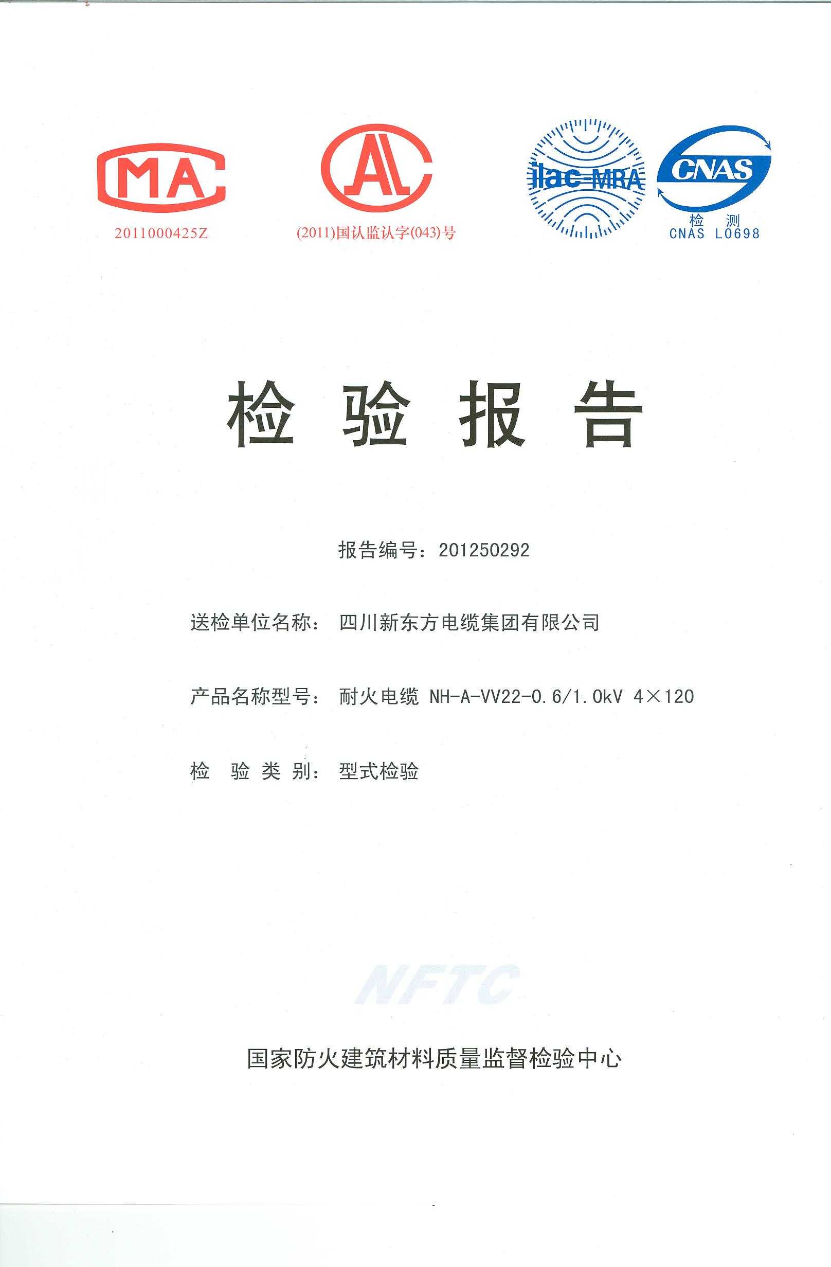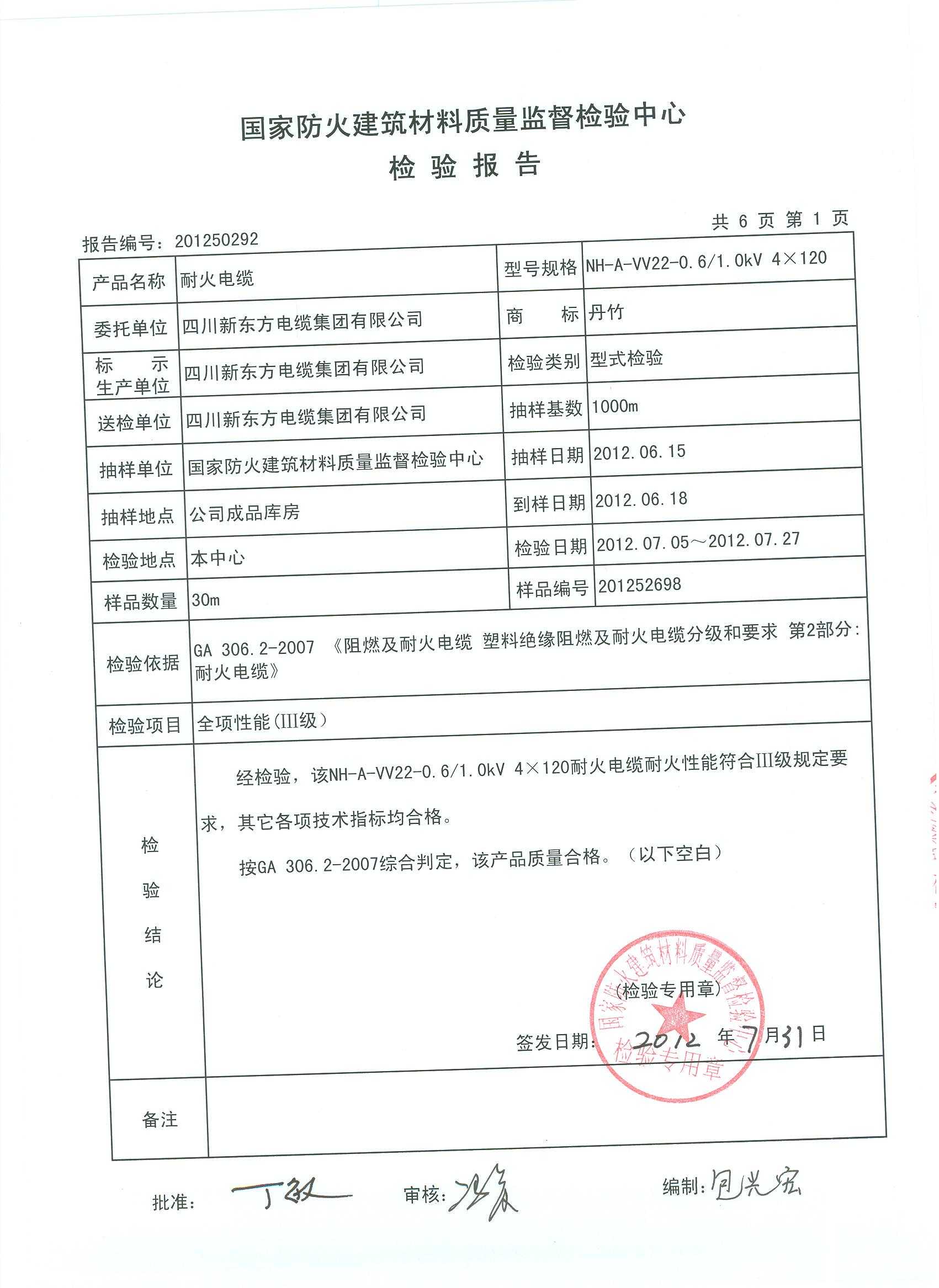 经检验,该NH-A-VV22-0.6/1.0kV 4×120耐火电缆耐火性能符合Ⅲ级规定要求,其它各项技术指标均合格。 按GA 306.2-2007综合判定,该产品质量合格。(以下空白)