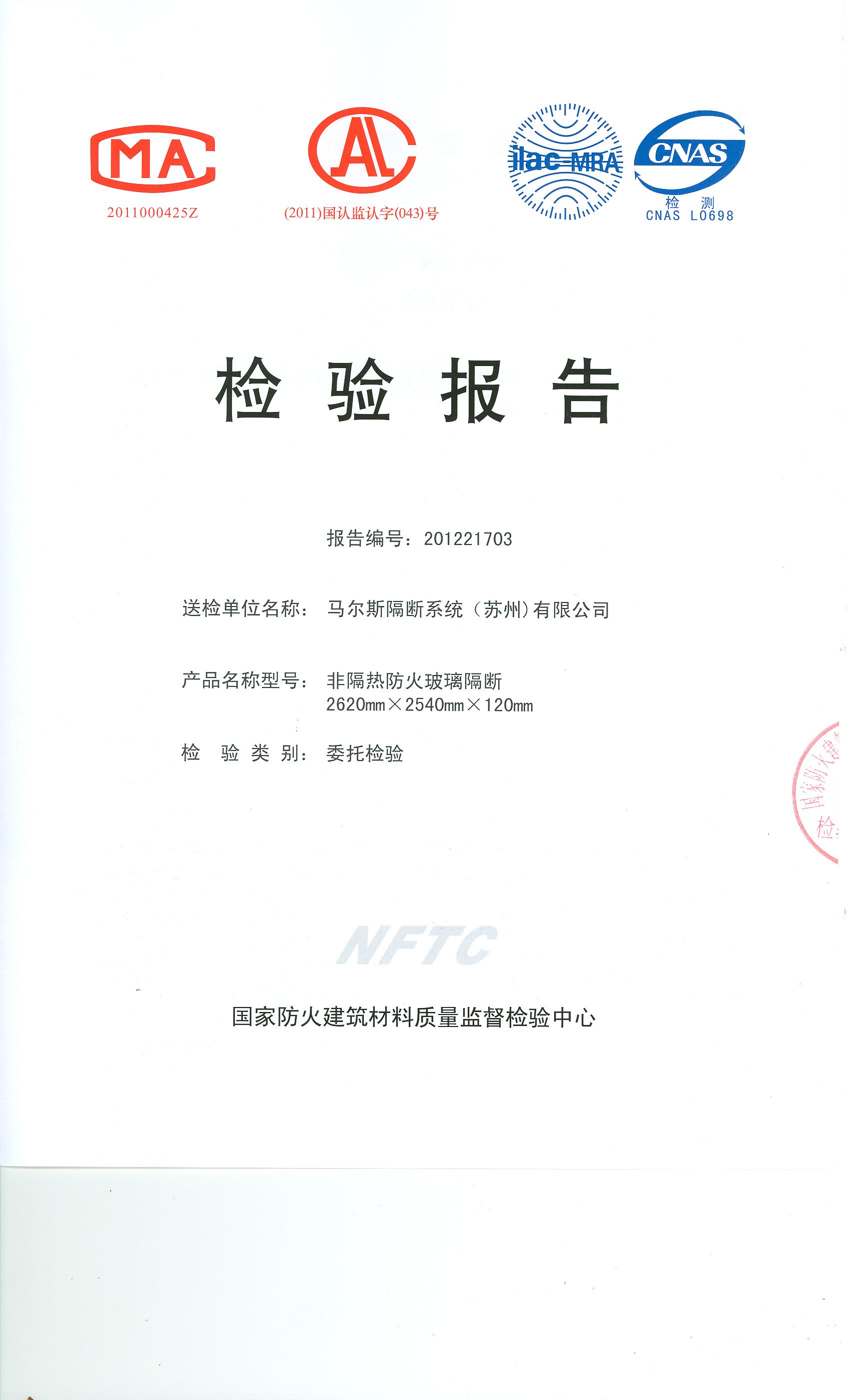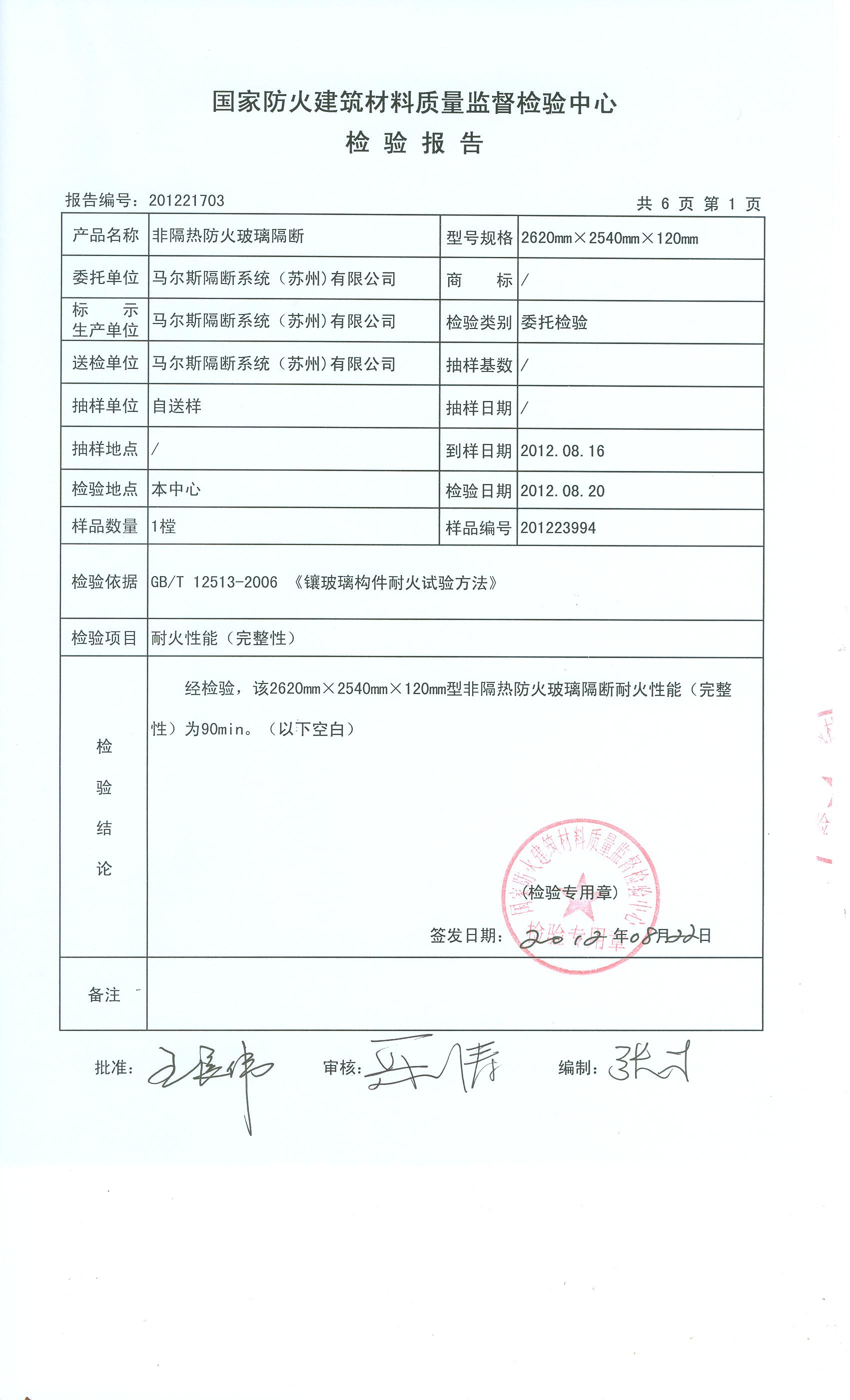 经检验,该2620mm×2540mm×120mm型非隔热防火玻璃隔断耐火性能(完整性)为90min。(以下空白)