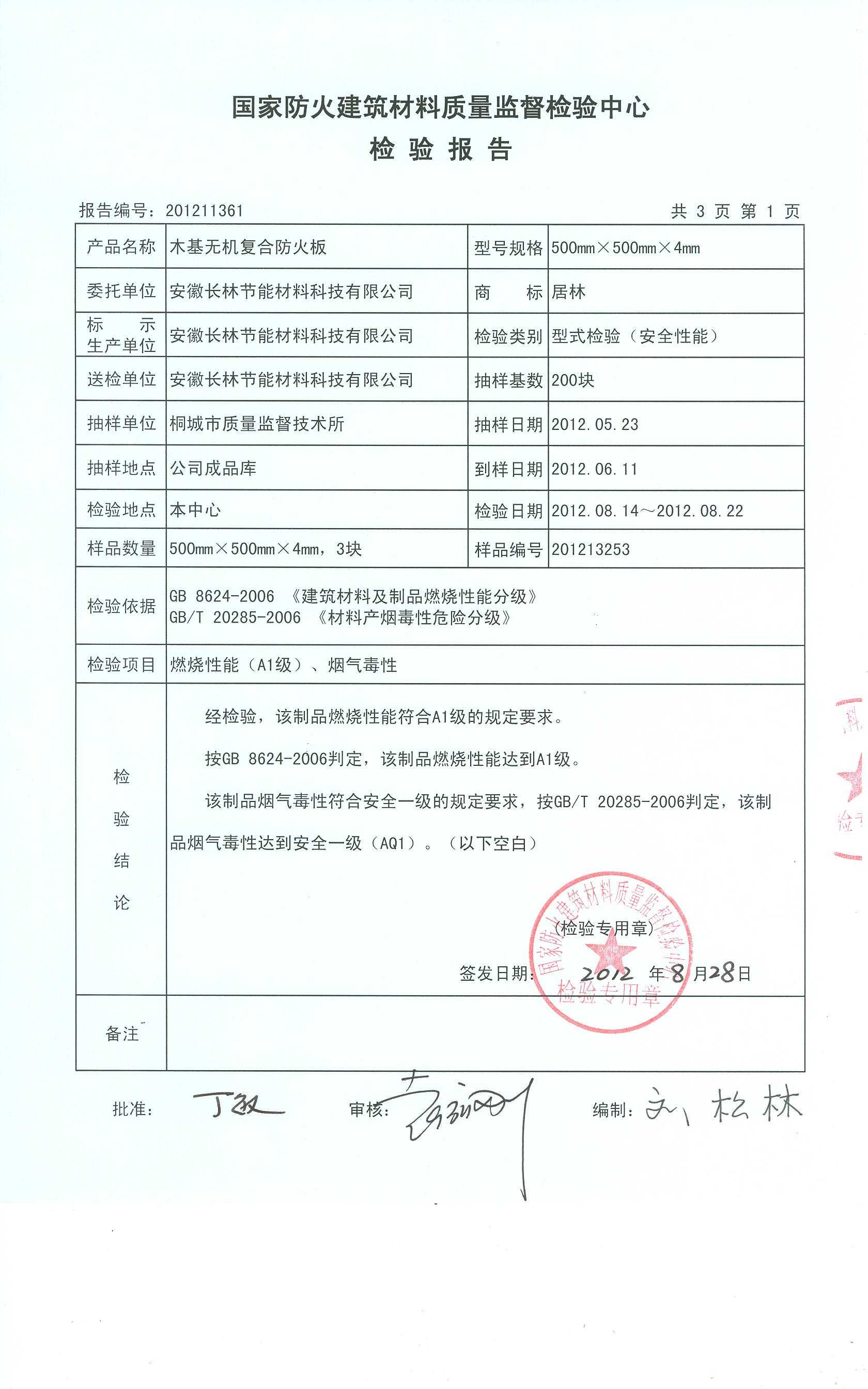 经检验,该制品燃烧性能符合A1级的规定要求。 按GB 8624-2006判定,该制品燃烧性能达到A1级。 该制品烟气毒性符合安全一级的规定要求,按GB/T 20285-2006判定,该制品烟气毒性达到安全一级(AQ1)。(以下空白)