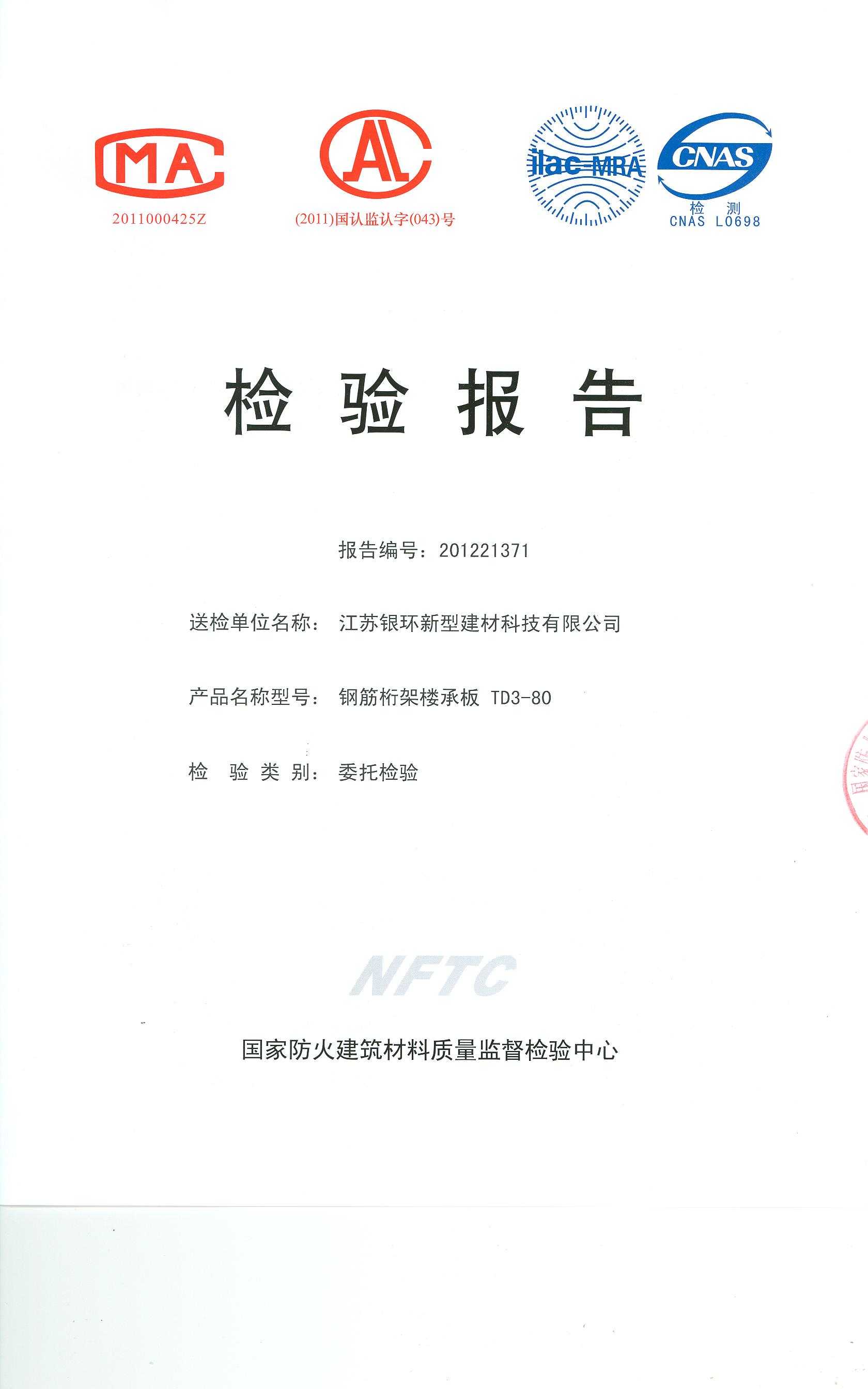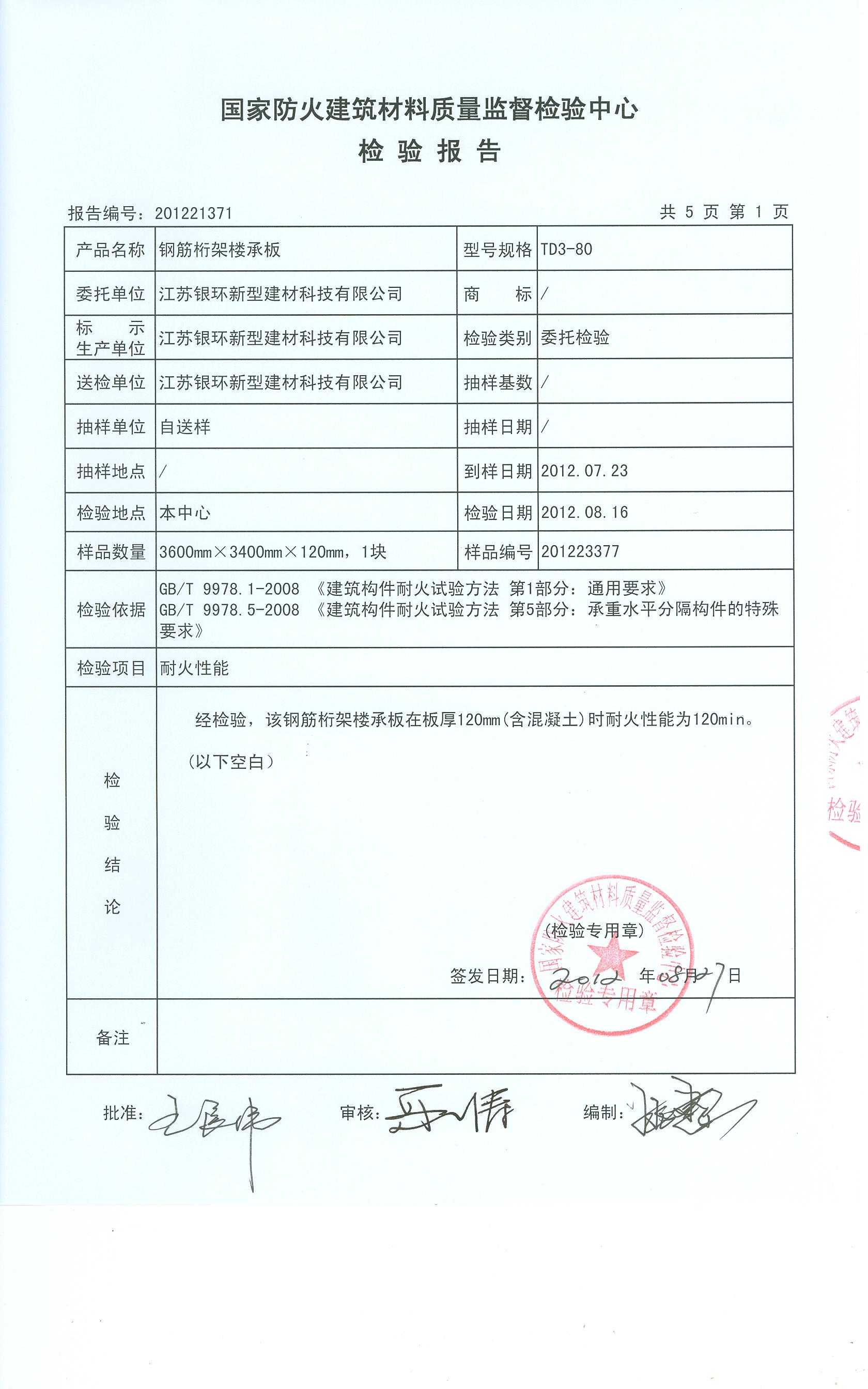 经检验,该钢筋桁架楼承板在板厚120mm(含混凝土)时耐火性能为120min。 (以下空白)