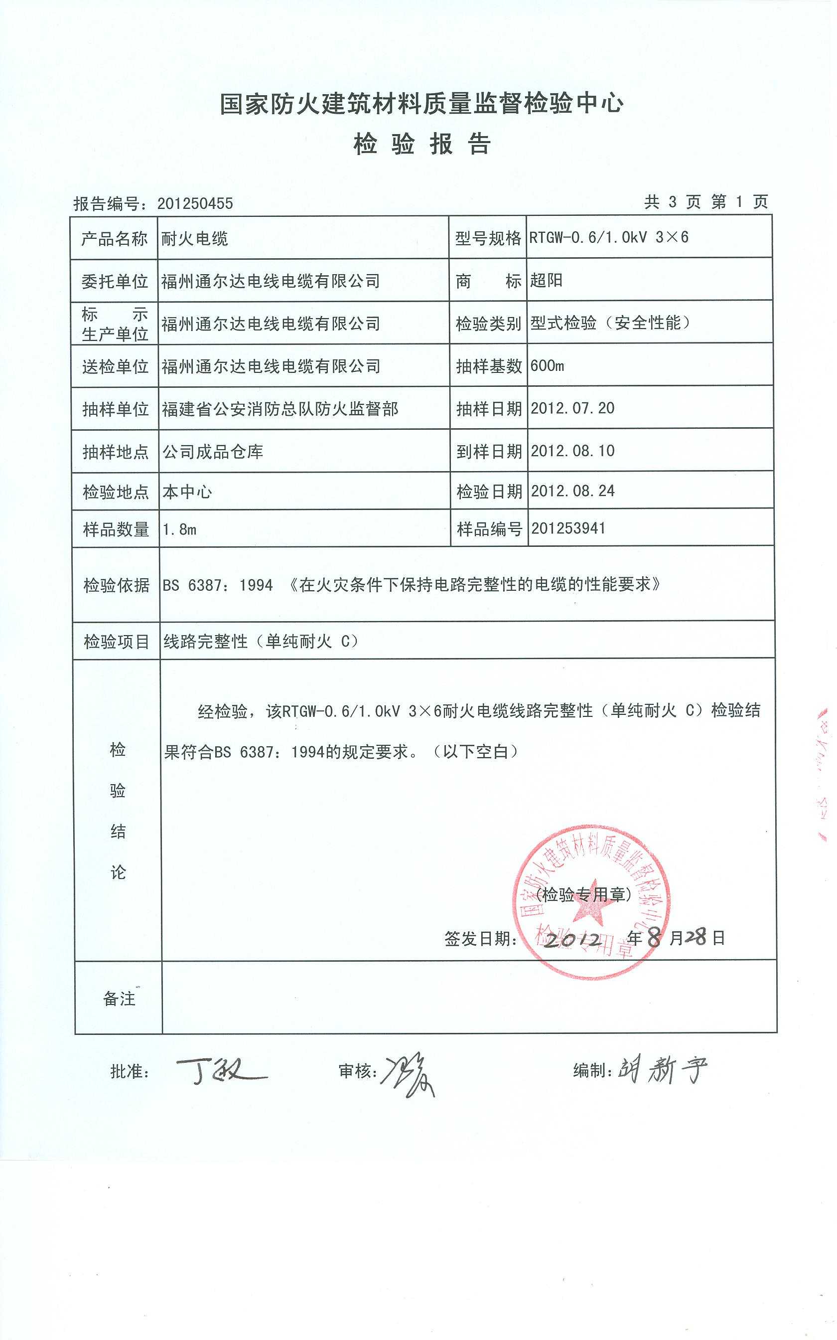 经检验,该RTGW-0.6/1.0kV 3×6耐火电缆线路完整性(单纯耐火 C)检验结果符合BS 6387:1994的规定要求。(以下空白)