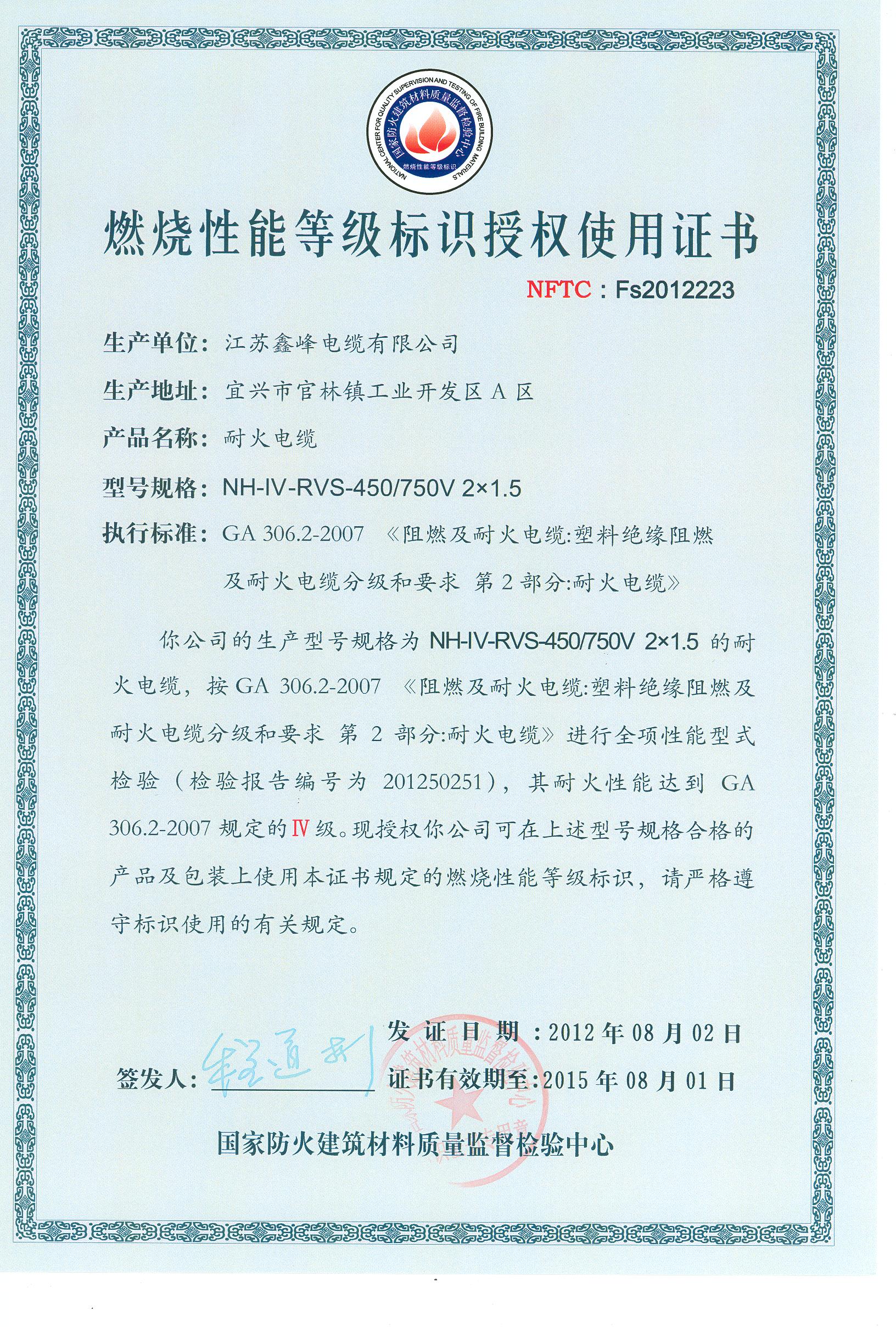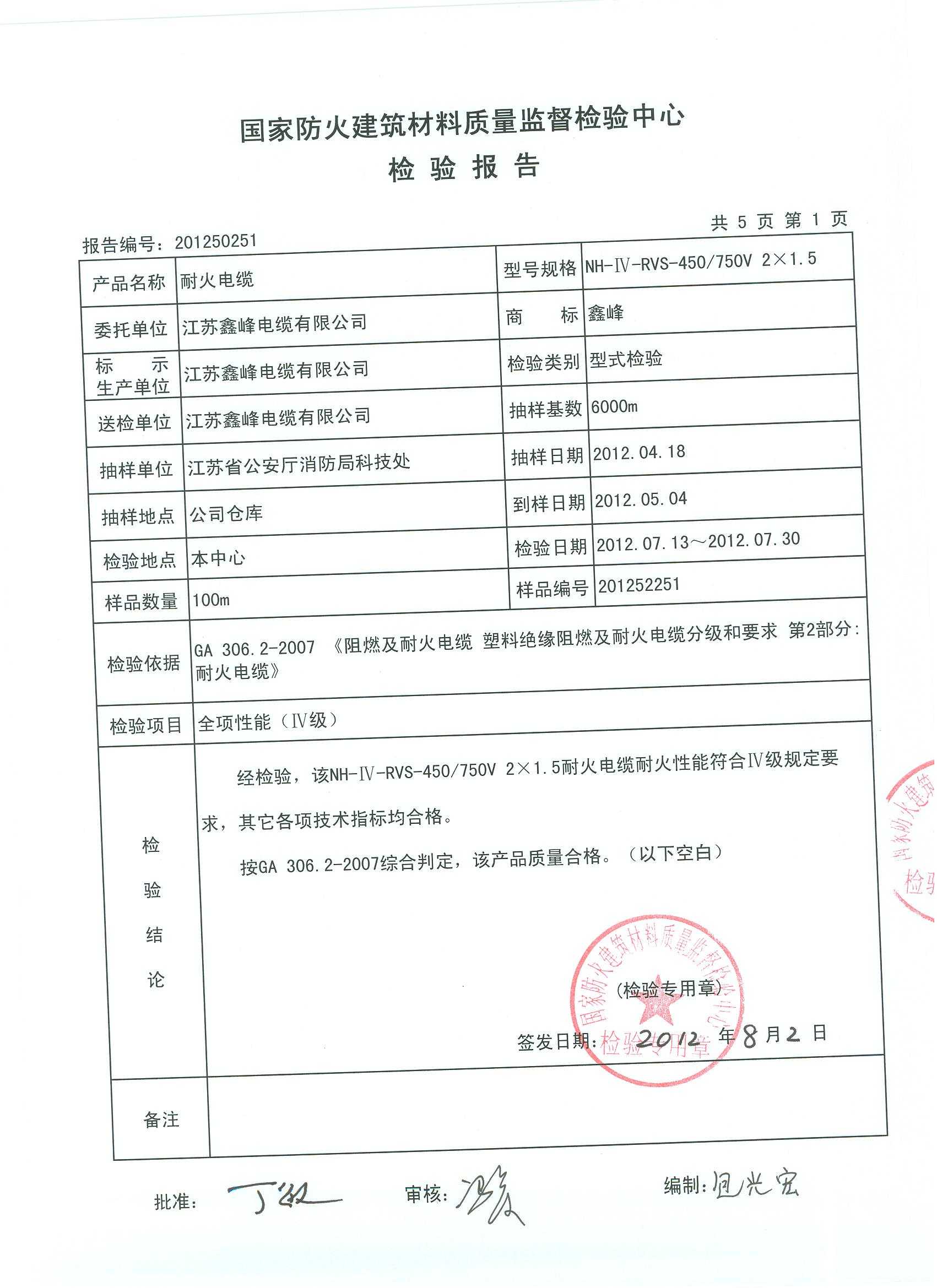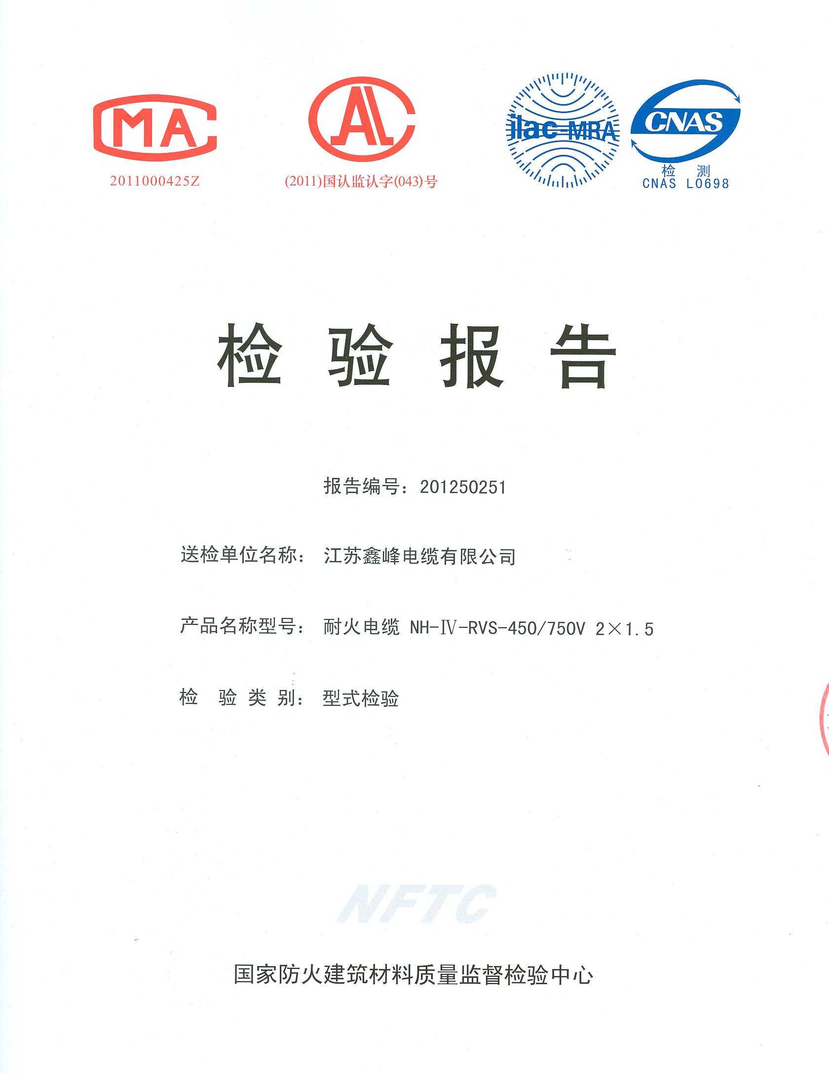 经检验,该NH-Ⅳ-RVS-450/750V 2×1.5耐火电缆耐火性能符合Ⅳ级规定要求,其它各项技术指标均合格。 按GA 306.2-2007综合判定,该产品质量合格。(以下空白)