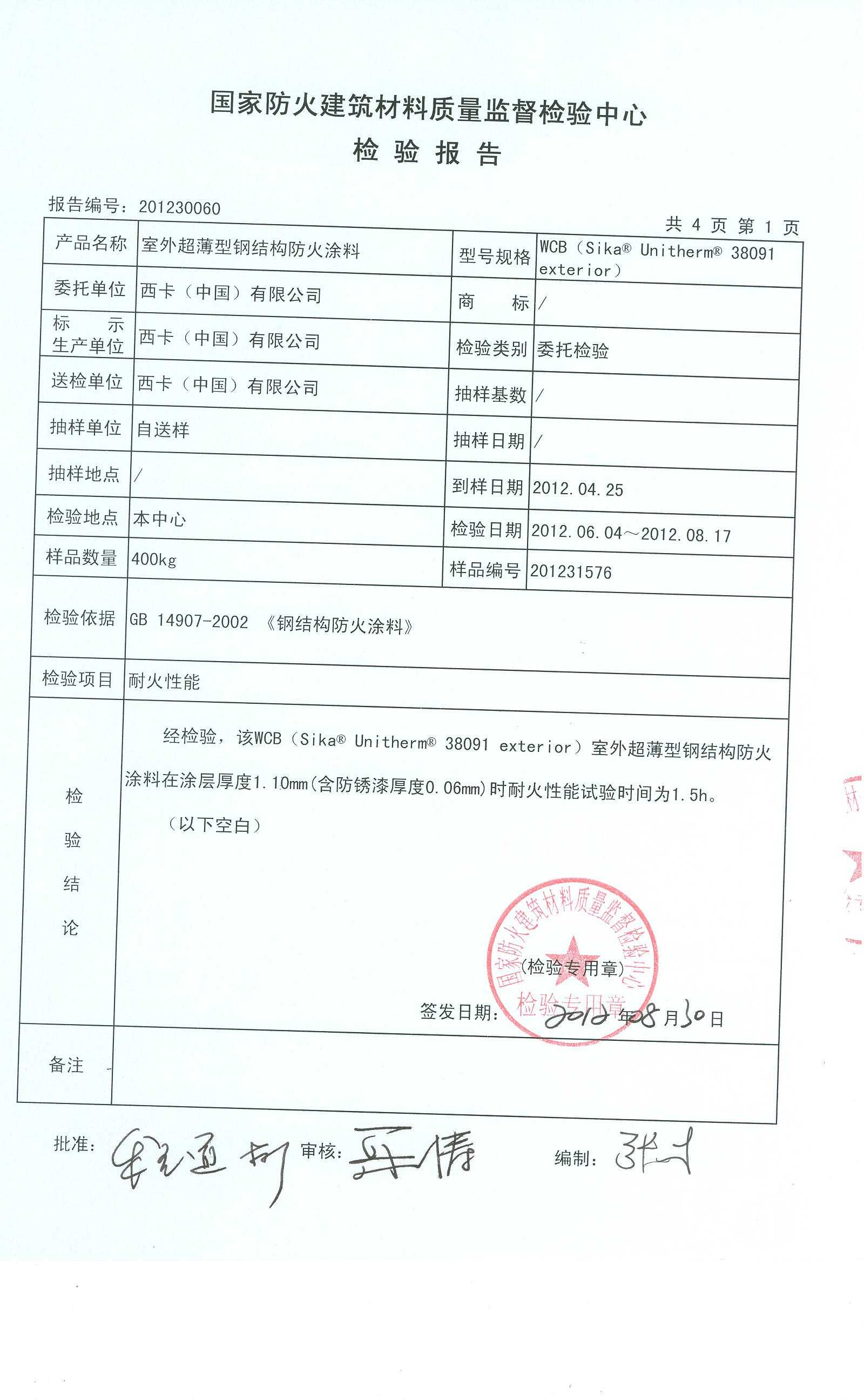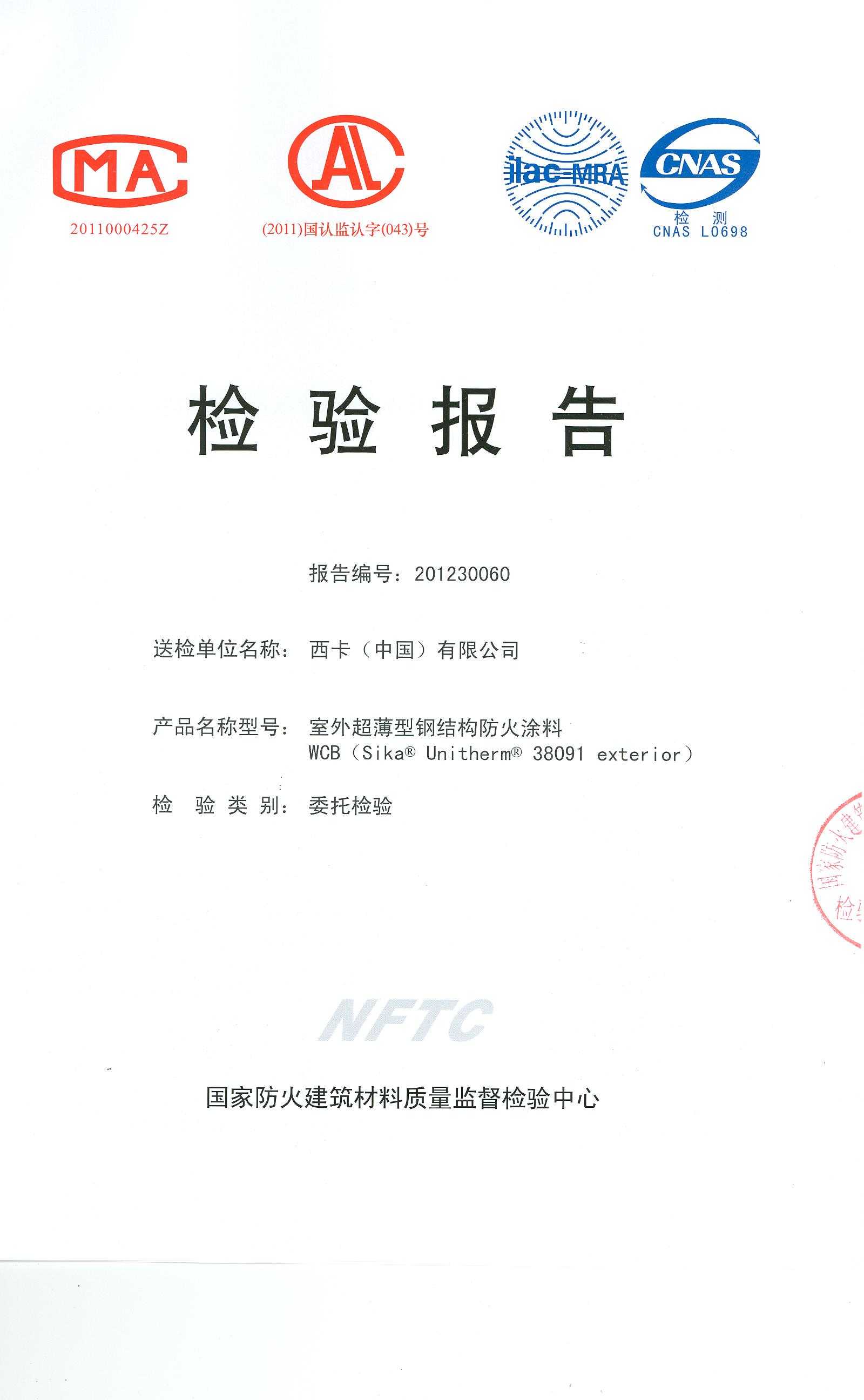 经检验,该WCB(Sika? Unitherm? 38091 exterior)室外超薄型钢结构防火涂料在涂层厚度1.10mm(含防锈漆厚度0.06mm)时耐火性能试验时间为1.5h。 (以下空白)