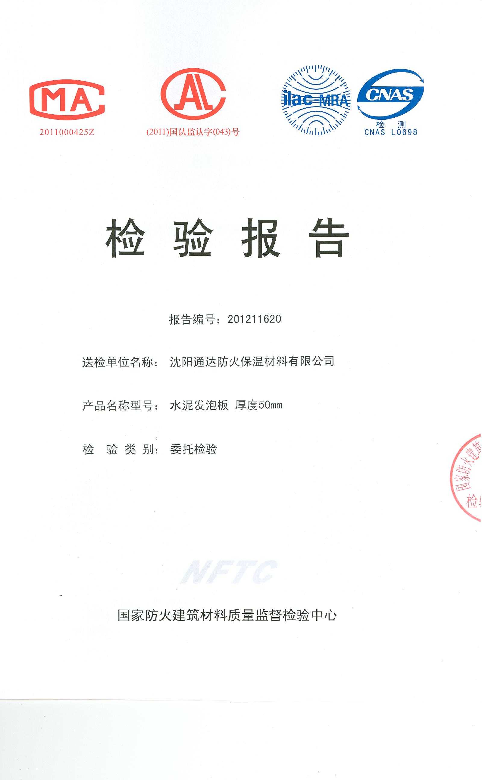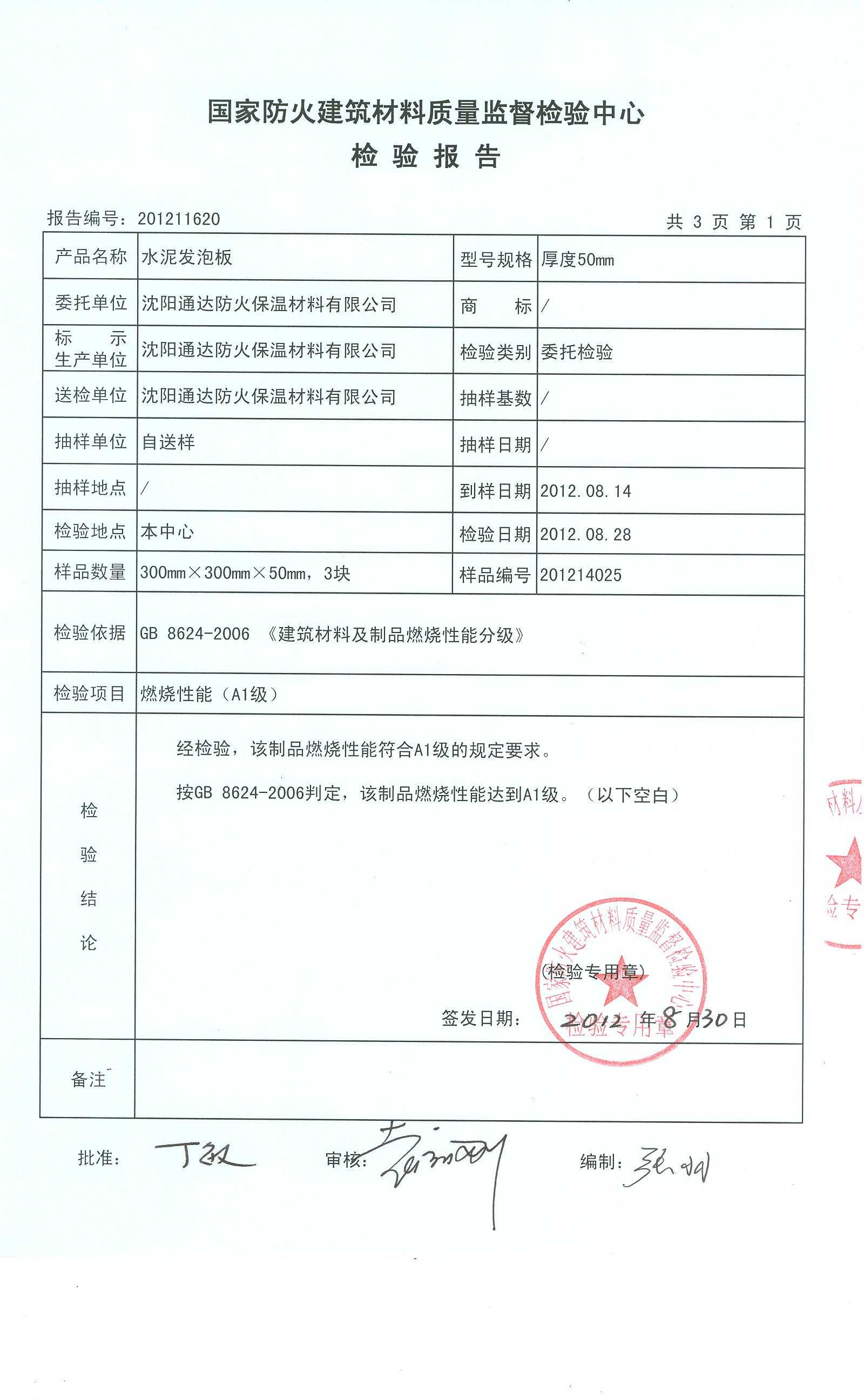 经检验,该制品燃烧性能符合A1级的规定要求。 按GB 8624-2006判定,该制品燃烧性能达到A1级。(以下空白)