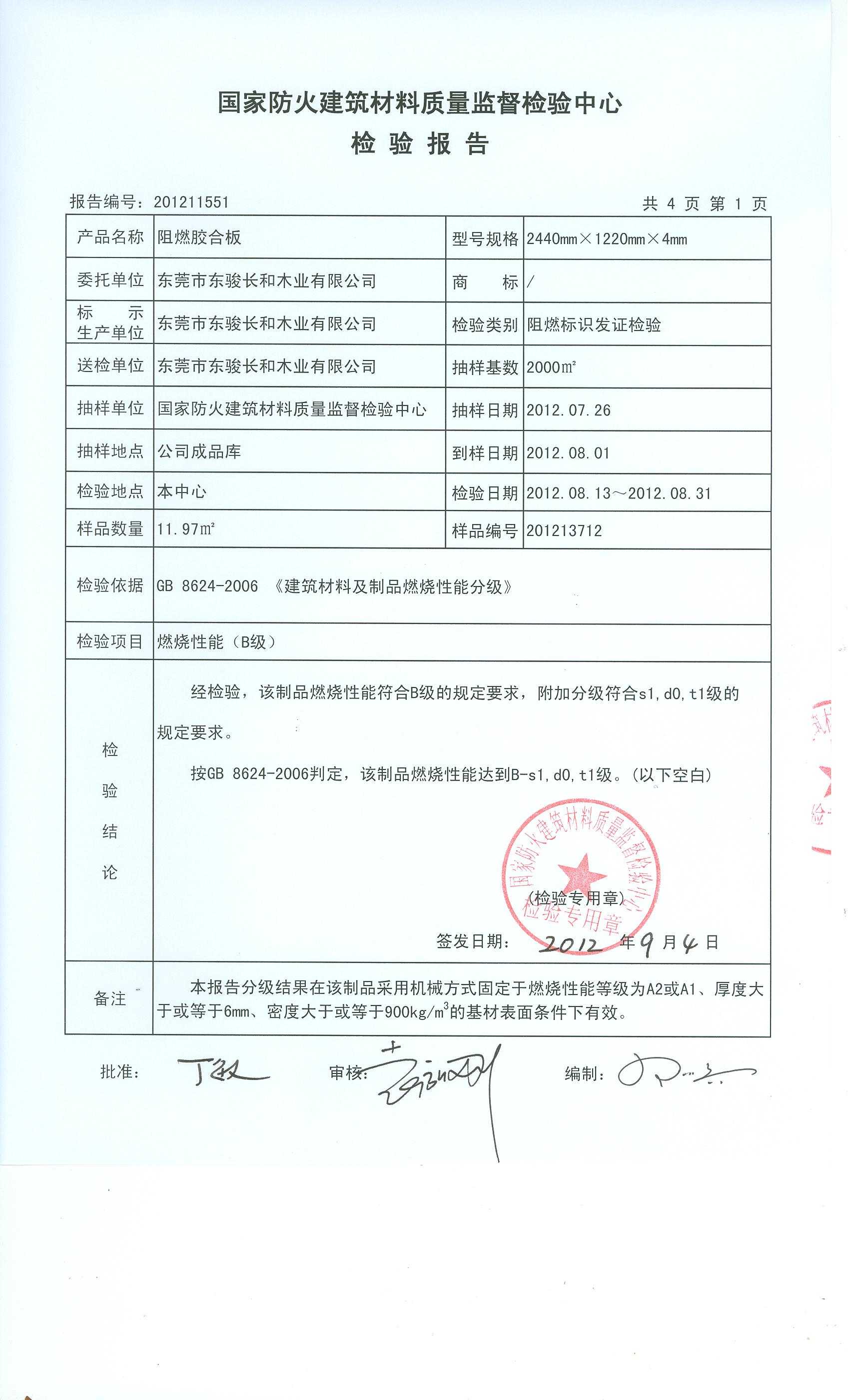 经检验,该制品燃烧性能符合B级的规定要求,附加分级符合s1,d0,t1级的 规定要求。 按GB 8624-2006判定,该制品燃烧性能达到B-s1,d0,t1级。(以下空白)