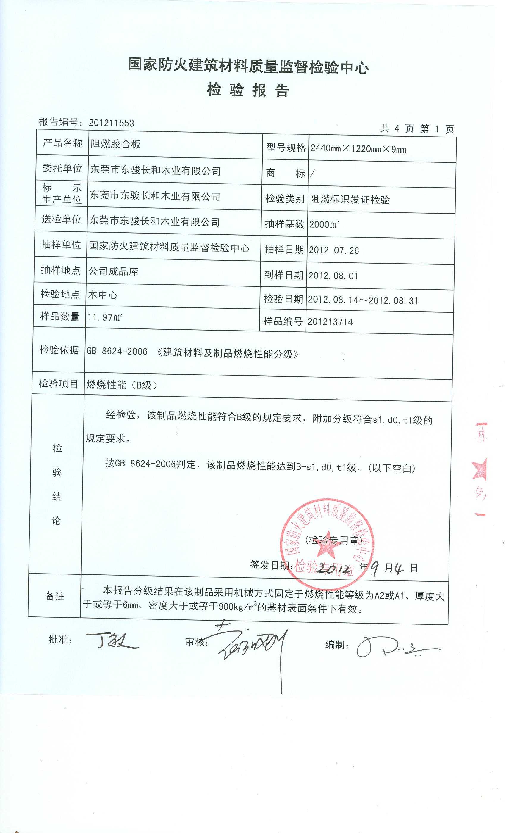 经检验,该制品燃烧性能符合B级的规定要求,附加分级符合s1,d0,t1级的 规定要求。 按GB 8624-2006判定,该制品燃烧性能达到B-s1,d0,t1级。(以下空白)