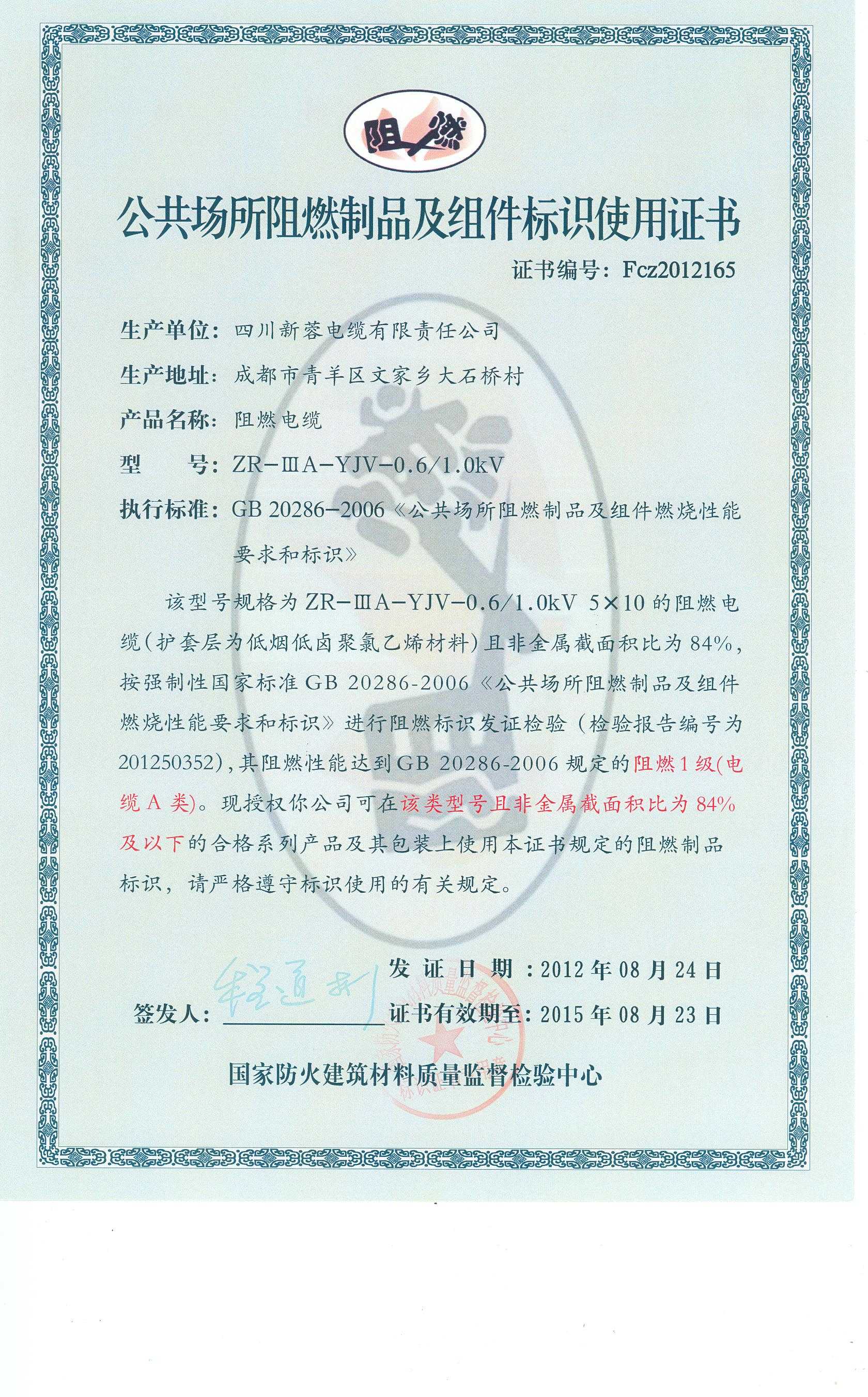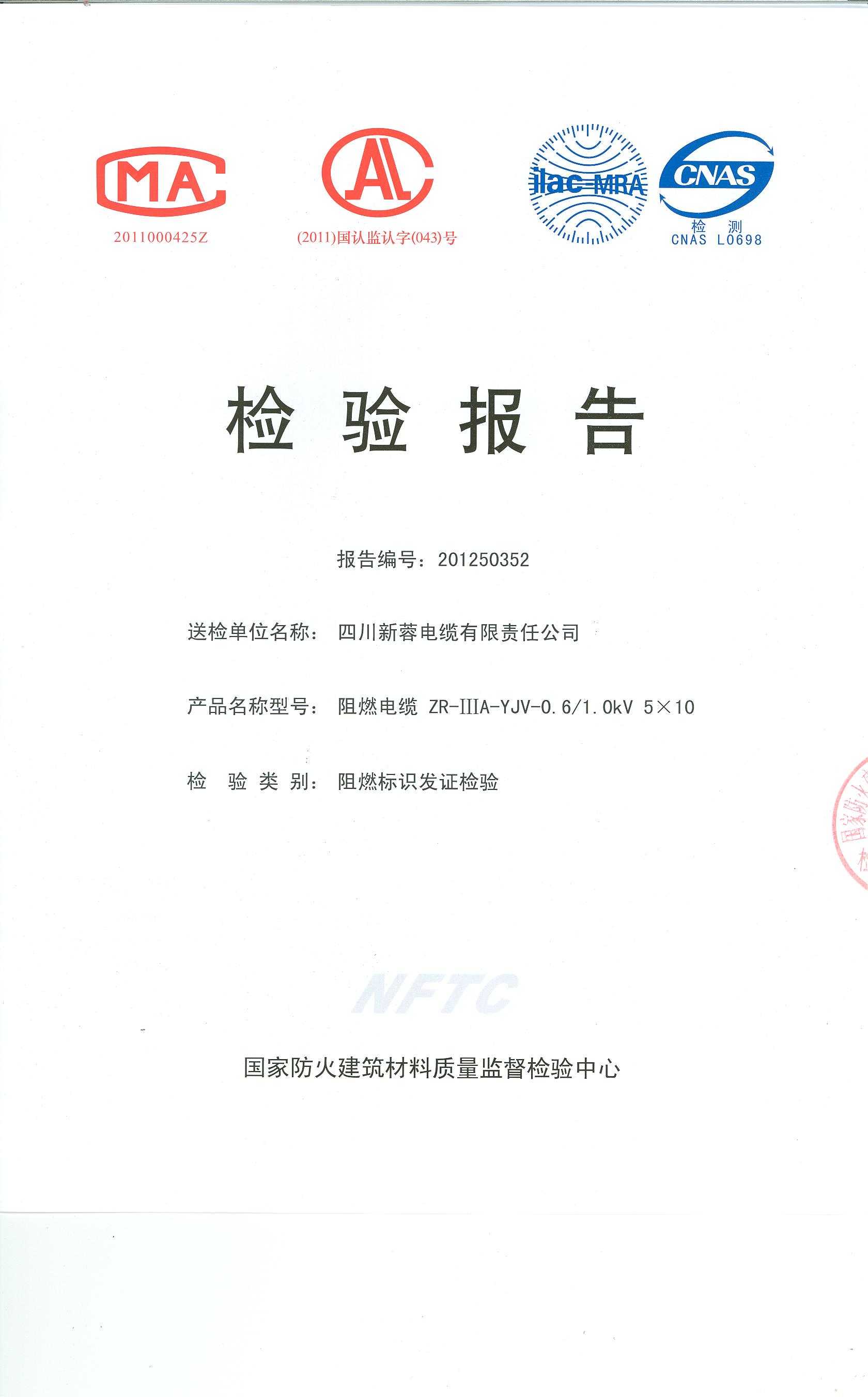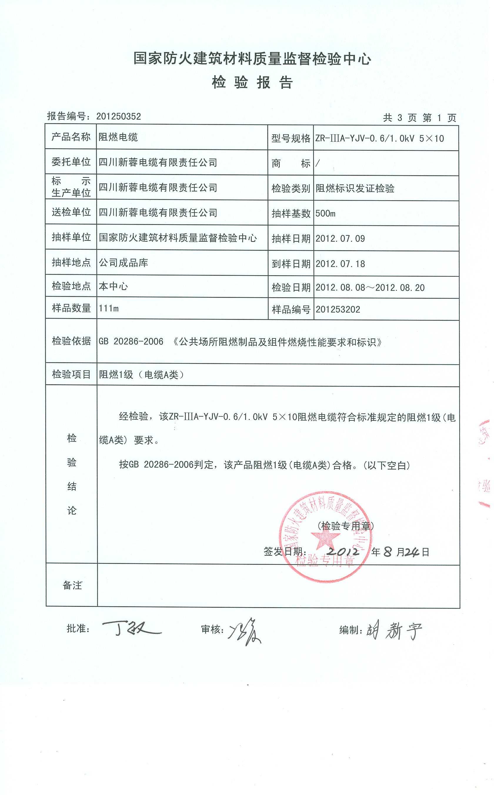经检验,该ZR-ⅢA-YJV-0.6/1.0kV 5×10阻燃电缆符合标准规定的阻燃1级(电缆A类) 要求。 按GB 20286-2006判定,该产品阻燃1级(电缆A类)合格。(以下空白)