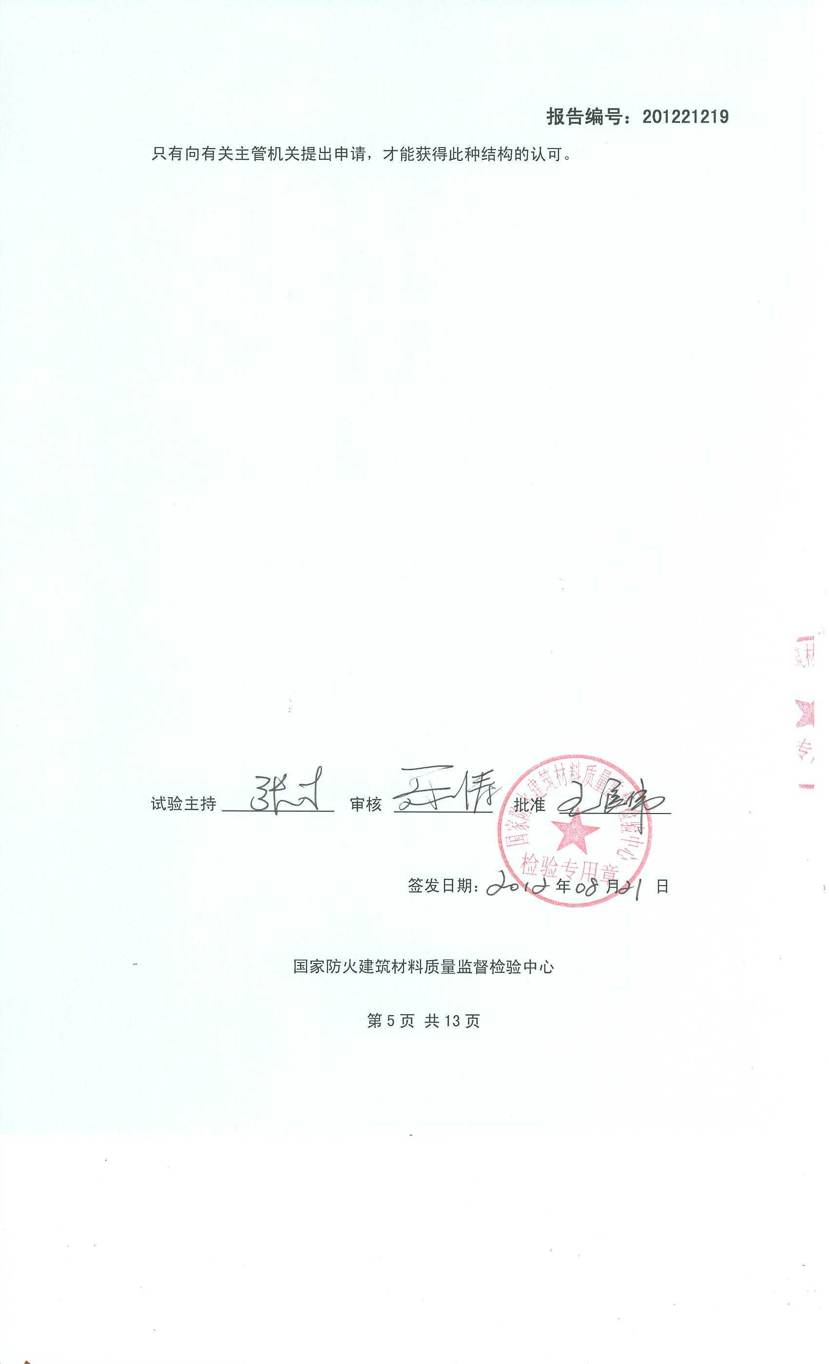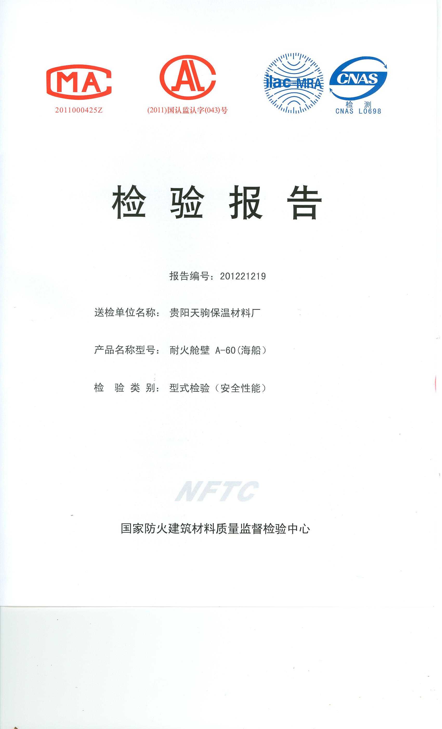 本报告所述A-60 耐火舱壁(海船)结构,按照IMO FTPC第3部分的规定,如果所有结构材料满足IMO FTPC的不燃性要求时,可认为其满足船用A-60级舱壁的要求。
