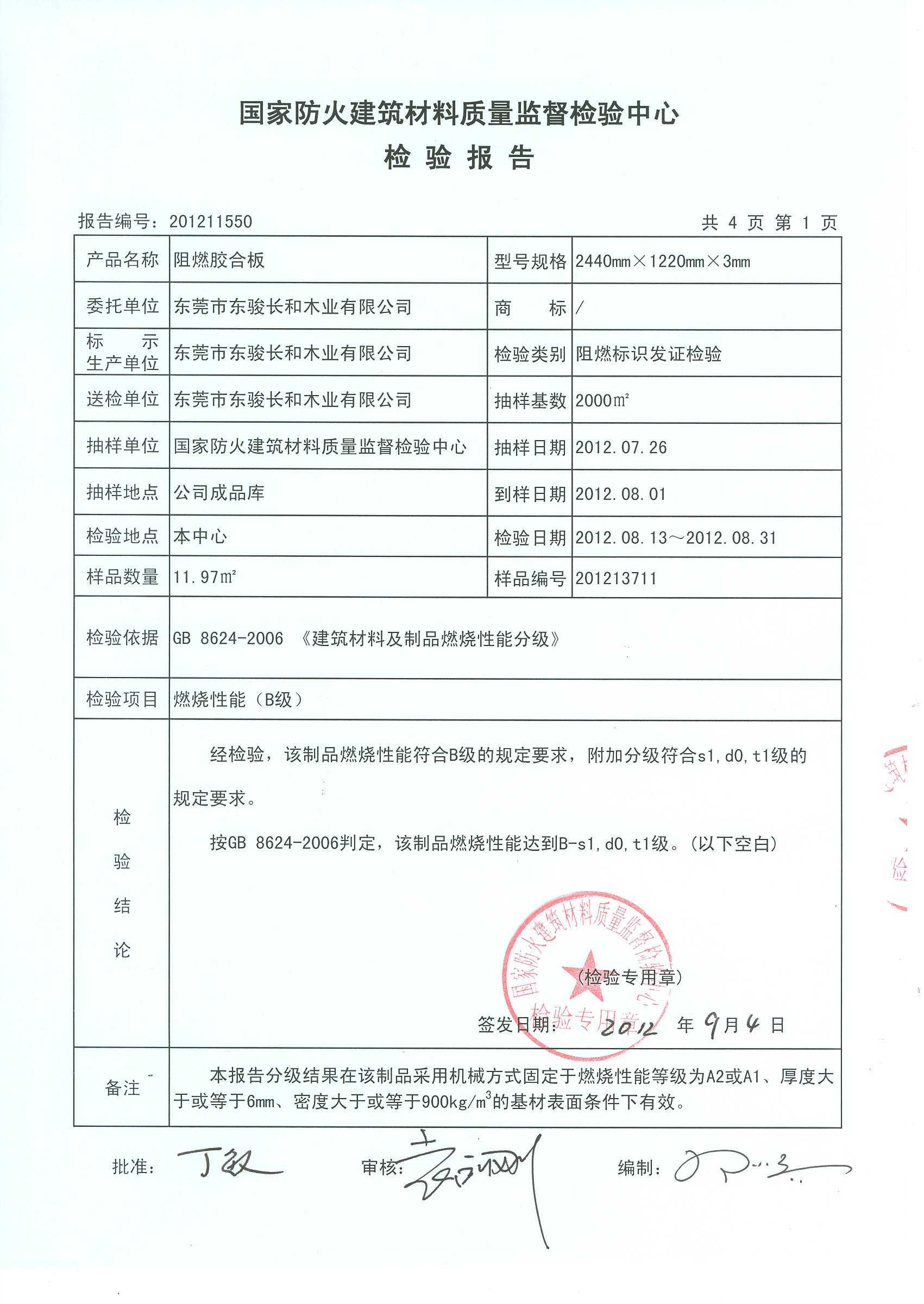 经检验,该制品燃烧性能符合B级的规定要求,附加分级符合s1,d0,t1级的 规定要求。 按GB 8624-2006判定,该制品燃烧性能达到B-s1,d0,t1级。(以下空白)