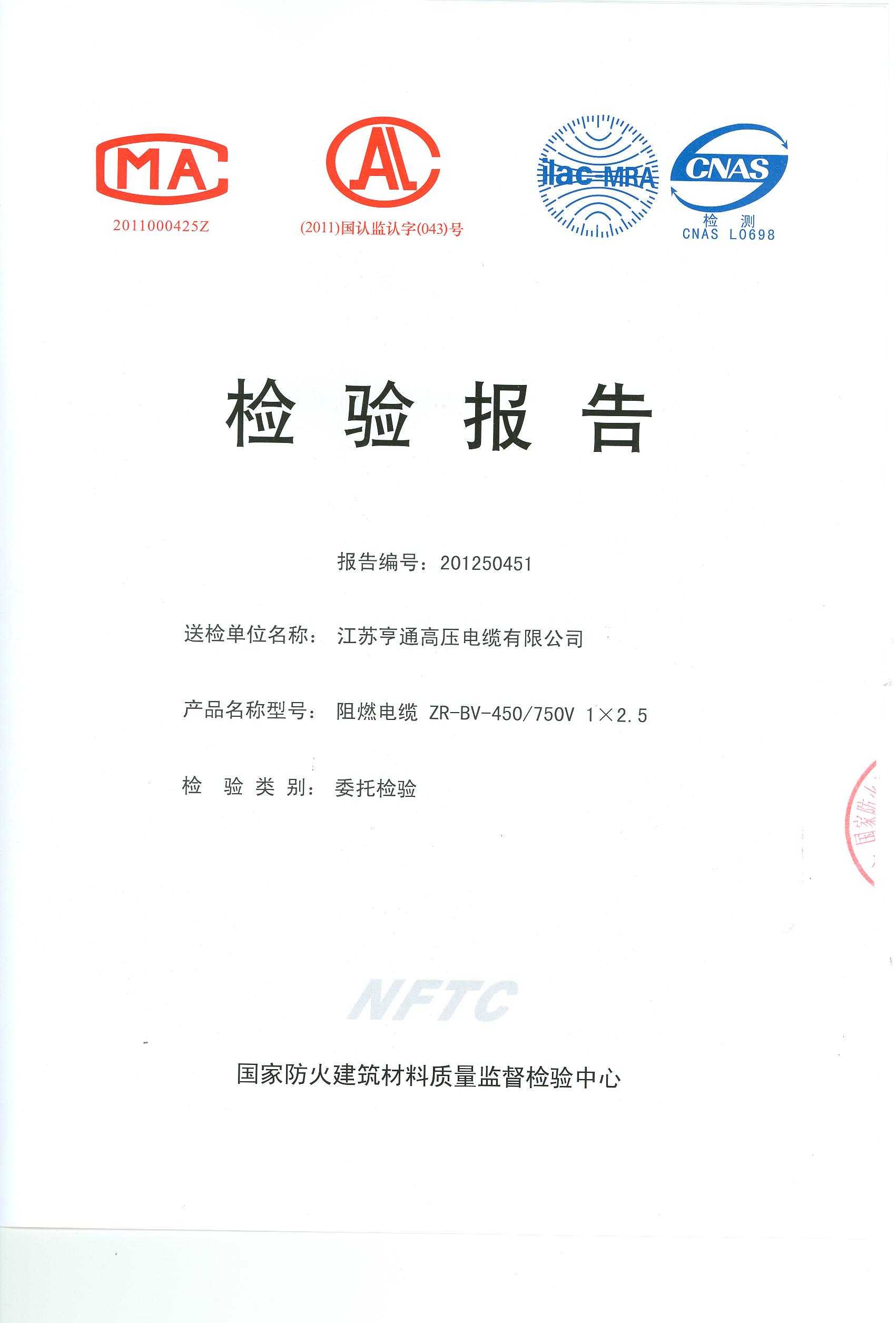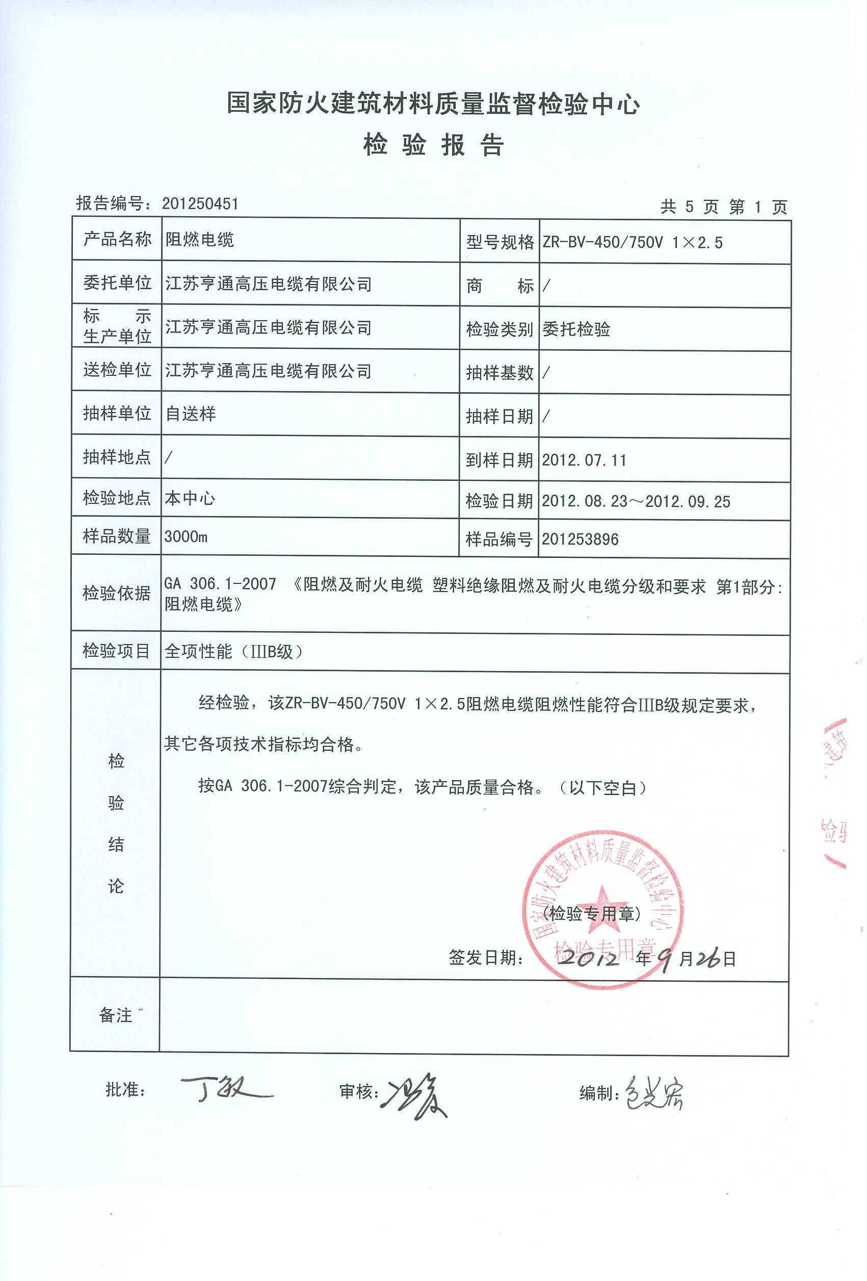 经检验,该ZR-BV-450/750V 1×2.5阻燃电缆阻燃性能符合ⅢB级规定要求,其它各项技术指标均合格。 按GA 306.1-2007综合判定,该产品质量合格。(以下空白)