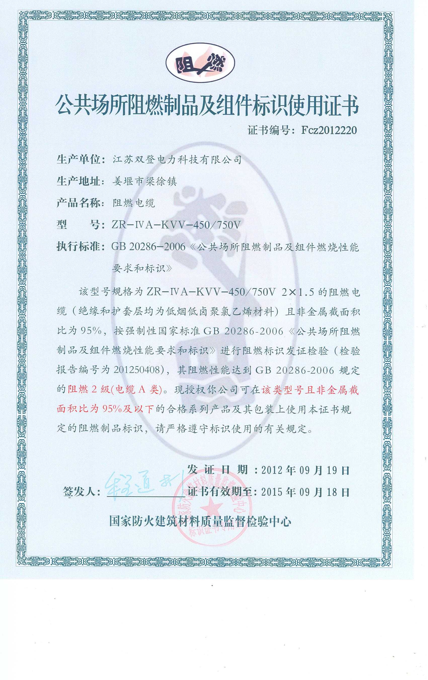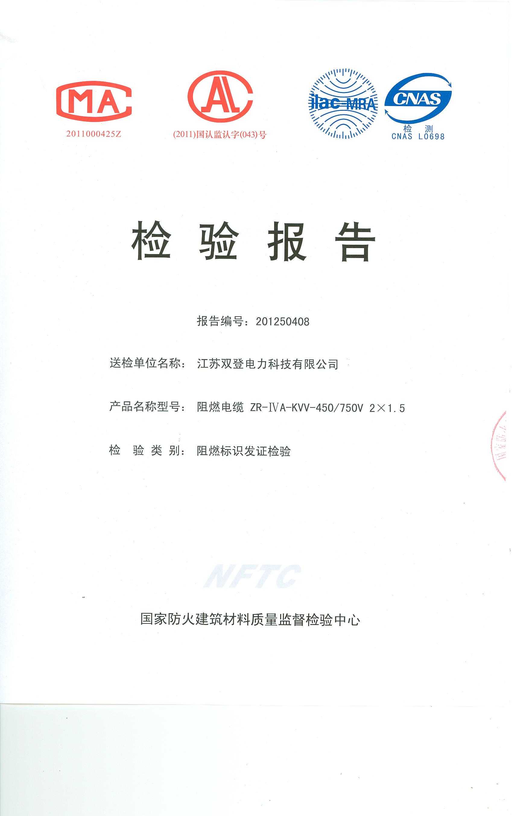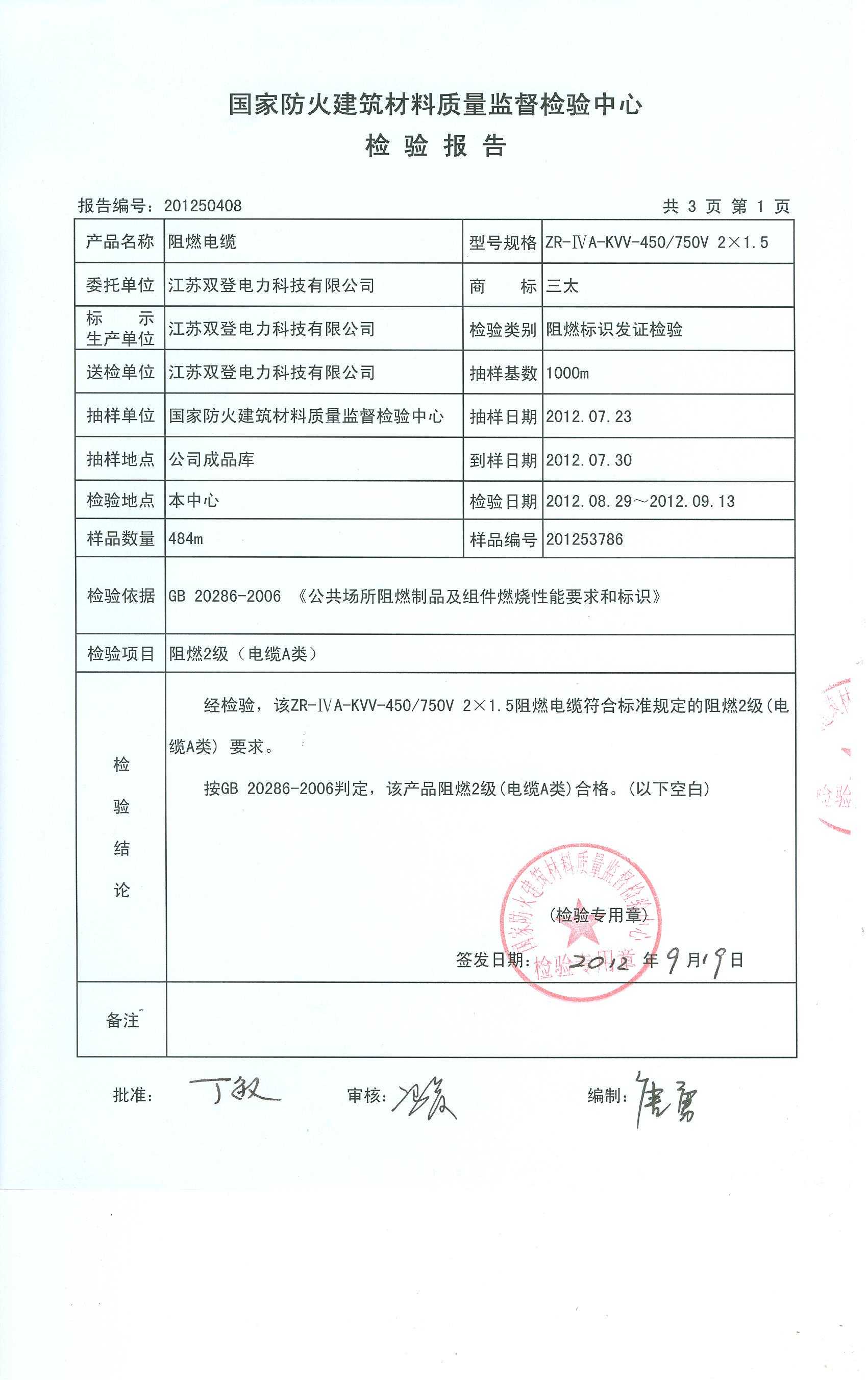 经检验,该ZR-ⅣA-KVV-450/750V 2×1.5阻燃电缆符合标准规定的阻燃2级(电缆A类) 要求。 按GB 20286-2006判定,该产品阻燃2级(电缆A类)合格。(以下空白)