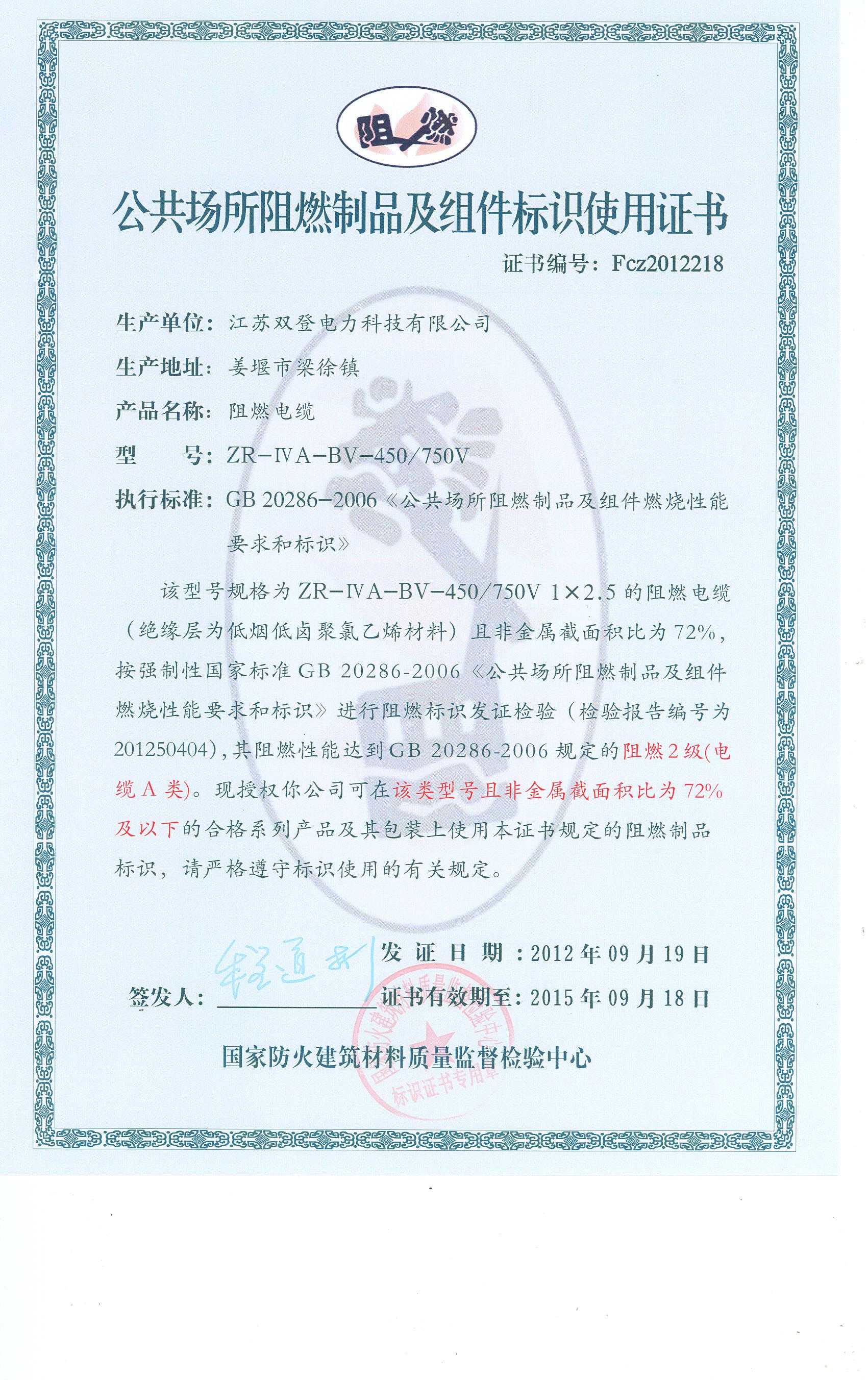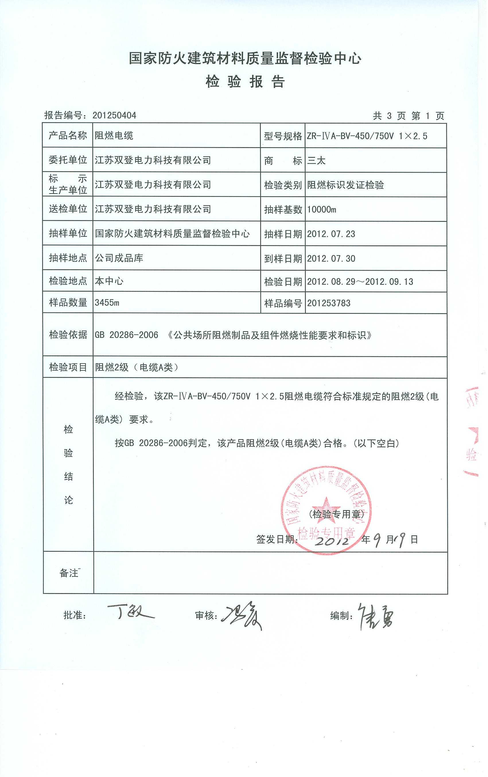 经检验,该ZR-ⅣA-BV-450/750V 1×2.5阻燃电缆符合标准规定的阻燃2级(电缆A类) 要求。 按GB 20286-2006判定,该产品阻燃2级(电缆A类)合格。(以下空白)