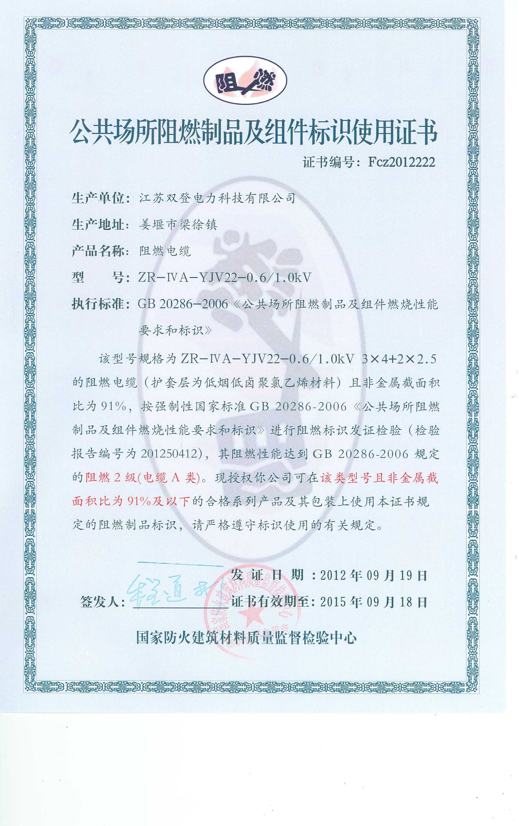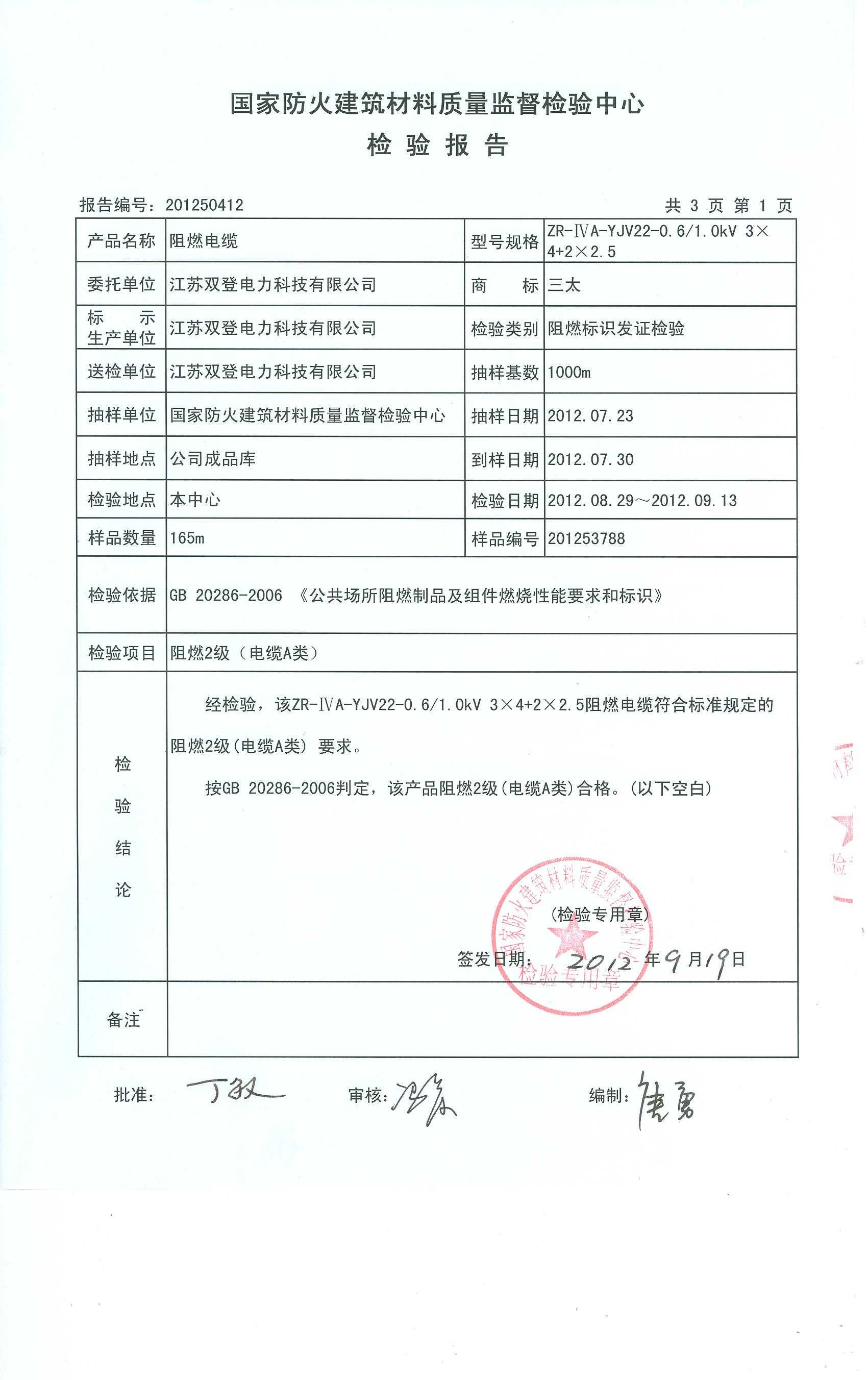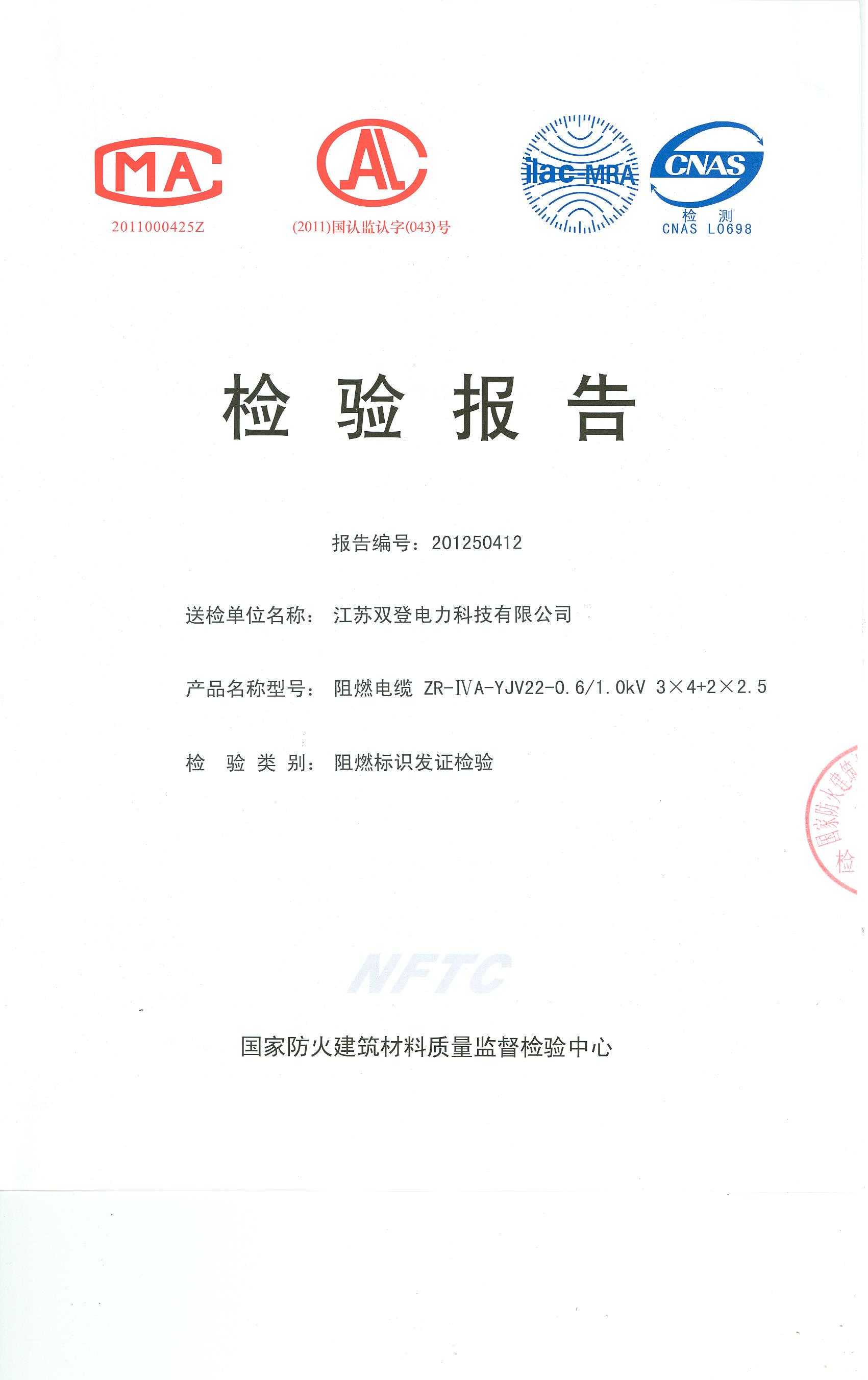 经检验,该ZR-ⅣA-YJV22-0.6/1.0kV 3×4+2×2.5阻燃电缆符合标准规定的阻燃2级(电缆A类) 要求。 按GB 20286-2006判定,该产品阻燃2级(电缆A类)合格。(以下空白)