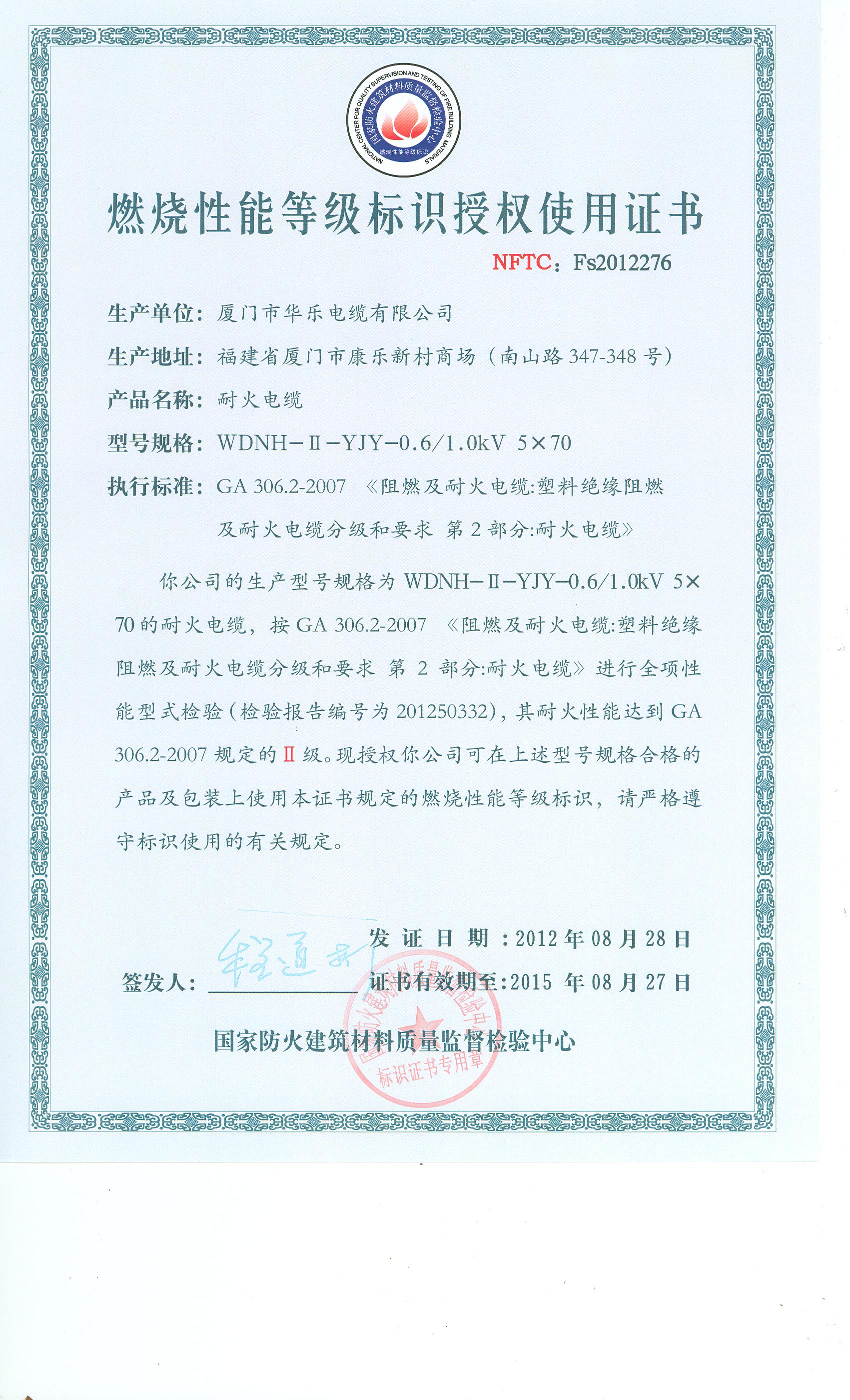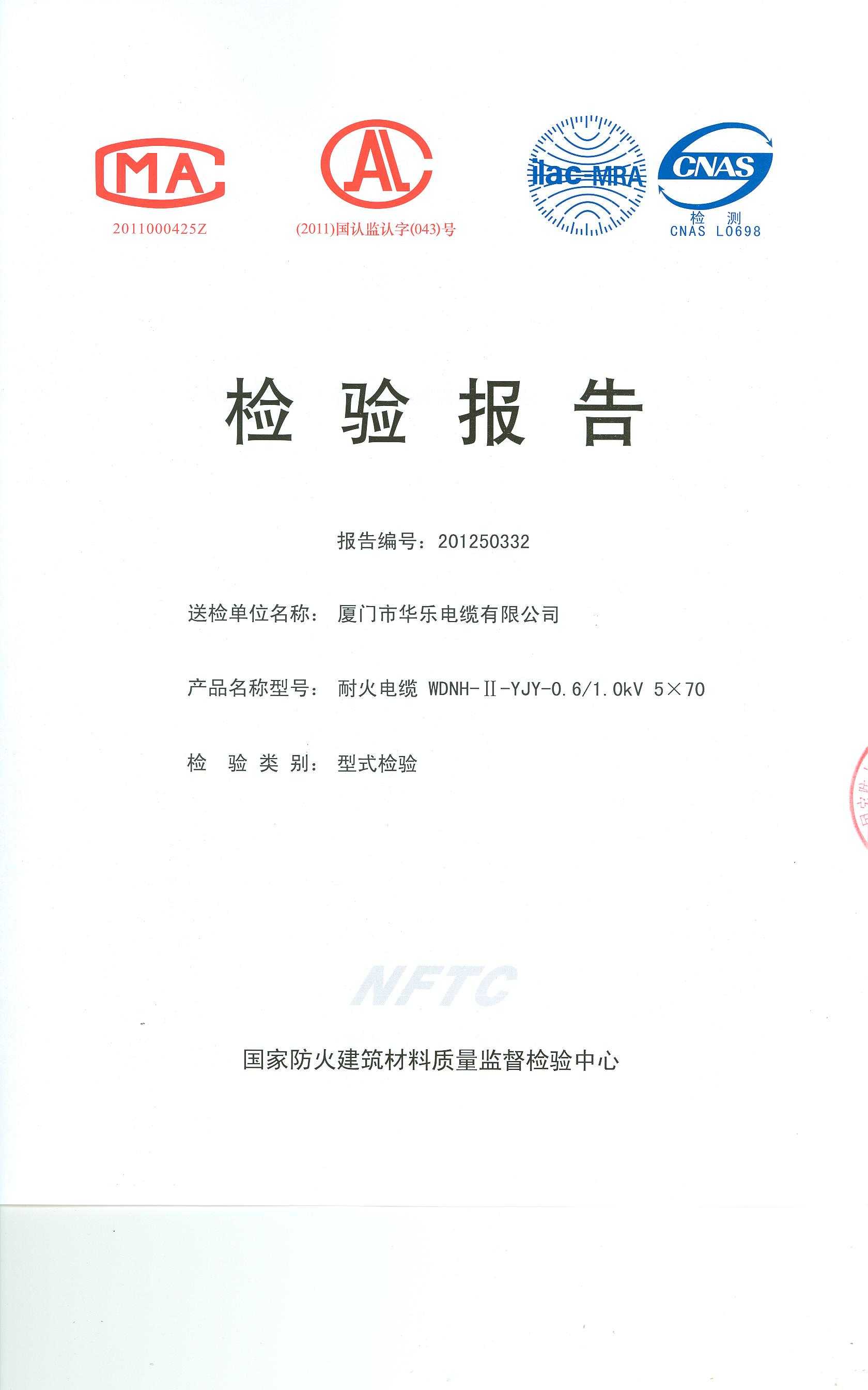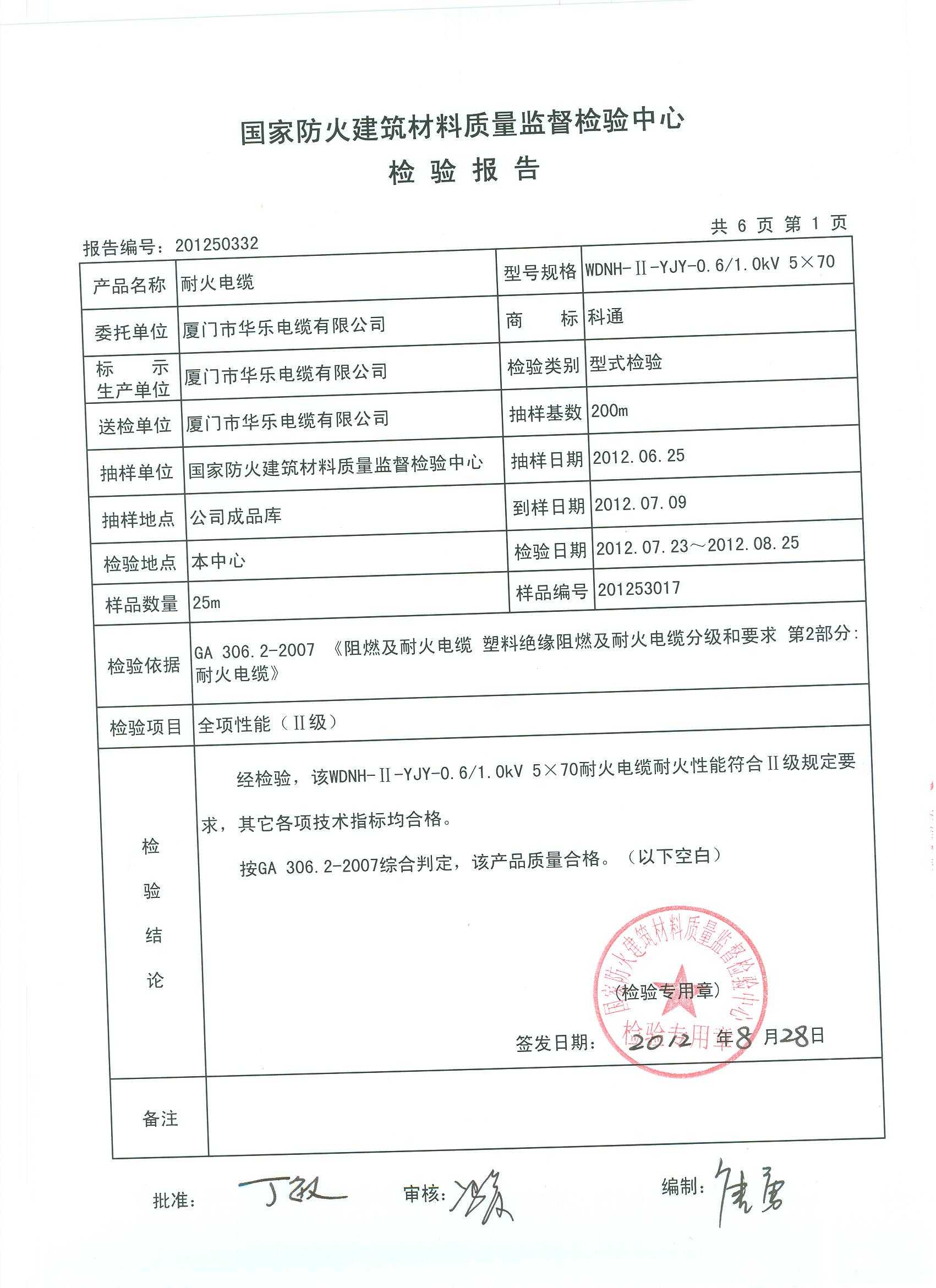经检验,该WDNH-Ⅱ-YJY-0.6/1.0kV 5×70耐火电缆耐火性能符合Ⅱ级规定要求,其它各项技术指标均合格。 按GA 306.2-2007综合判定,该产品质量合格。(以下空白)