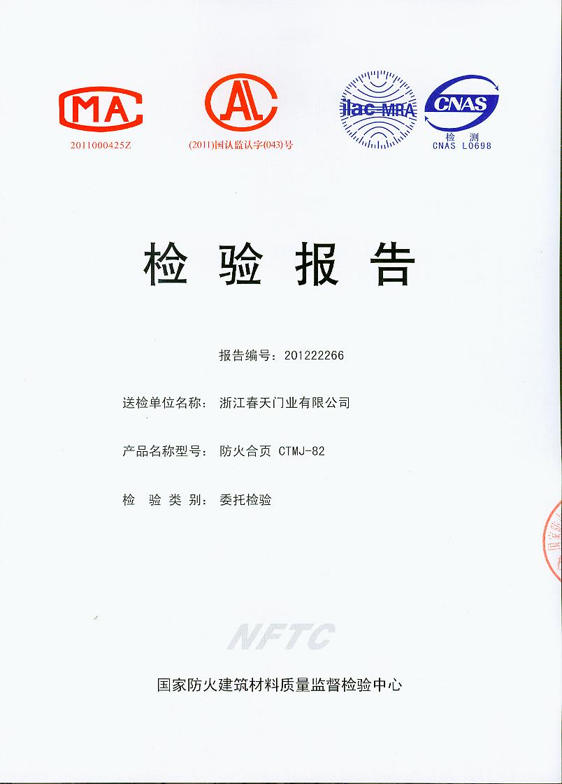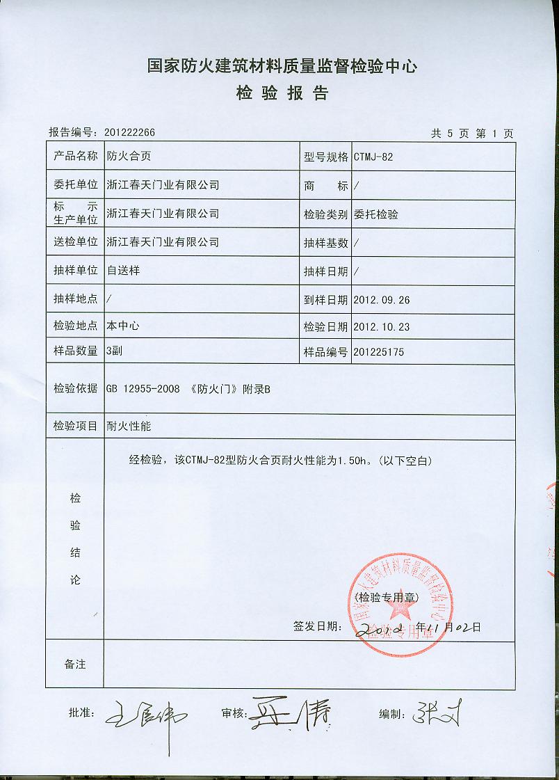 经检验,该CTMJ-82型防火合页耐火性能为1.50h。(以下空白)