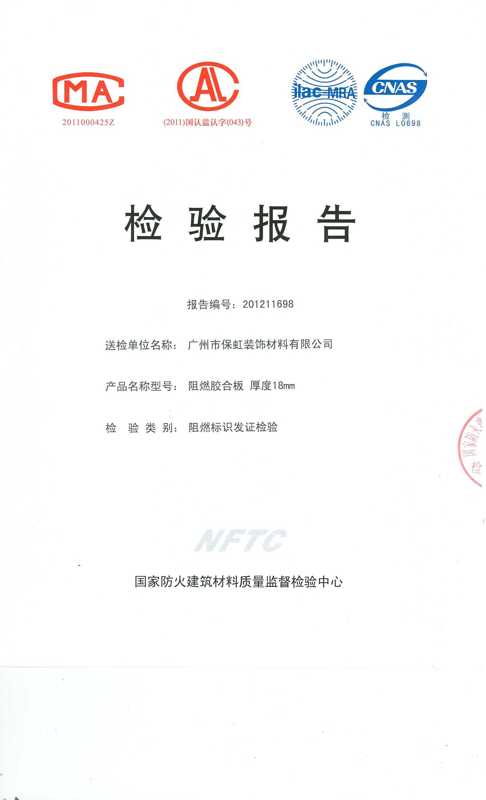 经检验,该厚度18mm的阻燃胶合板燃烧性能符合GB 20286-2006规定的B-s1,d0,t1级要求。 按GB 20286-2006判定,该制品燃烧性能符合公共场所使用的阻燃建筑制品的规定要求。(以下空白)