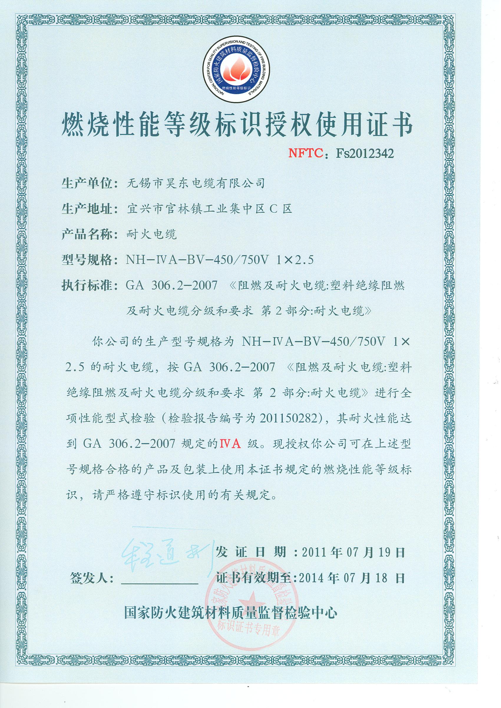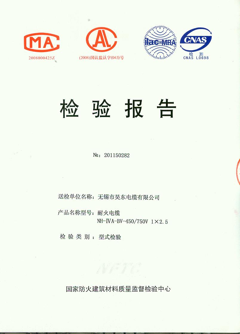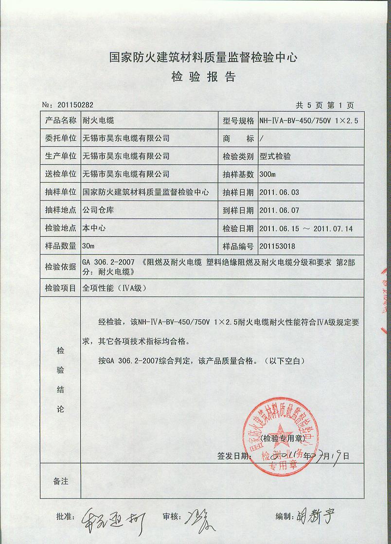 经检验,该NH-ⅣA-BV-450/750V 1×2.5耐火电缆耐火性能符合ⅣA级规定要求,其它各项技术指标均合格。按GA 306.2-2007综合判定,该产品质量合格。(以下空白)