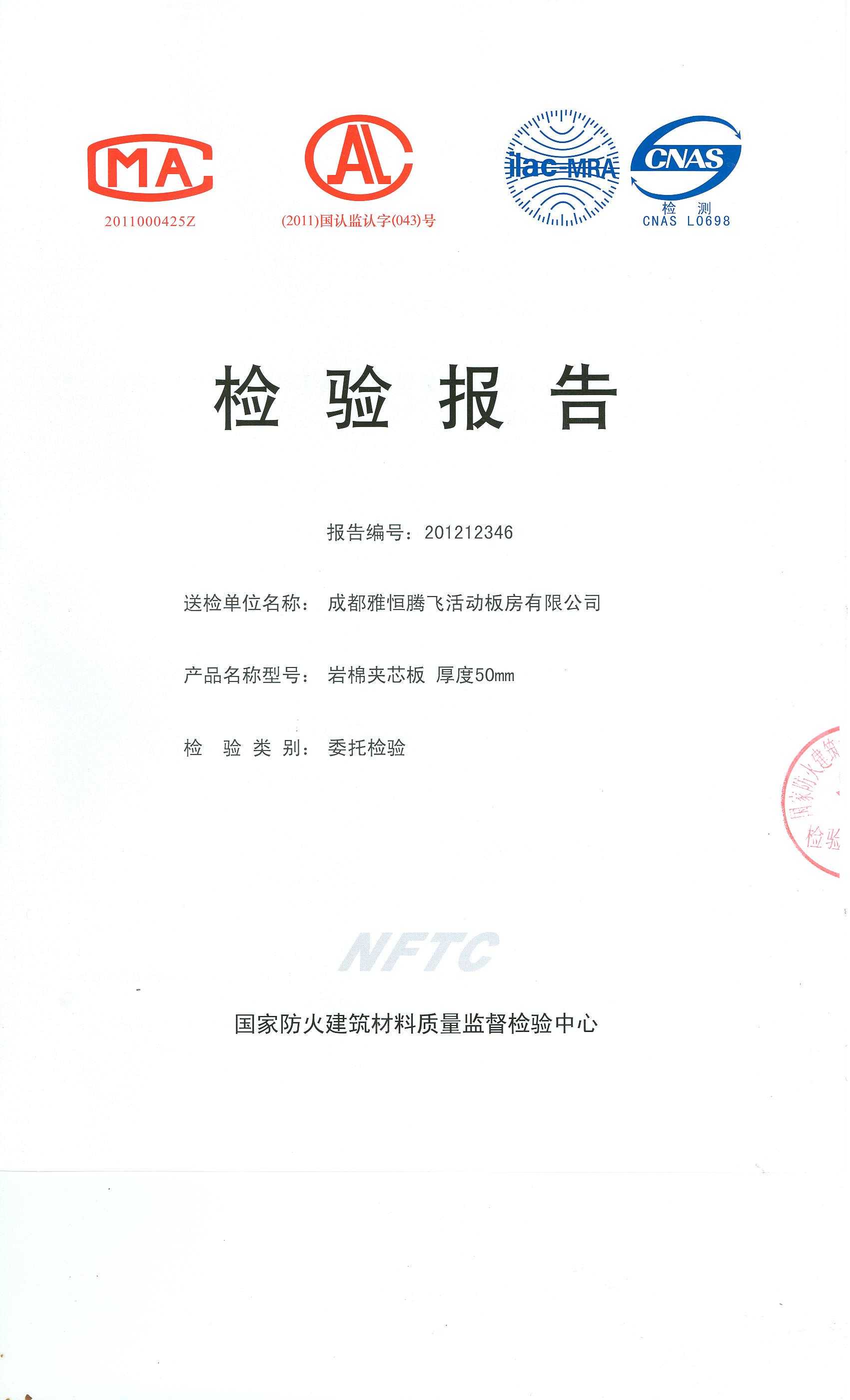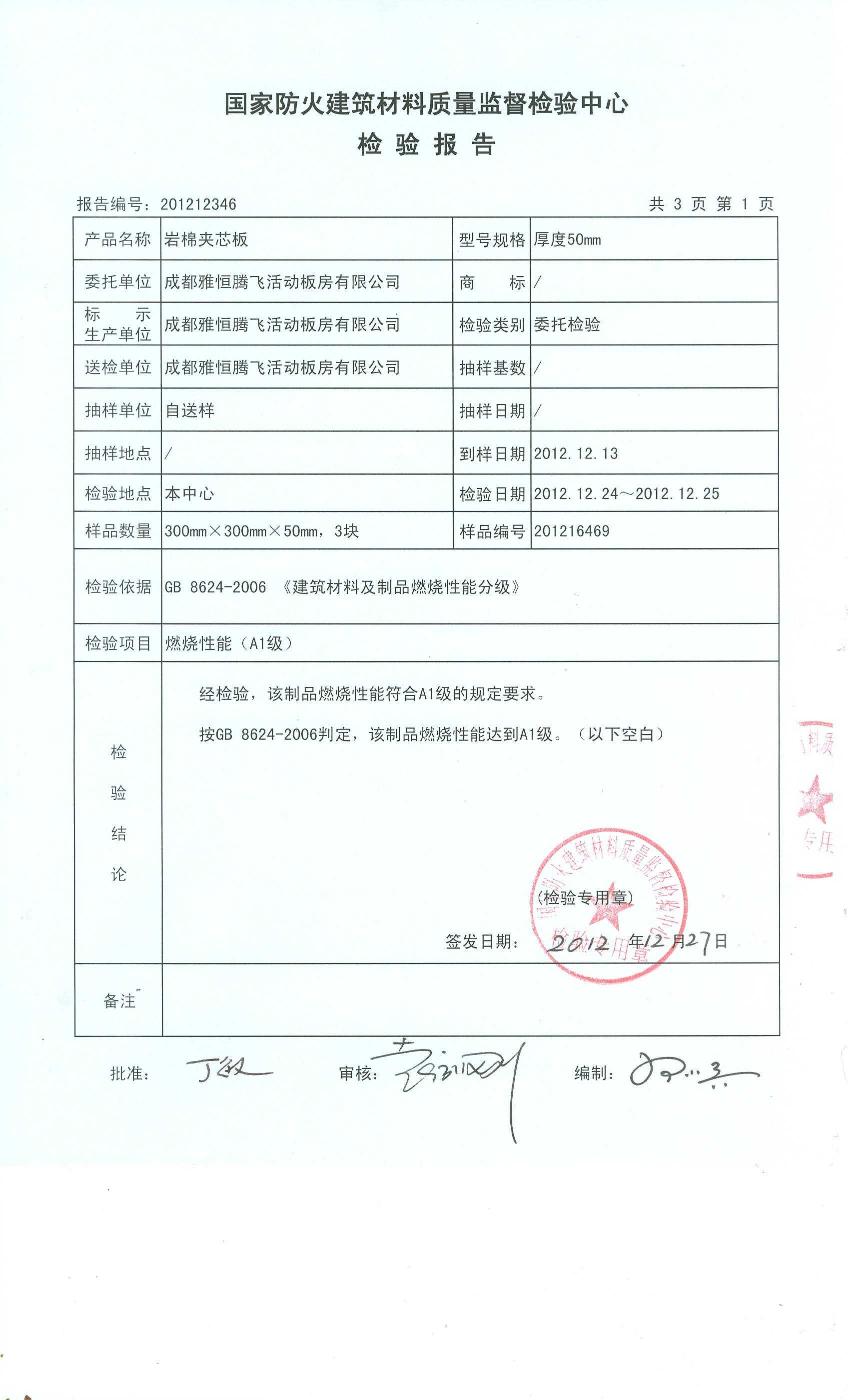 经检验,该制品燃烧性能符合A1级的规定要求。 按GB 8624-2006判定,该制品燃烧性能达到A1级。(以下空白)