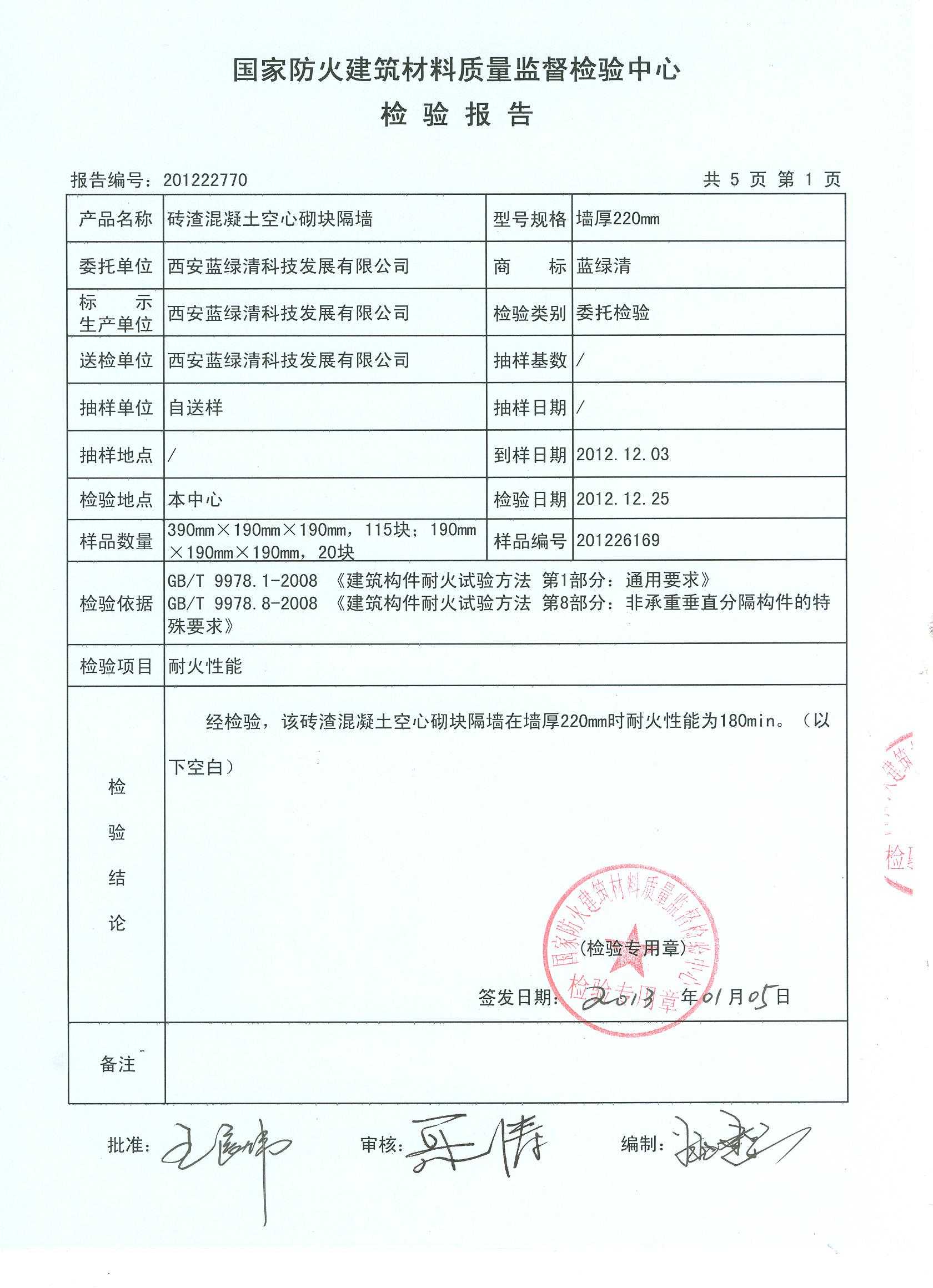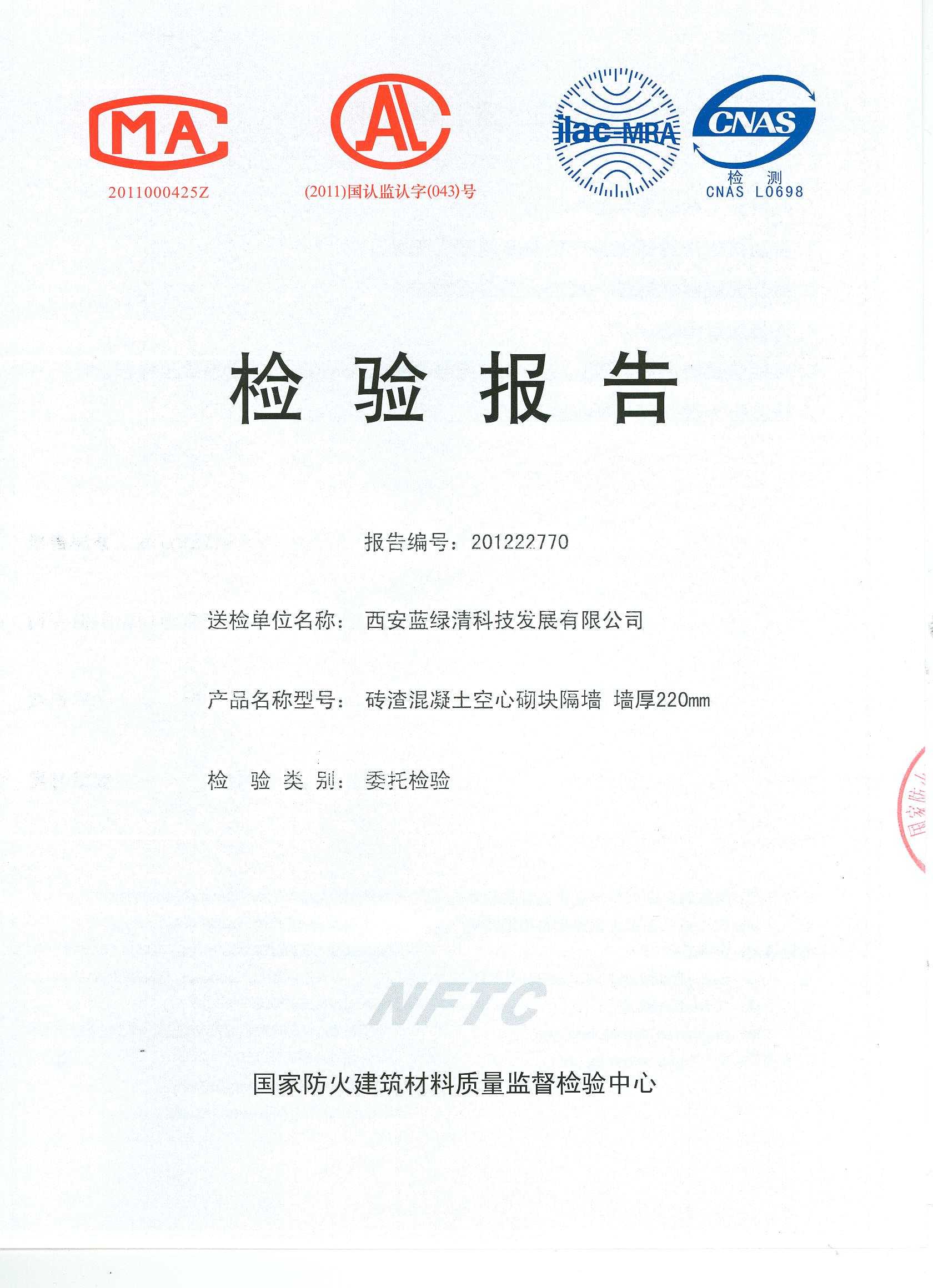 经检验,该砖渣混凝土空心砌块隔墙在墙厚220mm时耐火性能为180min。(以下空白)