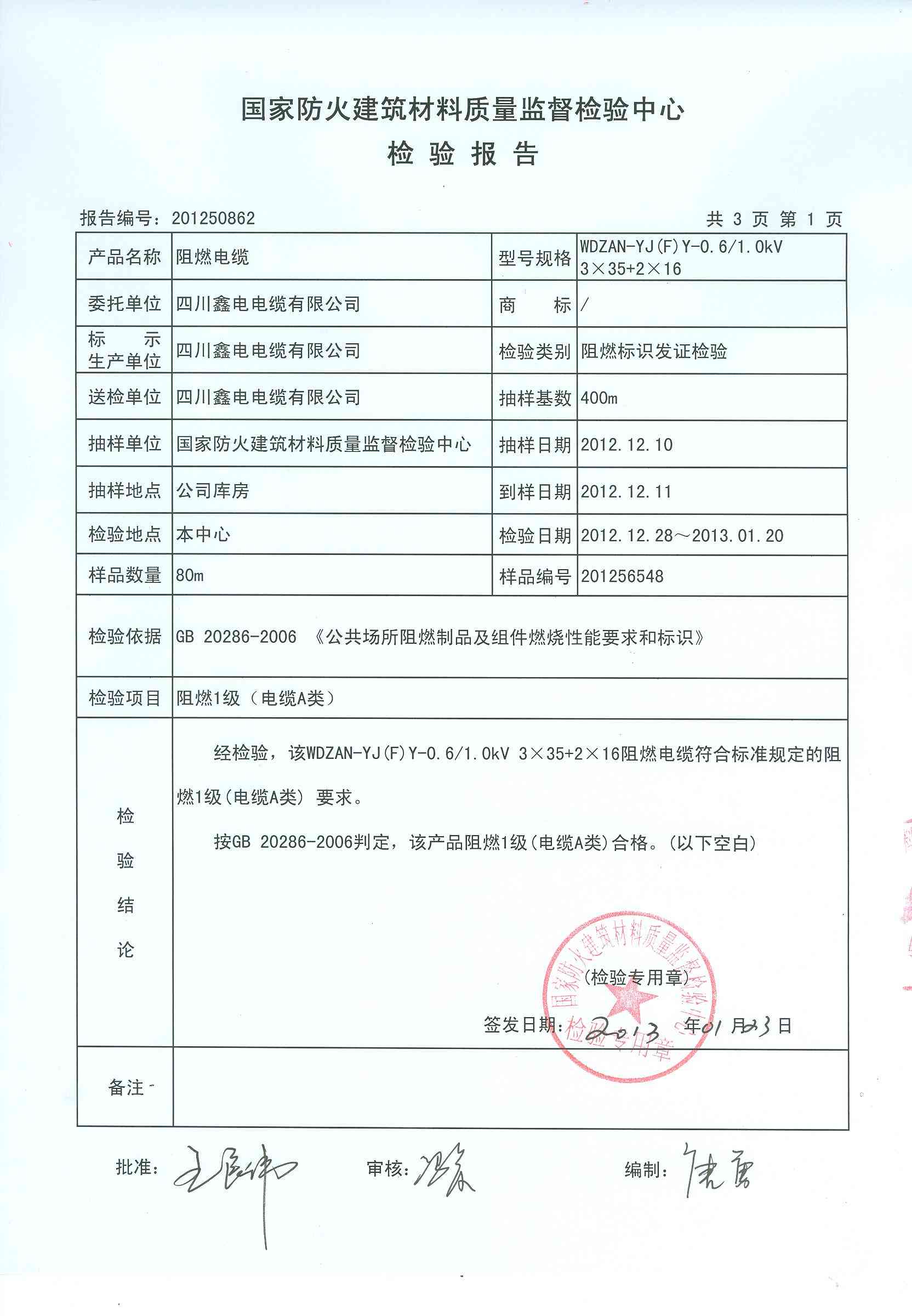 经检验,该WDZAN-YJ(F)Y-0.6/1.0kV 3×35+2×16阻燃电缆符合标准规定的阻燃1级(电缆A类) 要求。 按GB 20286-2006判定,该产品阻燃1级(电缆A类)合格。(以下空白)