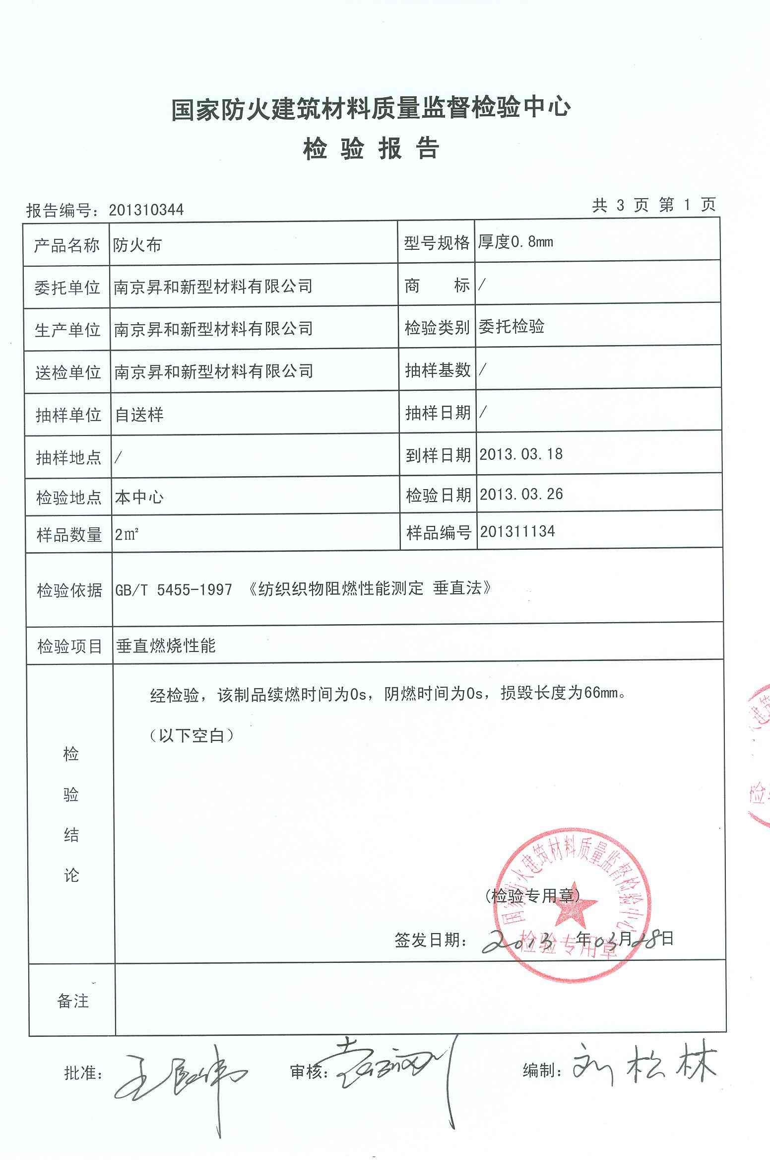 经检验,该制品续燃时间为0s,阴燃时间为0s,损毁长度为66mm。 (以下空白)