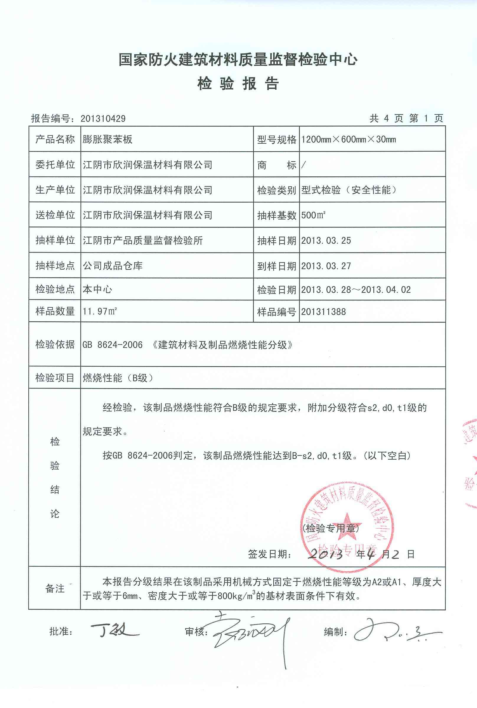 经检验,该制品燃烧性能符合B级的规定要求,附加分级符合s2,d0,t1级的 规定要求。 按GB 8624-2006判定,该制品燃烧性能达到B-s2,d0,t1级。(以下空白)