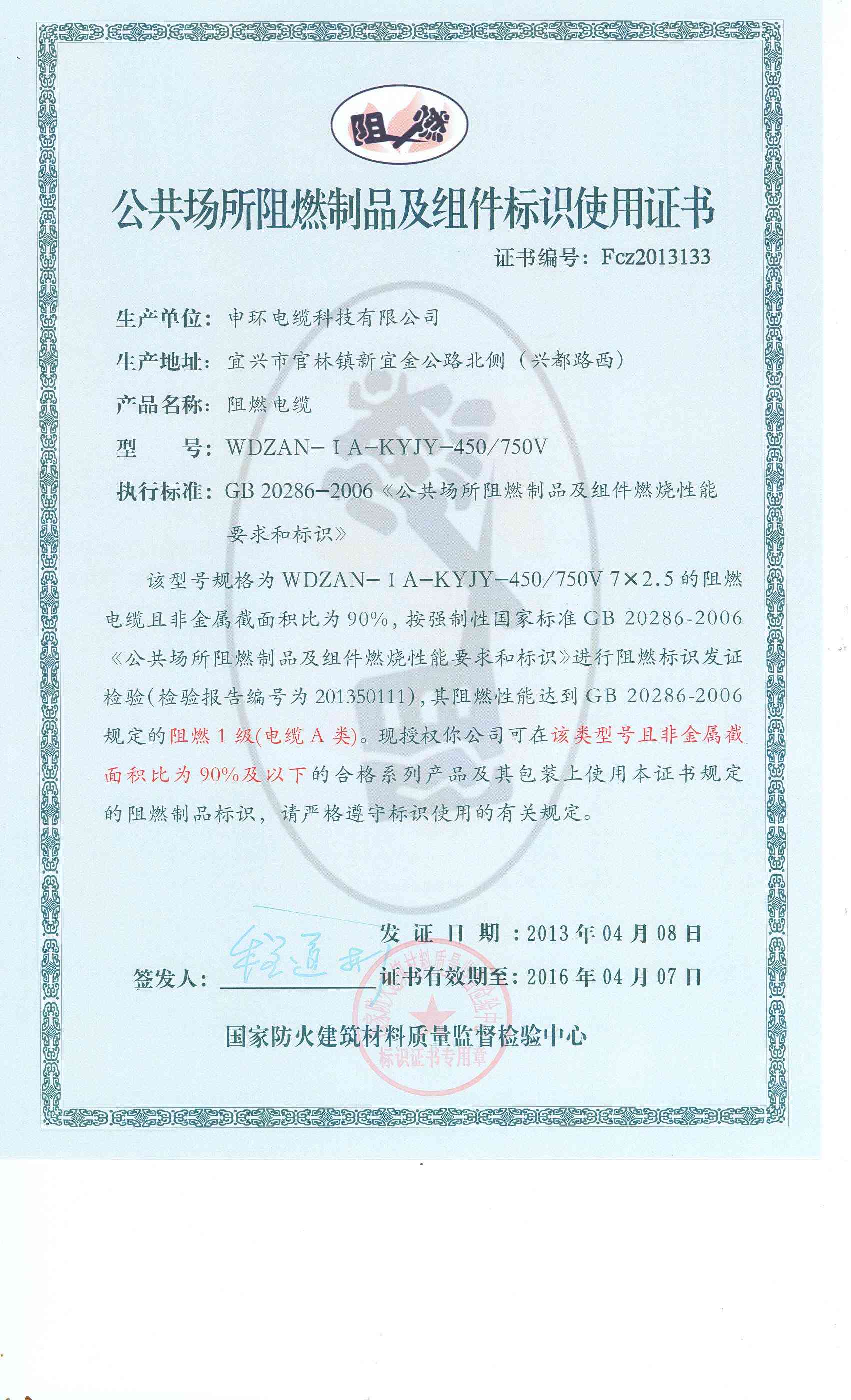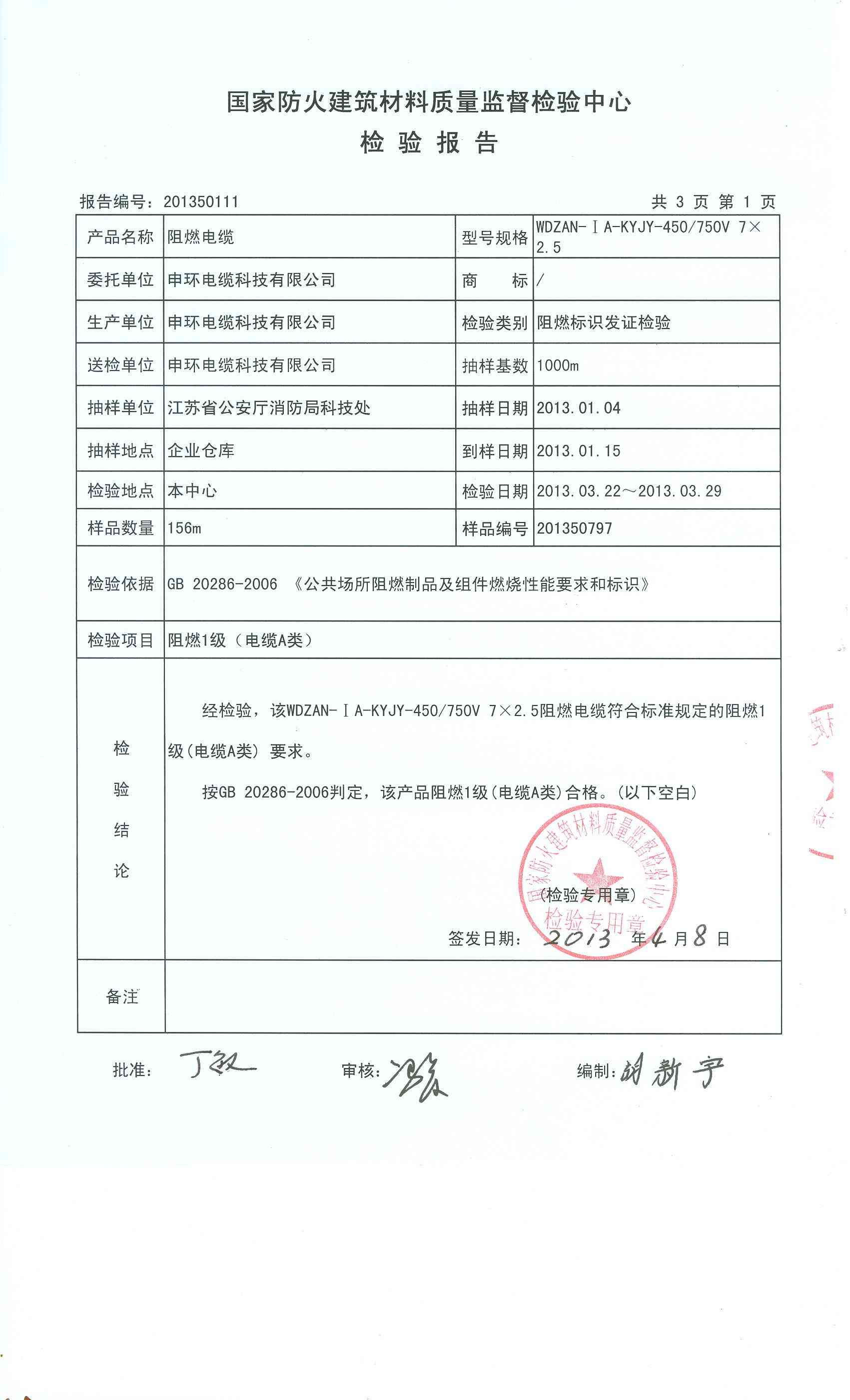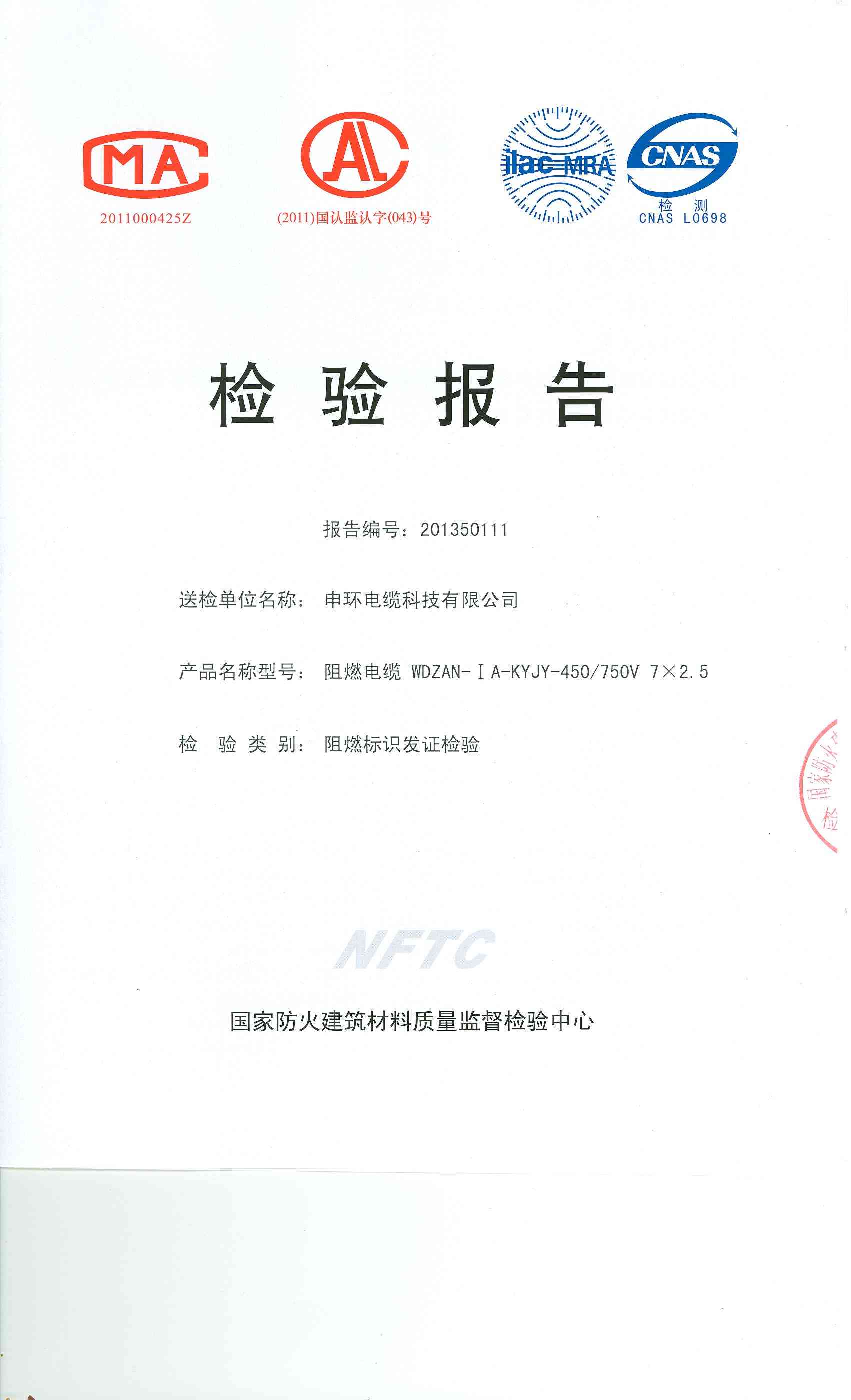 经检验,该WDZAN-ⅠA-KYJY-450/750V 7×2.5阻燃电缆符合标准规定的阻燃1级(电缆A类) 要求。 按GB 20286-2006判定,该产品阻燃1级(电缆A类)合格。(以下空白)