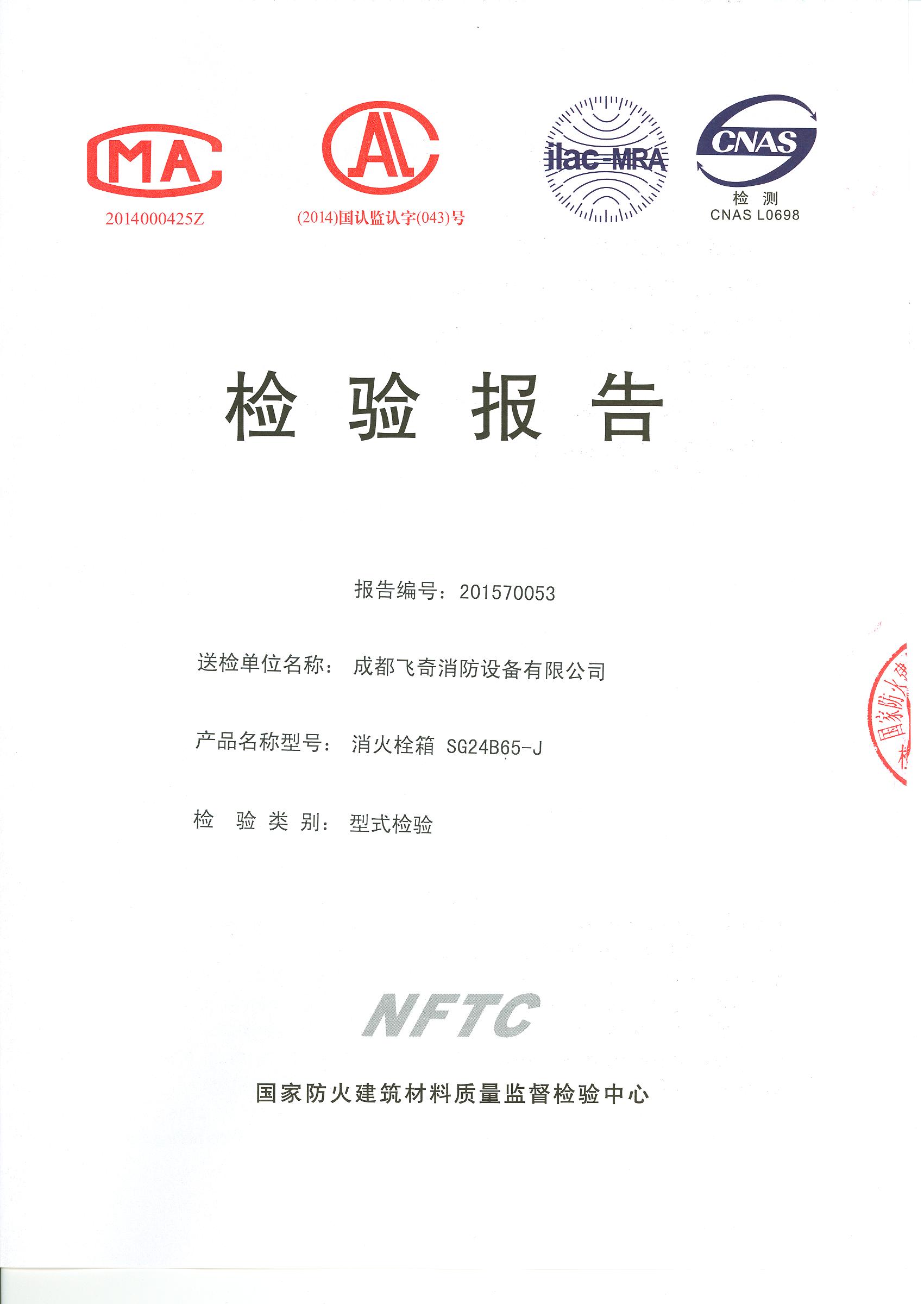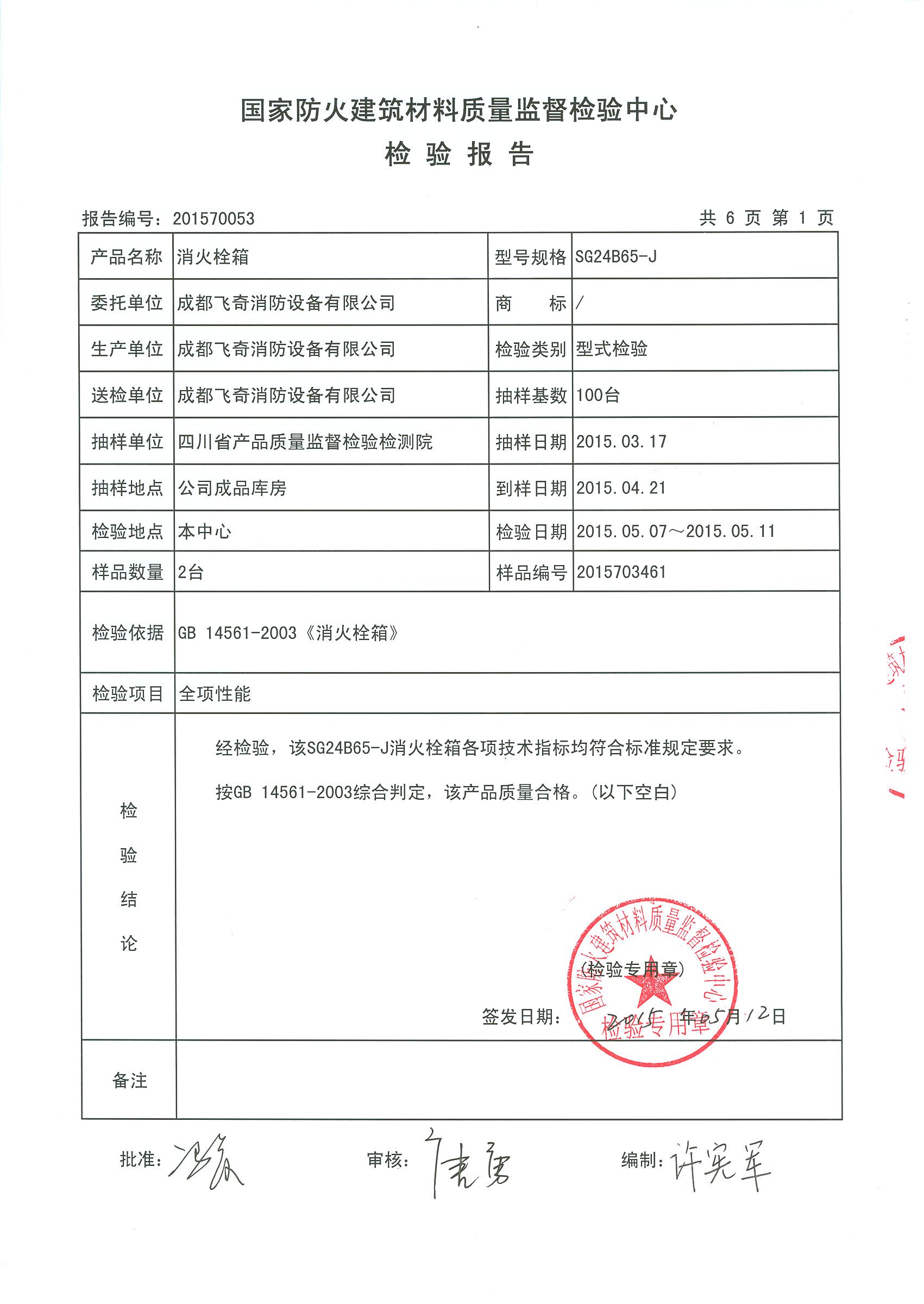 检验结论:经检验,该SG24B65-J消火栓箱各项技术指标均符合标准规定要求。 按GB 14561-2003综合判定,该产品质量合格。(以下空白)