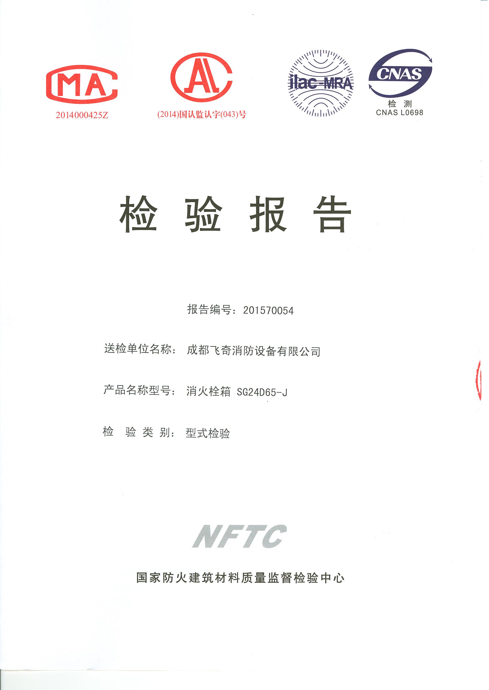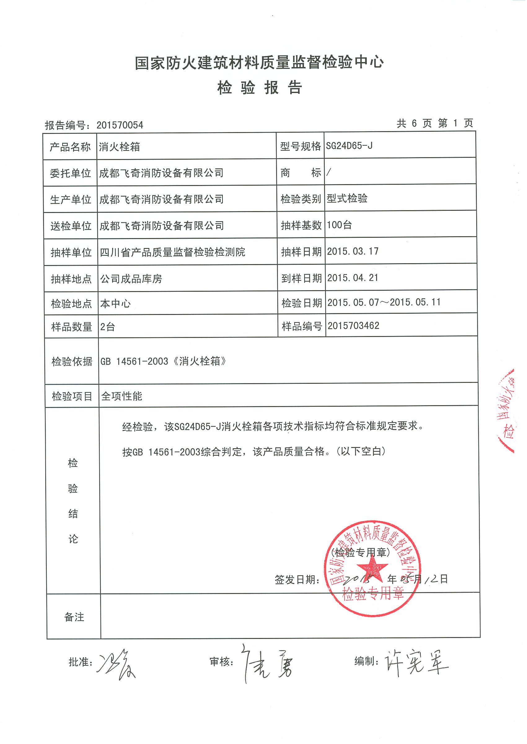检验结论:经检验,该SG24D65-J消火栓箱各项技术指标均符合标准规定要求。 按GB 14561-2003综合判定,该产品质量合格。(以下空白)