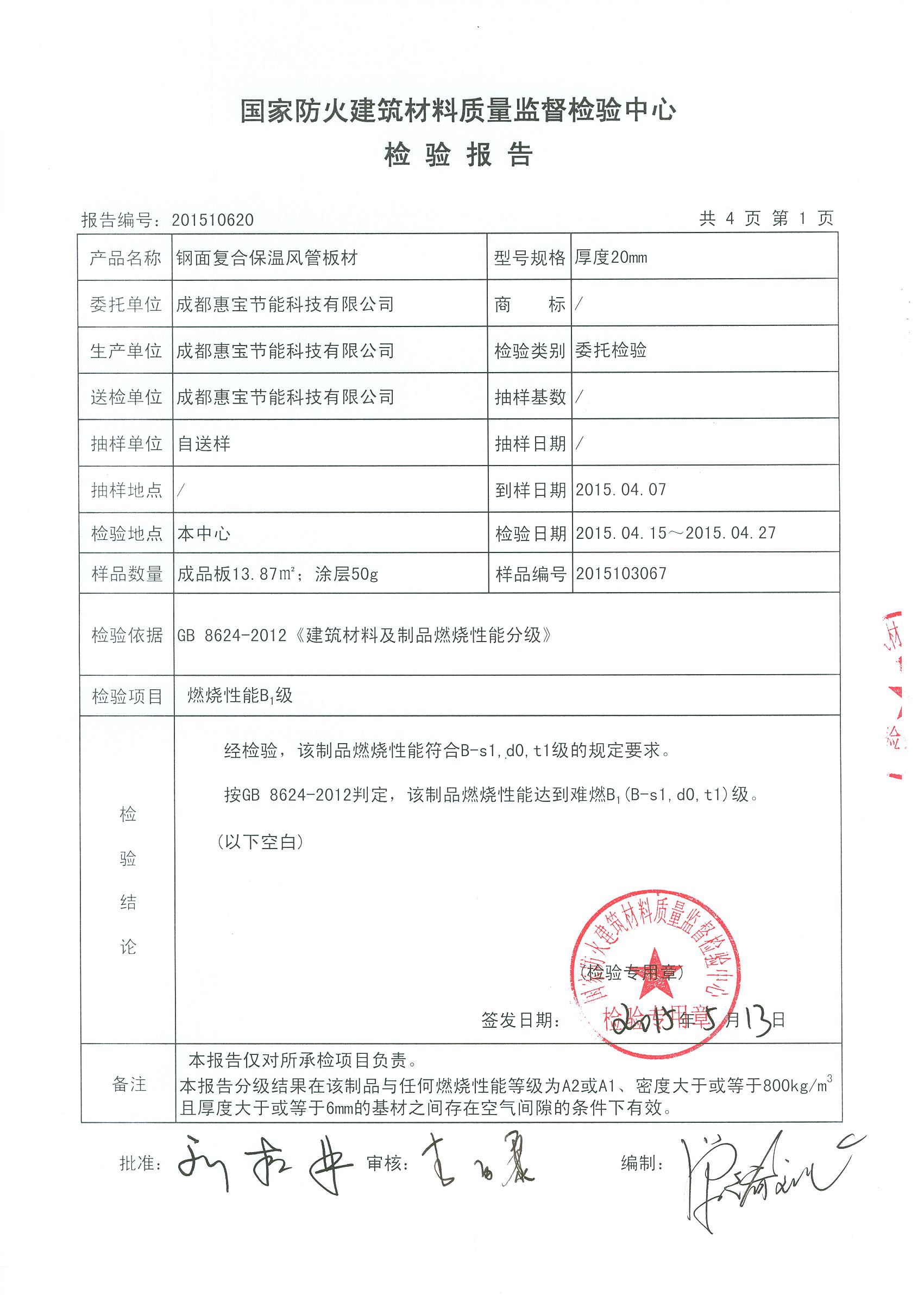 检验结论:经检验,该制品燃烧性能符合B-s1,d0,t1级的规定要求。 按GB 8624-2012判定,该制品燃烧性能达到难燃B_(1)(B-s1,d0,t1)级。 (以下空白)