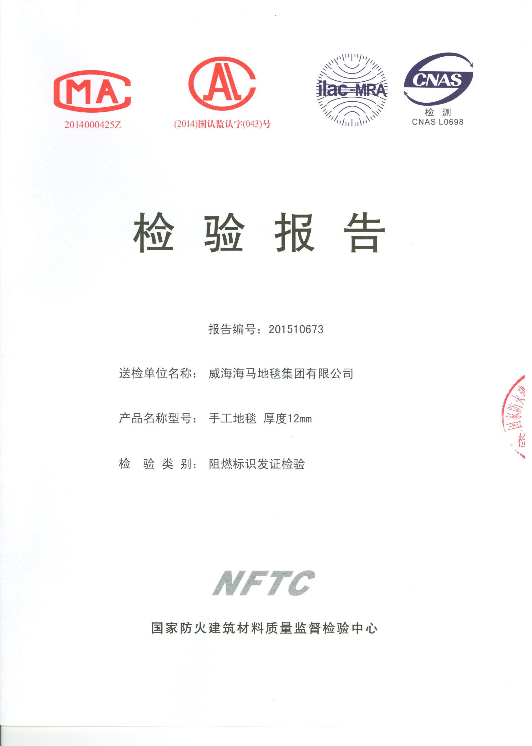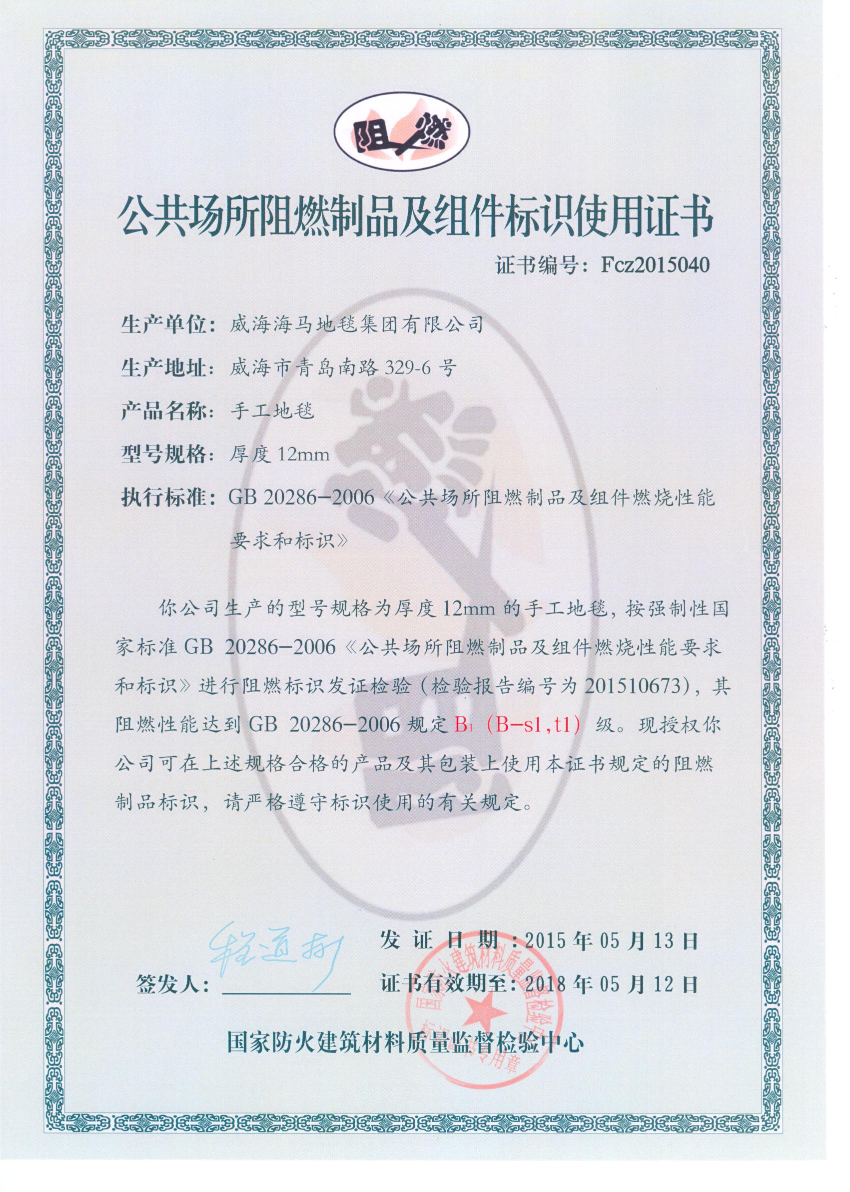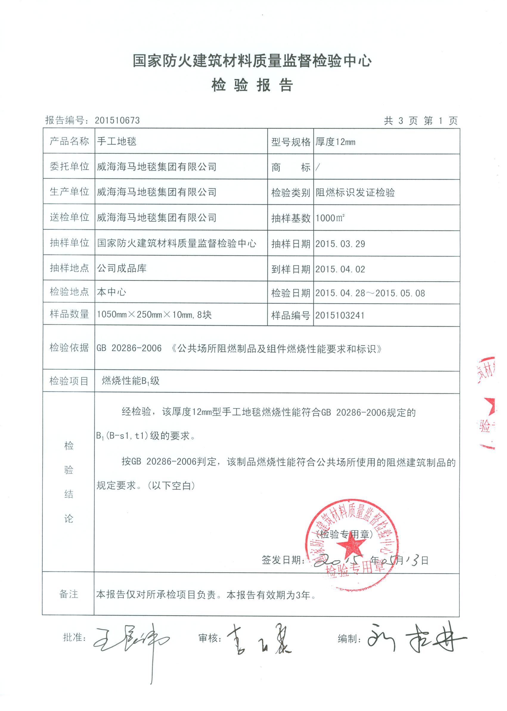 检验结论:经检验,该厚度12mm型手工地毯燃烧性能符合GB 20286-2006规定的B_(1)(B-s1,t1)级的要求。 按GB 20286-2006判定,该制品燃烧性能符合公共场所使用的阻燃建筑制品的规定要求。(以下空白)